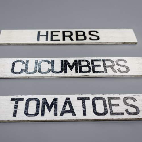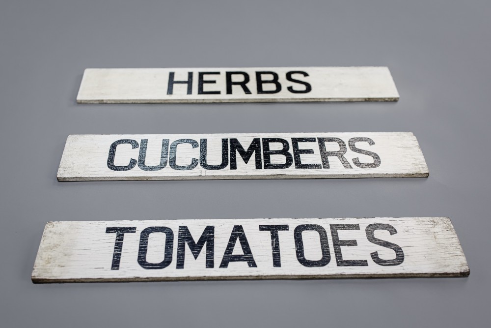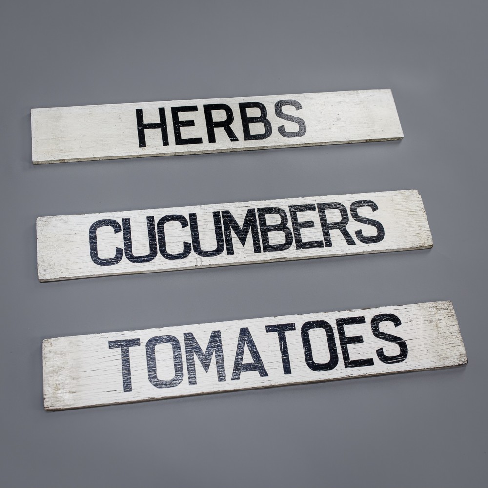 Stock Number: 2559Trio of late 20th century Farm shop advertising signs, painted timber, light weathering. Cucumbers, Herbs and Tomatoes. England last quarter of 20th Century. Priced as a trio.