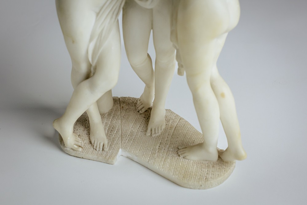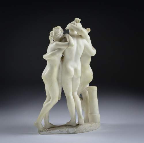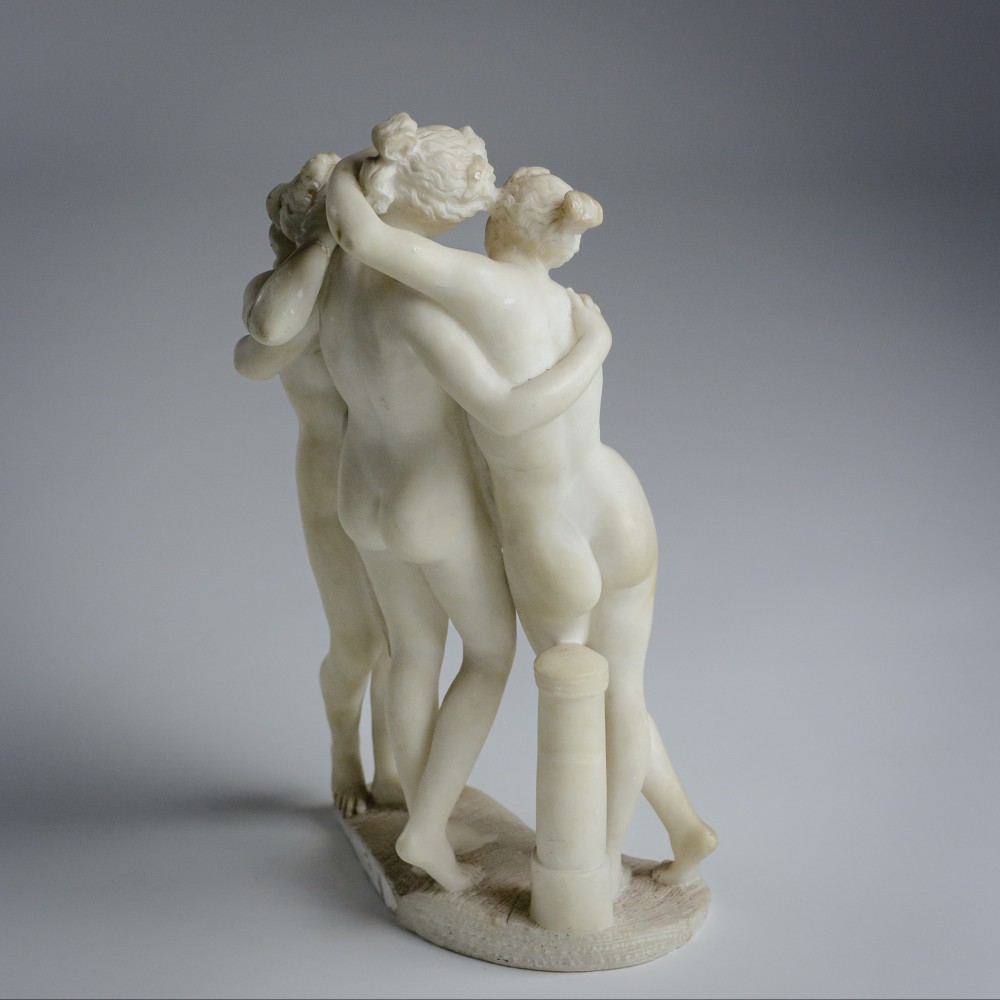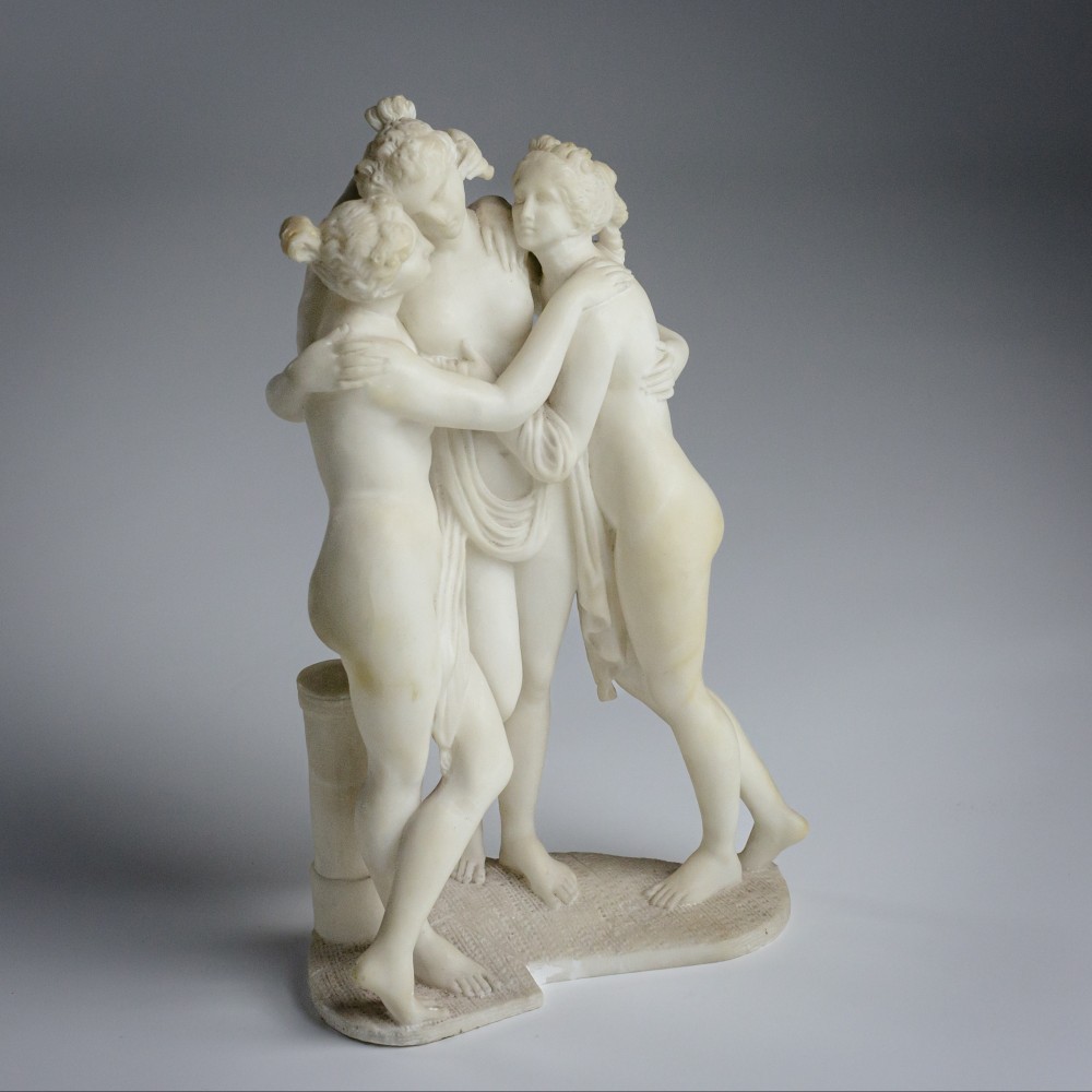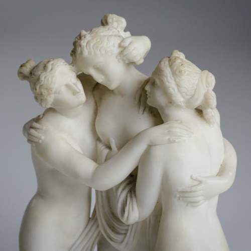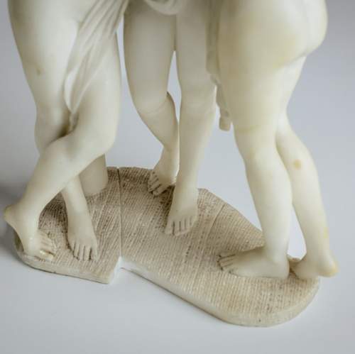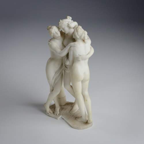 Stock Number: 4515The Three Graces depicts the three daughters of Zeus, Euphrosyne, Aglaea and Thalia. Godesses of beauty, charm and joy. Shown standing close together, nude or as in this example lightly draped their bodies entwined in graceful embrace symbolising unity, love and harmony. Originating in classical Greek and Roman art the composition became beloved during the Renaissance and Neoclassical periods. Carved Marble, Early 20th Century. Condition commensurate with age. minor nibbles & discolouration. Italy.