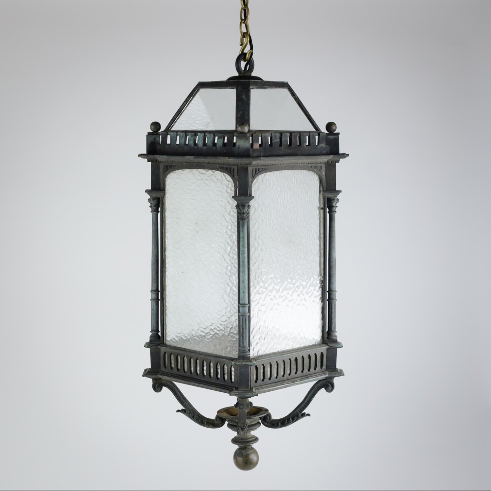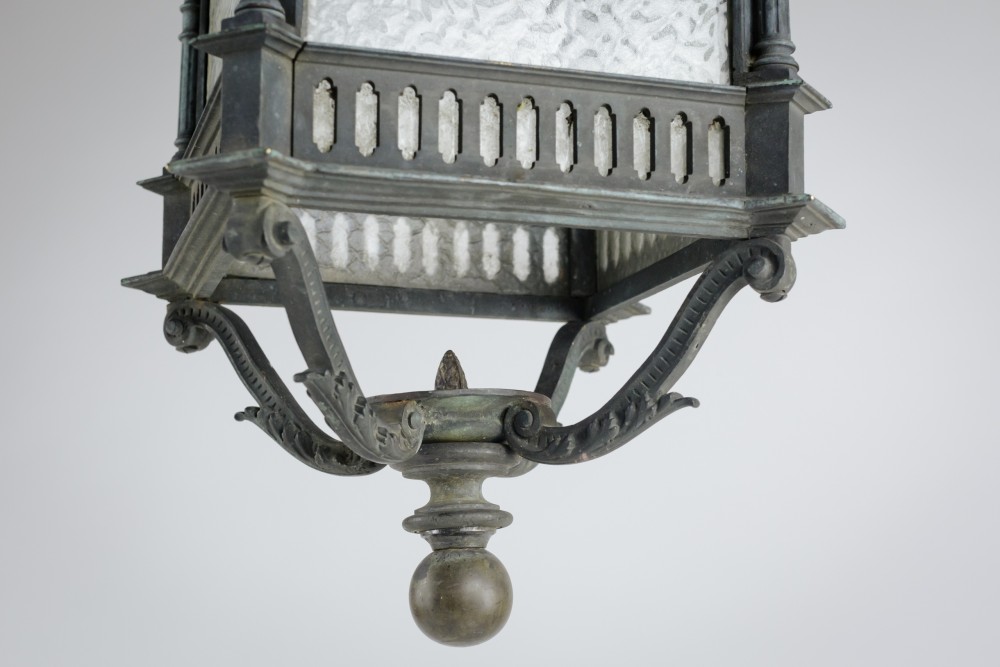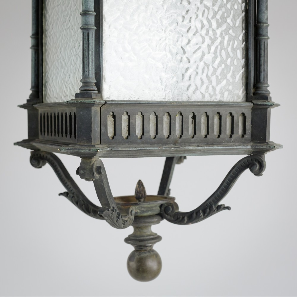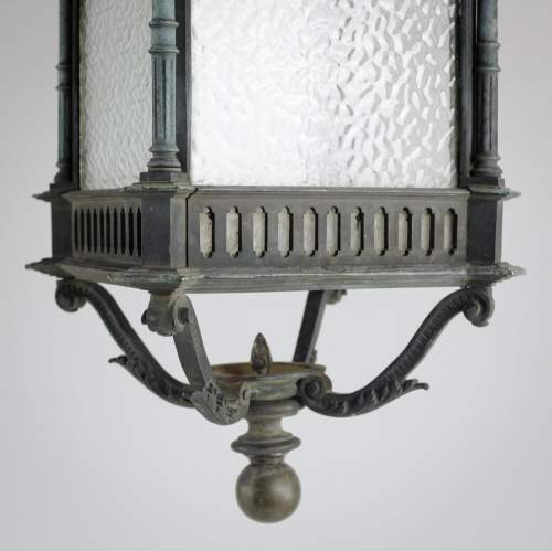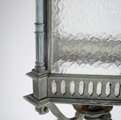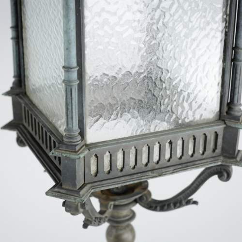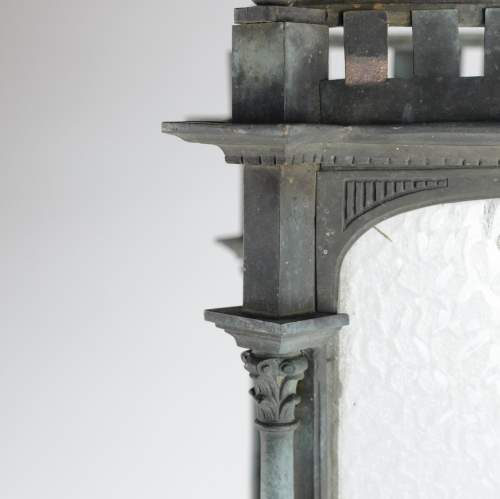 Stock Number: 4487A distinguished and substantial bronze lantern of impressive scale, finely cast and exhibiting exceptional architectural detail. The rectangular body is framed by four elegant Corinthian columns rising to a crisply molded cornice, the whole enriched with refined neoclassical and Gothic-inspired ornamentation. The surface displays a soft, naturally developed verdigris patina, lending the piece both depth of character and a pleasingly aged appearance. The lantern's restrained yet authoritative form suggests a commission for a grand architectural setting-possibly a civic building or townhouse entrance-where it would have served both a functional and decorative role. The craftsmanship is of a notably high standard, with sharply defined edges, well-proportioned elements, and a weight that speaks to the quality of the casting. This is a superb example of early twentieth-century decorative metalwork, marrying strength and elegance in equal measure. Its classical proportions and distinguished patina make it highly suitable for use as a statement architectural feature, whether incorporated into a period restoration or repurposed within a refined contemporary interior. A lantern of rare presence and enduring appeal. Early 20th Century England. Rewired & PAT tested.