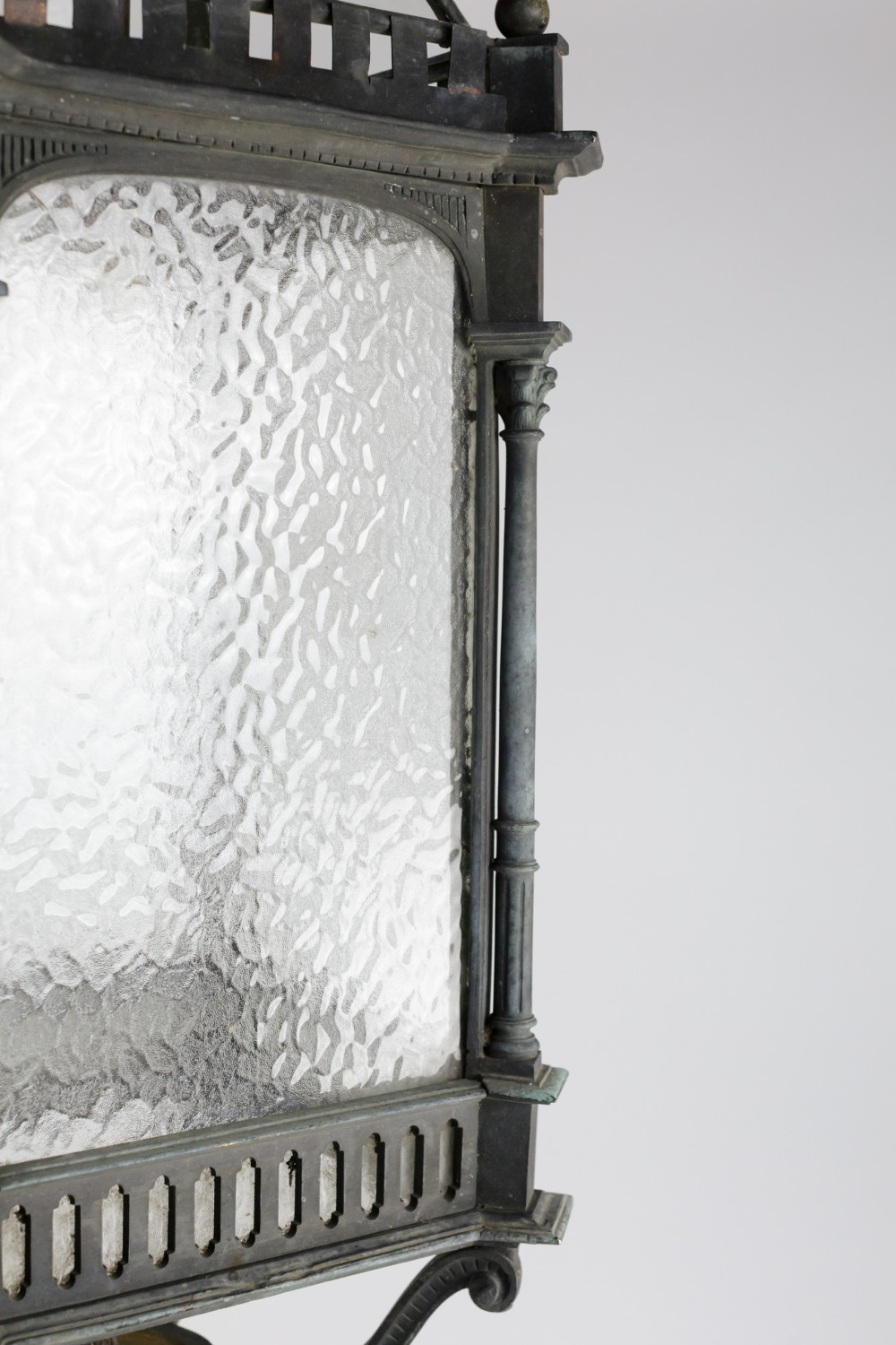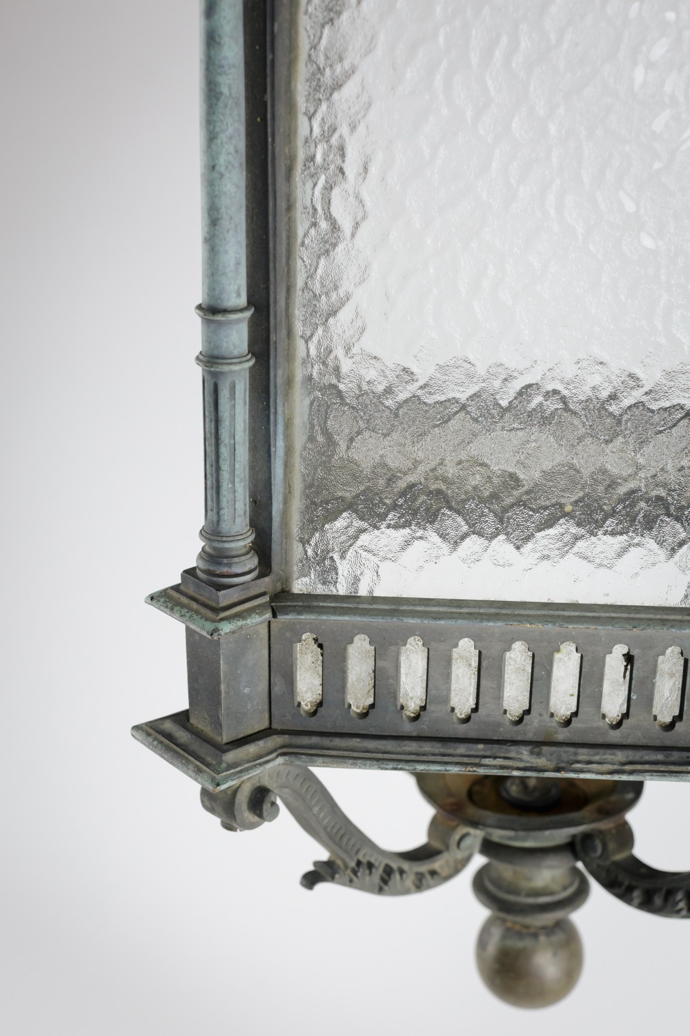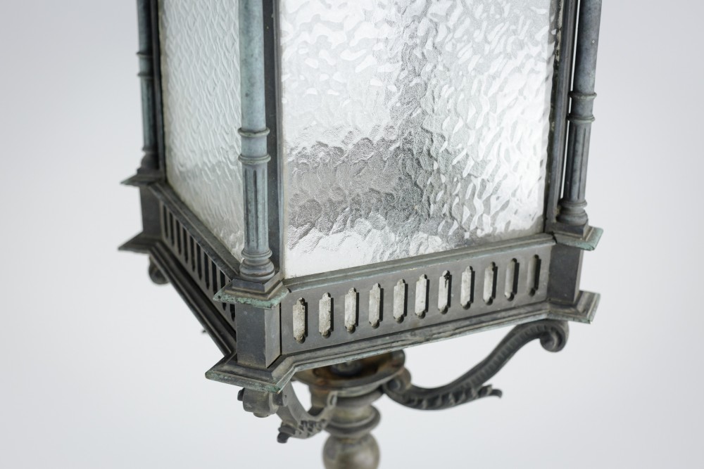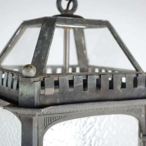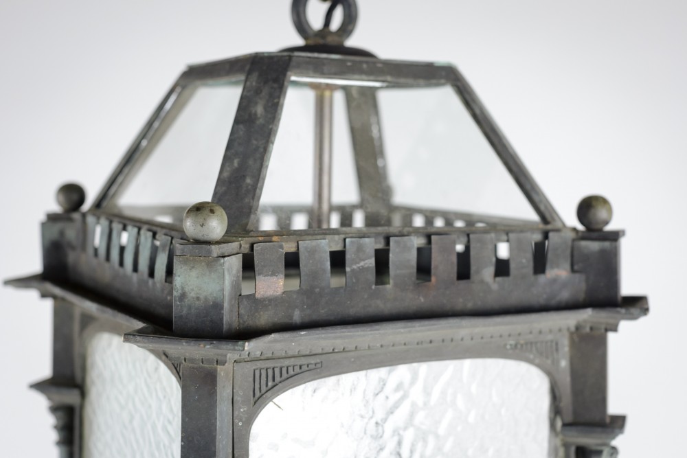 Stock Number: 4487A distinguished and substantial bronze lantern of impressive scale, finely cast and exhibiting exceptional architectural detail. The rectangular body is framed by four elegant Corinthian columns rising to a crisply molded cornice, the whole enriched with refined neoclassical and Gothic-inspired ornamentation. The surface displays a soft, naturally developed verdigris patina, lending the piece both depth of character and a pleasingly aged appearance. The lantern's restrained yet authoritative form suggests a commission for a grand architectural setting-possibly a civic building or townhouse entrance-where it would have served both a functional and decorative role. The craftsmanship is of a notably high standard, with sharply defined edges, well-proportioned elements, and a weight that speaks to the quality of the casting. This is a superb example of early twentieth-century decorative metalwork, marrying strength and elegance in equal measure. Its classical proportions and distinguished patina make it highly suitable for use as a statement architectural feature, whether incorporated into a period restoration or repurposed within a refined contemporary interior. A lantern of rare presence and enduring appeal. Early 20th Century England. Rewired & PAT tested.