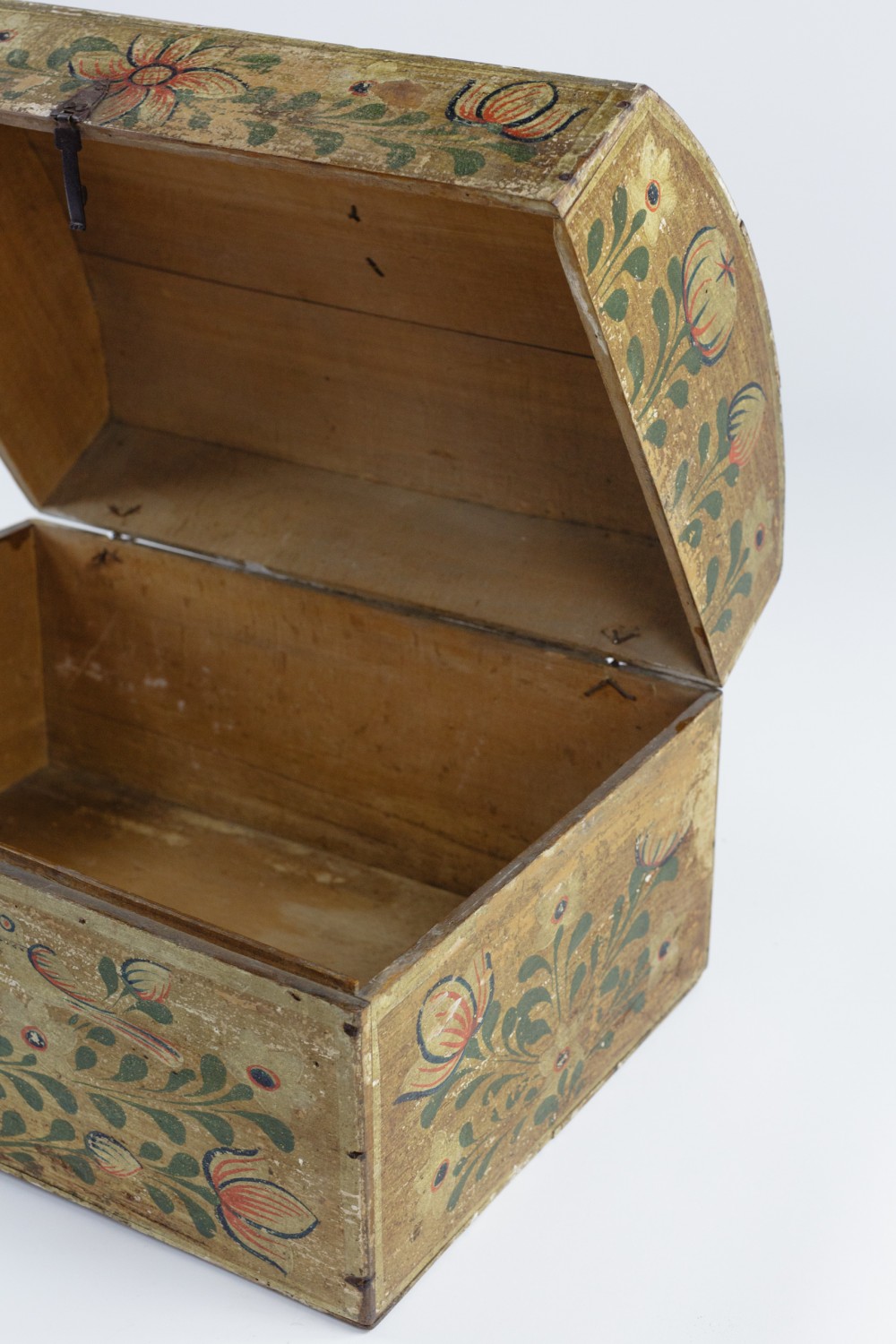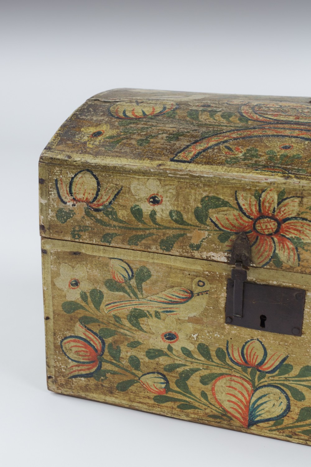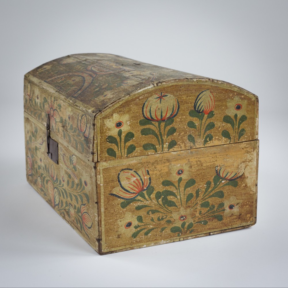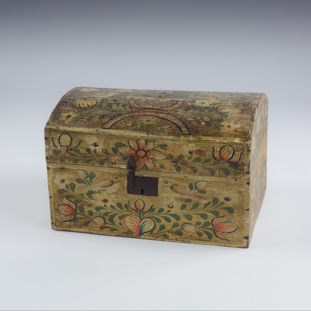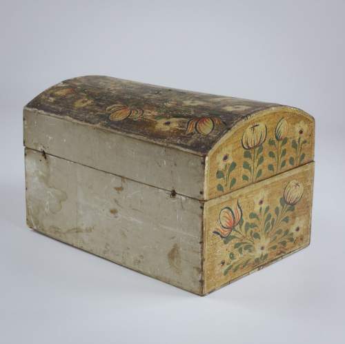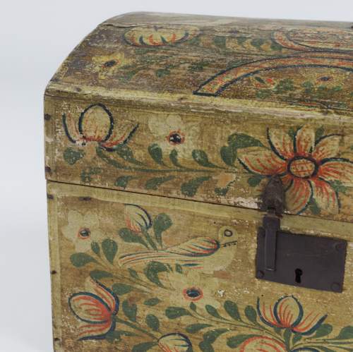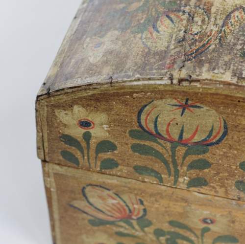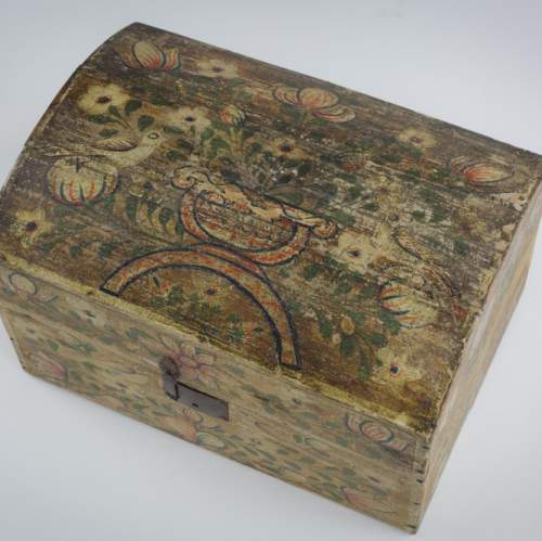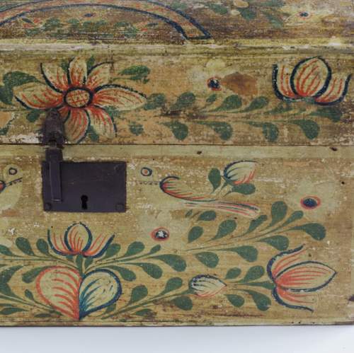 Stock Number: 4493Normandy Marriage Chest France Early 19th Century. Painted Pine This painted pine Coffre de Mariage was traditionally given to a bride in Normandy to hold her precious items. Decorated with painted floral motifs often including hearts and birds as in this example. The chest is a celebration of Love, Fertility and domestic prosperity. These remarkable painted chests were modest in material but no less expressive in sentiment. Their vivid colour and painted decoration reflect the craftsmanship of Normandy, lasting treasures of matrimonial union. Remarkable unadulterated condition with original painted finish. Wear commensurate with age. France, Circa 1890.
