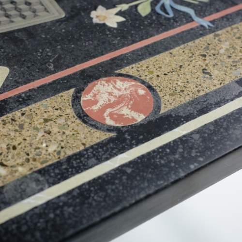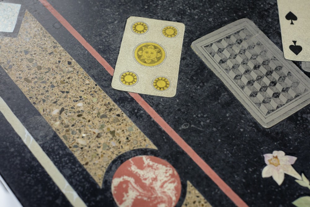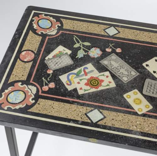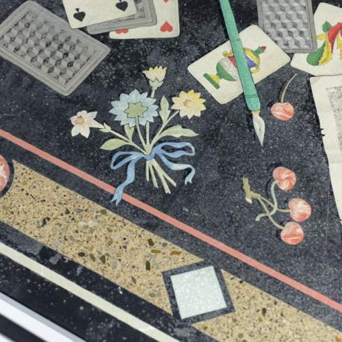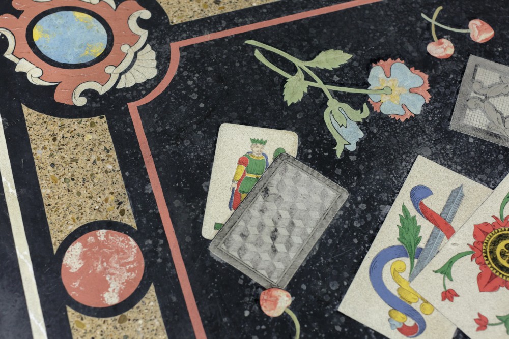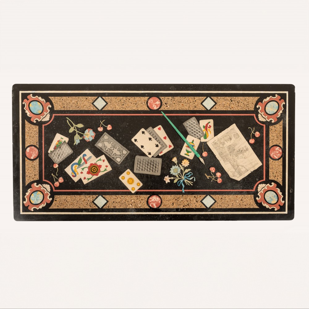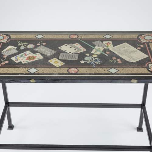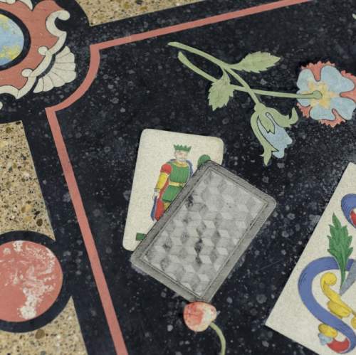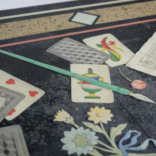 Stock Number: 4397Impressive Scagliola Trompe L'oeil Specimen Marble Table. Extraordinary workmanship with swags, flowers playing cards and a fountain pen. Along with a pen and ink drawing. A rather special touch is the impressive trompe d'oeil effect whereby each item laid on the table also has a shadow. Simply captivating. Contemporary base. Italy, Circa 1860.