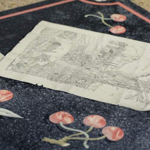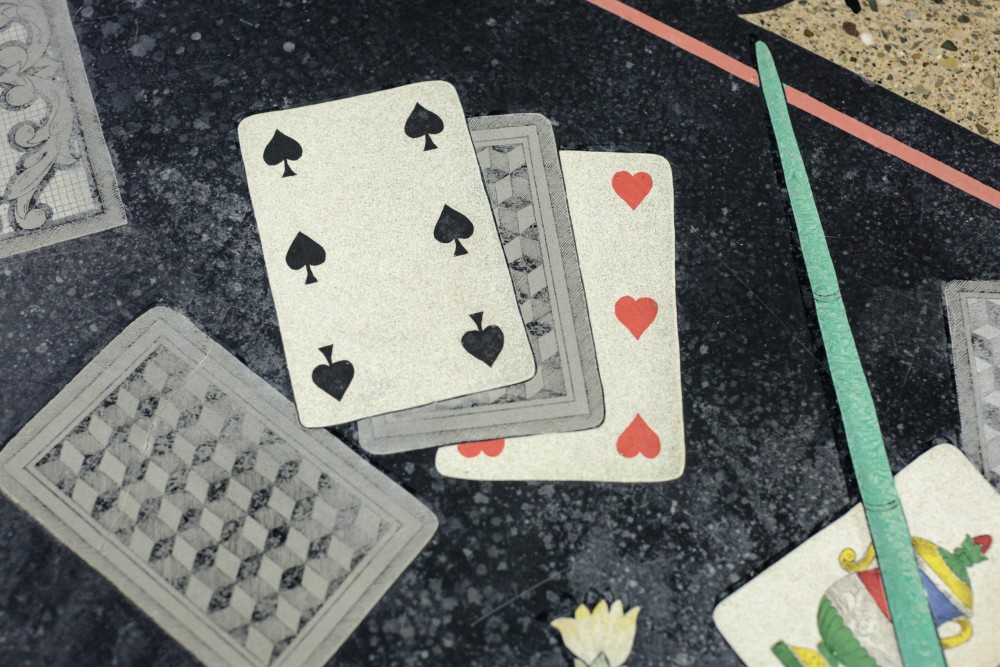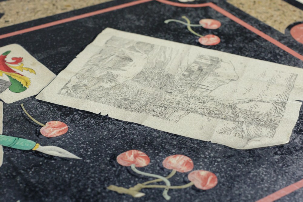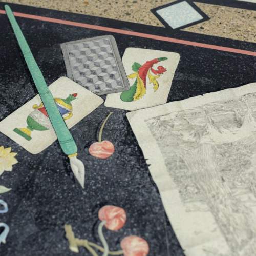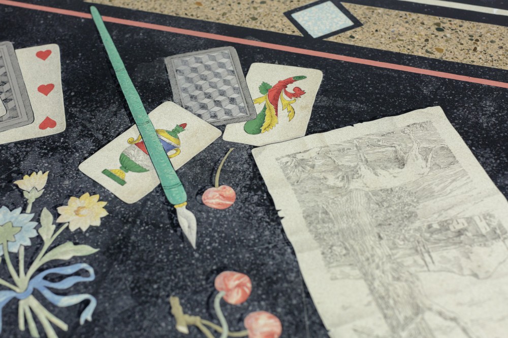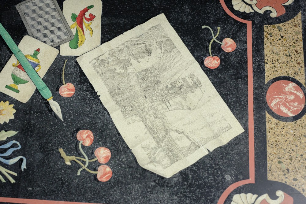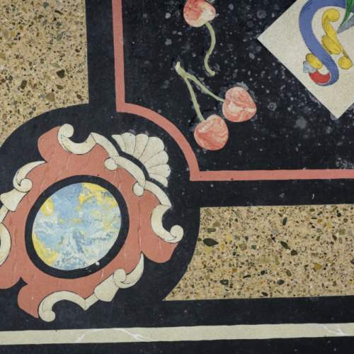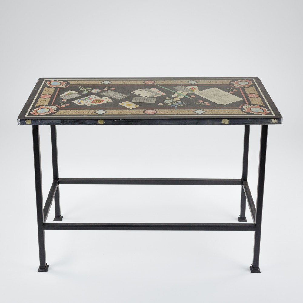 Stock Number: 4397Impressive Scagliola Trompe L'oeil Specimen Marble Table. Extraordinary workmanship with swags, flowers playing cards and a fountain pen. Along with a pen and ink drawing. A rather special touch is the impressive trompe d'oeil effect whereby each item laid on the table also has a shadow. Simply captivating. Contemporary base. Italy, Circa 1860.