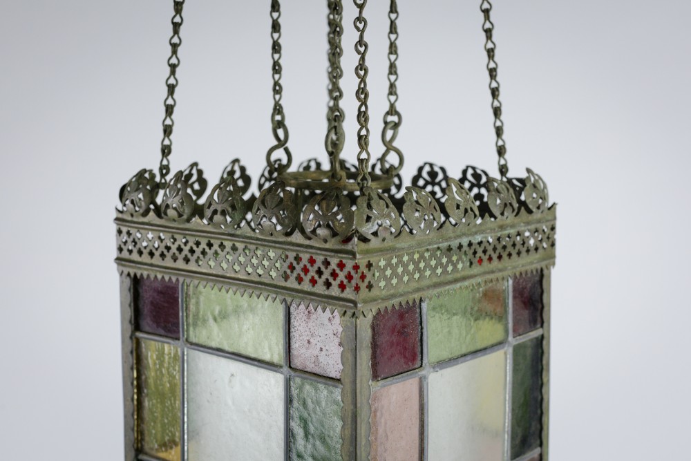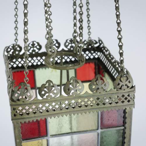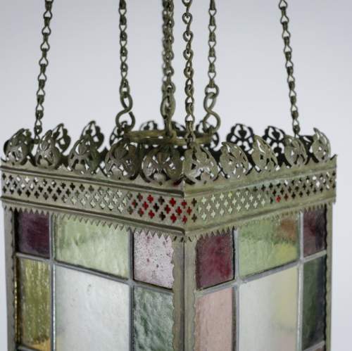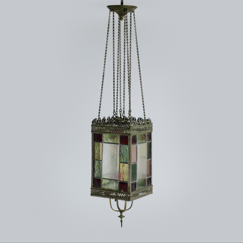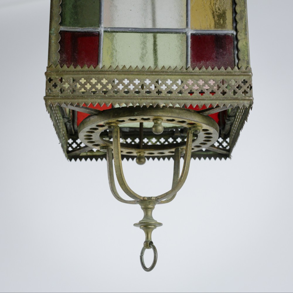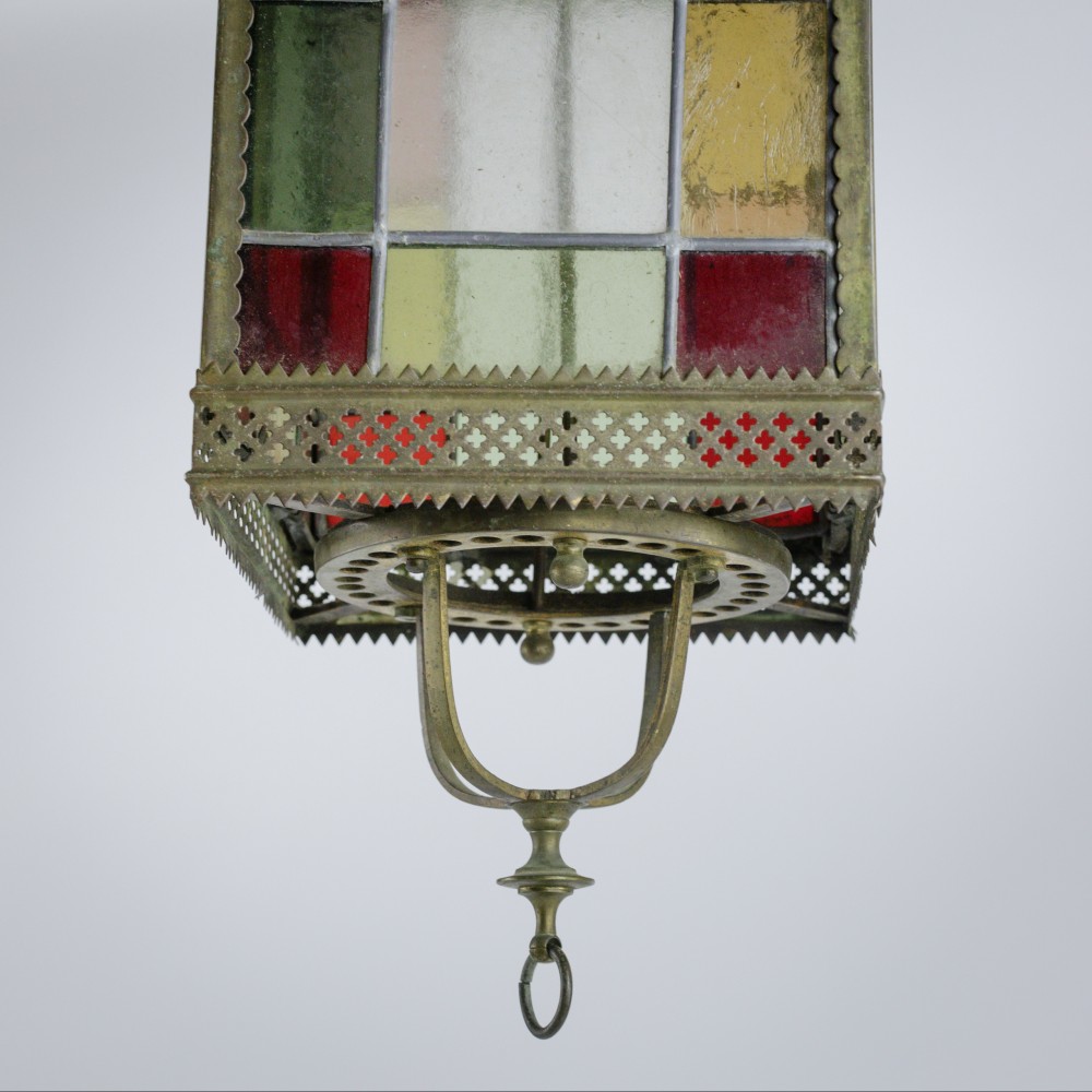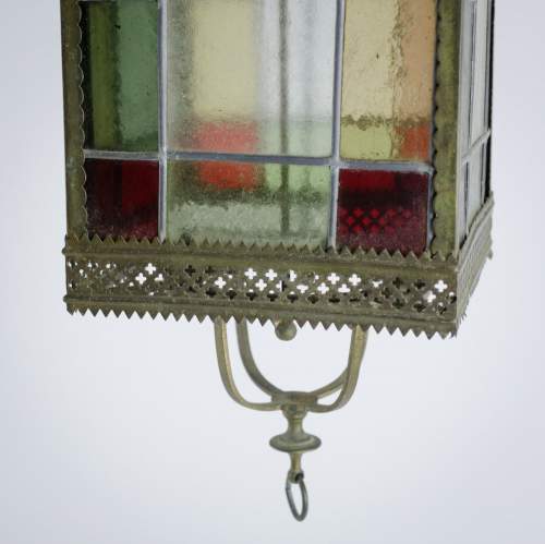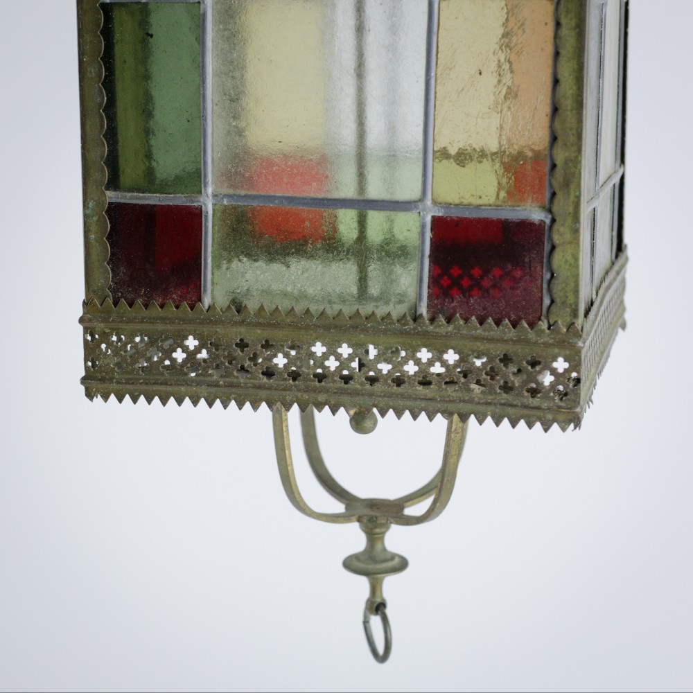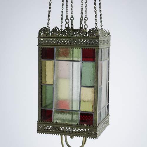 Stock Number: 448919th Century Stained Glass Hall Lantern. Late 19th Century Rise and Fall Stained Glass Hall Lantern. Originally for oil lighting, now wired for electricity, preserving the rise and fall mechanism this can be fixed to one position if required. Leaded stain glass panels. As expected wear and patination. England, Circa 1890.