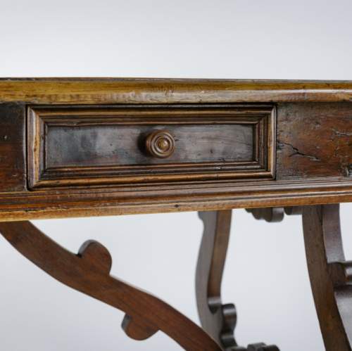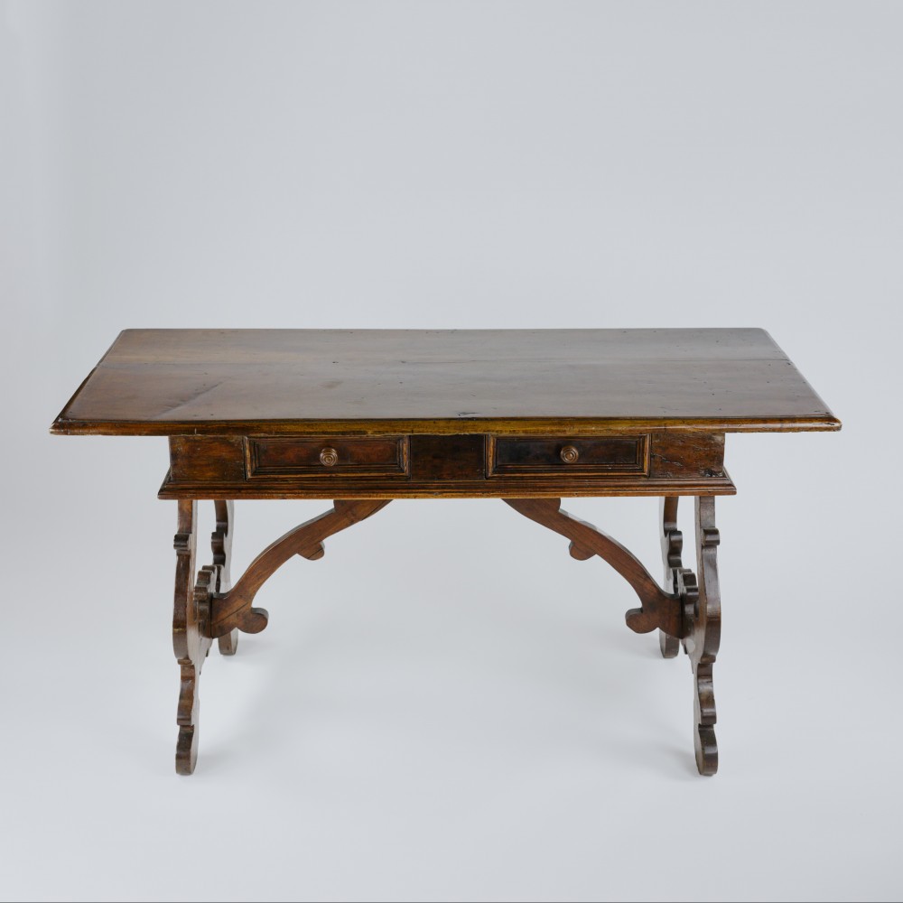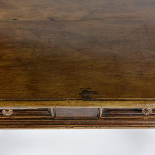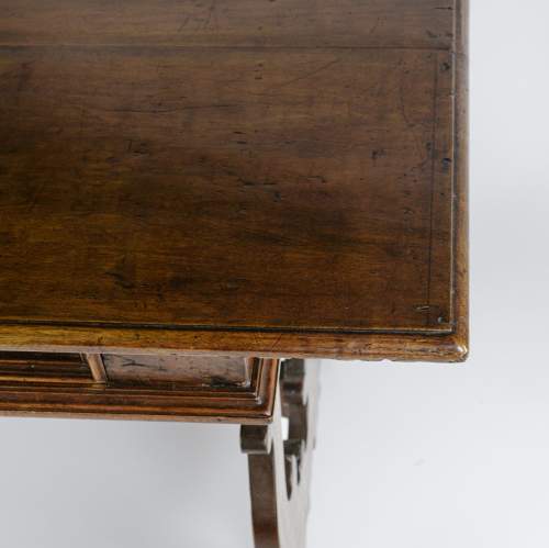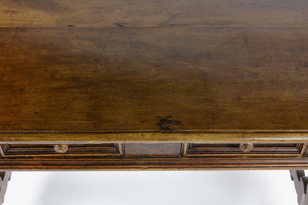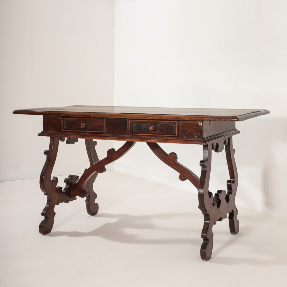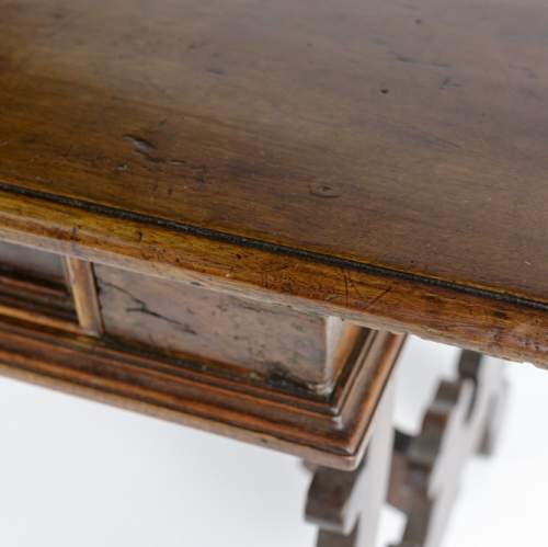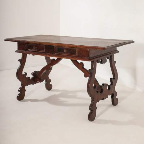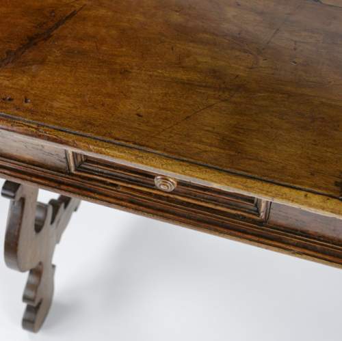 Stock Number: 4380Impressive Italian Walnut Desk or Console This finely constructed desk, dating to the early 19th Century, exemplifies the restrain elegance of Italian craftsmanship of the period. Executed in walnut the moulded rectangular top is supported by a frieze incorporating two useful drawers. The desk rests upon sculpturally carved trestle legs joined by a shapely stretcher, lending structural integrity and visual harmony. The walnut, as expected, has developed a warm patination consistent with its age and use. Two Drawers. Excellent patina. Walnut. Italy Circa 1820.
