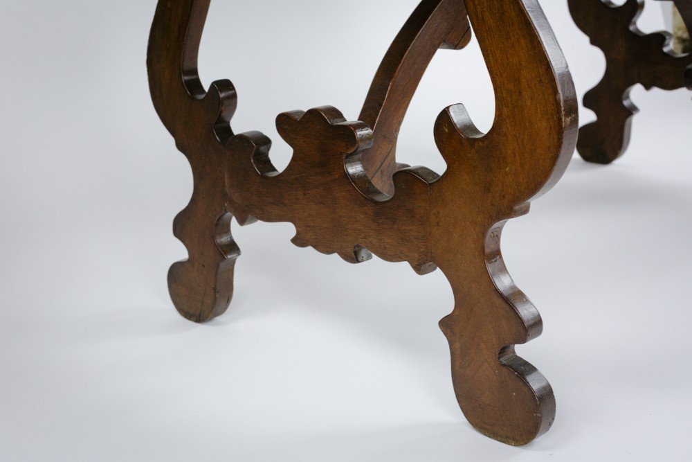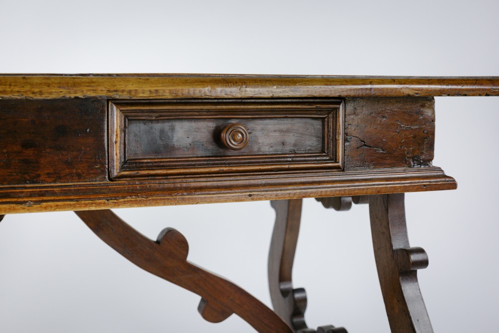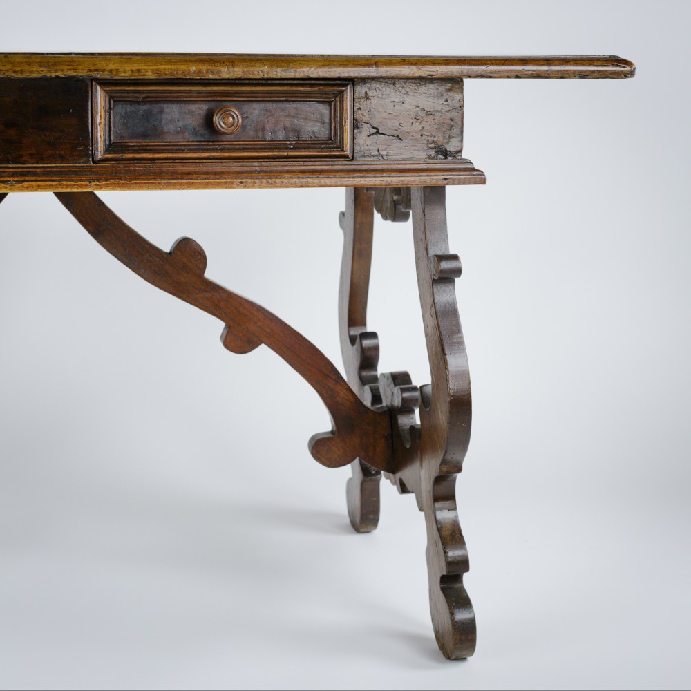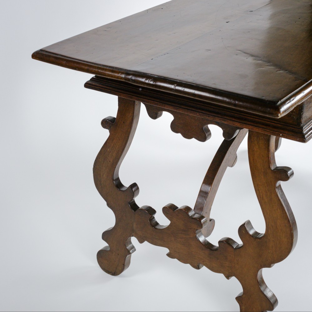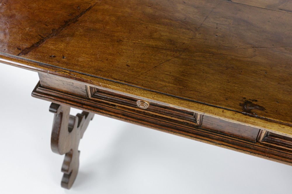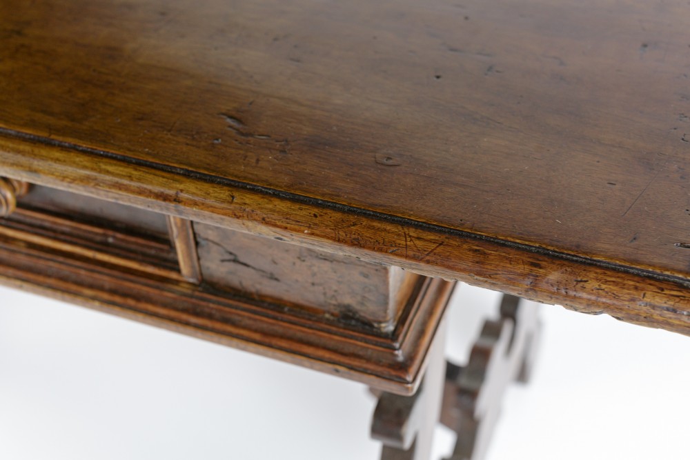 Stock Number: 4380Impressive Italian Walnut Desk or Console This finely constructed desk, dating to the early 19th Century, exemplifies the restrain elegance of Italian craftsmanship of the period. Executed in walnut the moulded rectangular top is supported by a frieze incorporating two useful drawers. The desk rests upon sculpturally carved trestle legs joined by a shapely stretcher, lending structural integrity and visual harmony. The walnut, as expected, has developed a warm patination consistent with its age and use. Two Drawers. Excellent patina. Walnut. Italy Circa 1820.