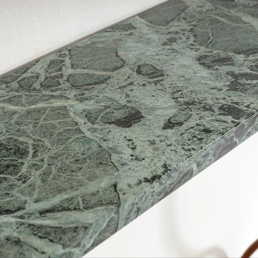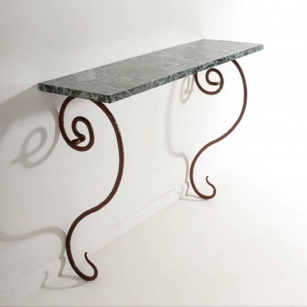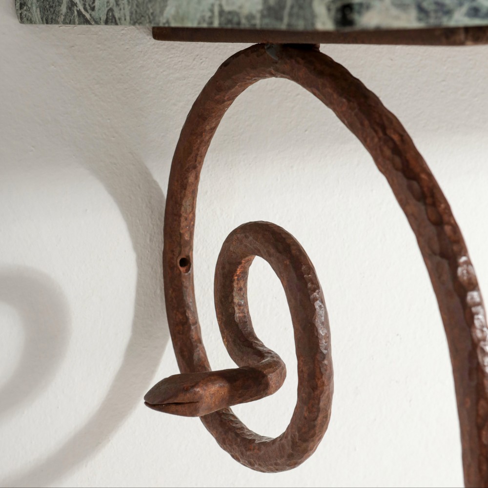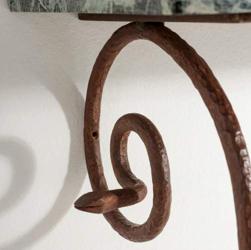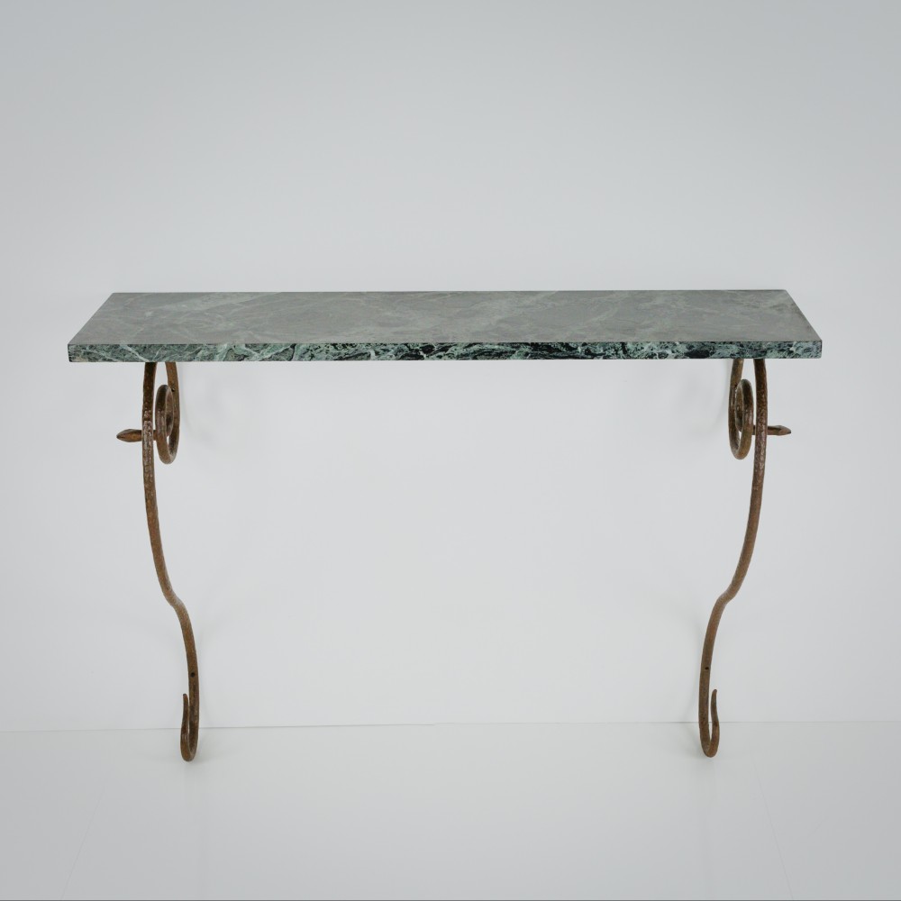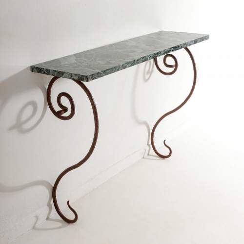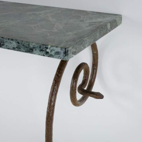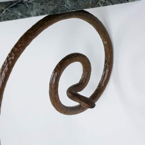 Stock Number: 4506Wrought Iron and Marble Console In the Manner of Paul Poiret. Patinated wrought iron base featuring of a pair of serpents, with an impressive marble top. Wall Mounted by 6 fixings, hammered patination to enhance the "skin" of each serpent with details of eyes and mouth to each serpent. France, Circa 1919. Most likely retailed by Maison Martine. Similar Console sold Sotheby's Important Design. Dec 2017. Lot 58. Sotheby's PF1304. May 2013. Lot 34. Image Found on P.53 from Yvonne Deslandres, Poiret (Paris 1986). Image also found of Poiret's Faubourg Saint-Honore Interior featuring His wife Denise posing in front of a remarkably similar console. Paul Poiret (1879 - 1944) A revolutionary French fashion designer, often credited with liberating women from corsets and introducing bold colour, exoticism and a sense of theatricality to early 20th Century fashion. while best known for his clothing - his role in shaping modern interior design and lifestyle aesthetics is sometimes overlooked. He viewed fashion, art and interiors not as isolated craft but as a total lifestyle. His ability to use fashion for interiors and create the notion of a lifestyle brand was at the time bold and pioneering. He was arguably the first designer to extend his aesthetic through his decorative arts studio, Maison Martine, into home goods, predating Coco Chanel, Dior Maison or Versace Home by decades.