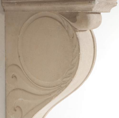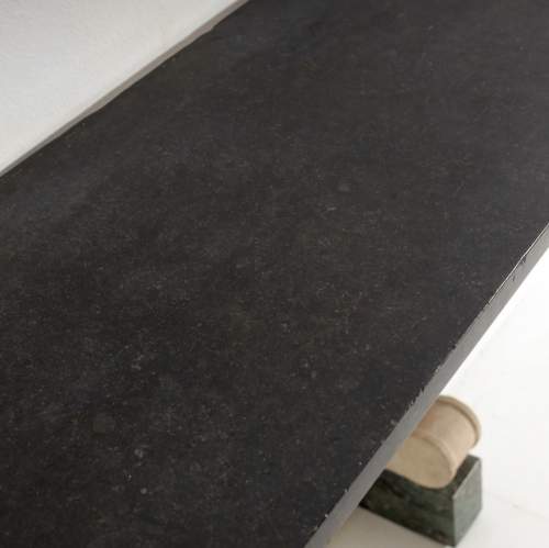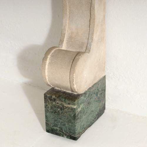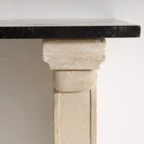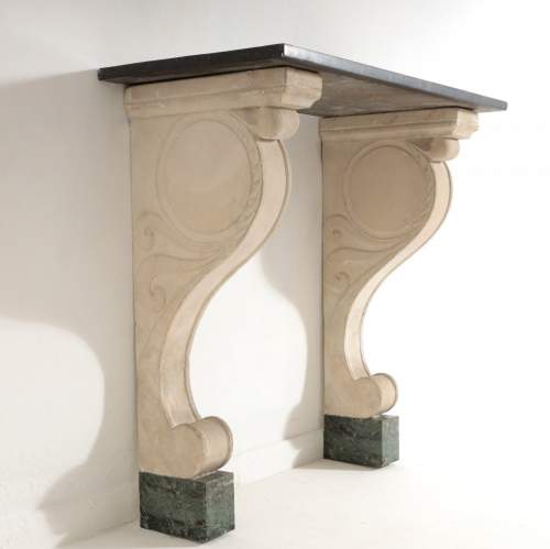 Stock Number: 4369Impressive Carved Stone (Pierre de Bourgogne) and Marble Console Table. Standing on Marble Vert feet, each simple support decorated in elegant, understated, carved relief. Stepped to a black marble top. Both Supports have visible wall fixings at the top, for wall mounting. For final installation these could be inset to wall or another fixing used. France, Circa 1890. Private Collection, France.