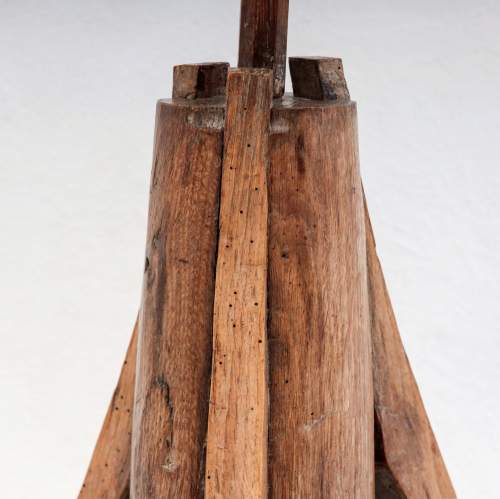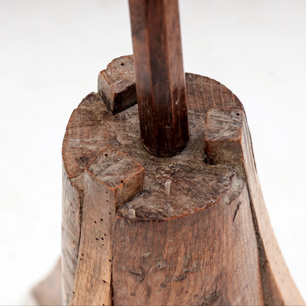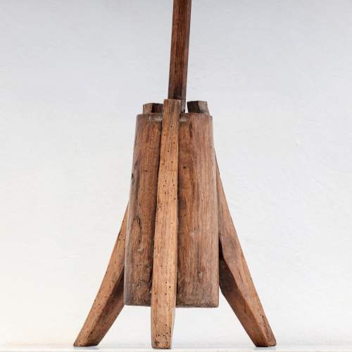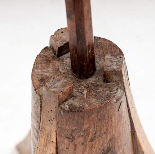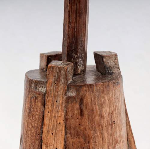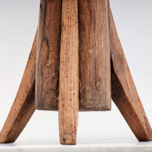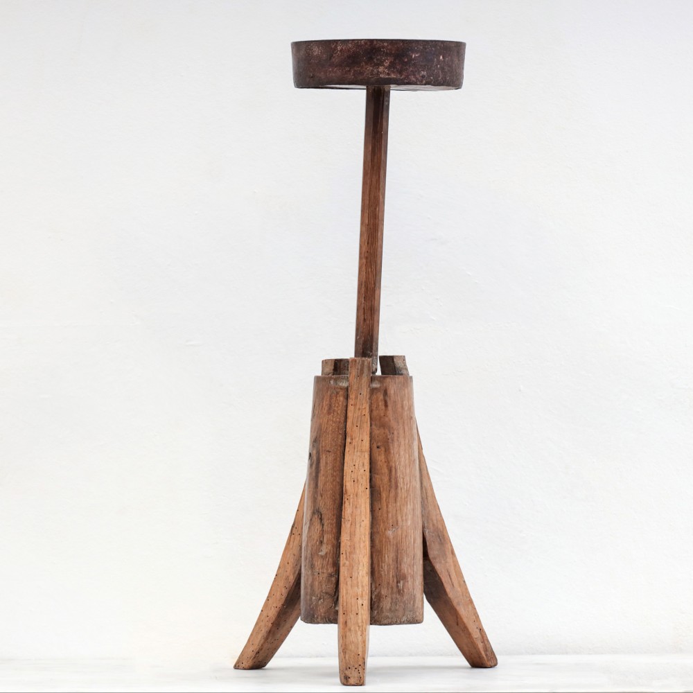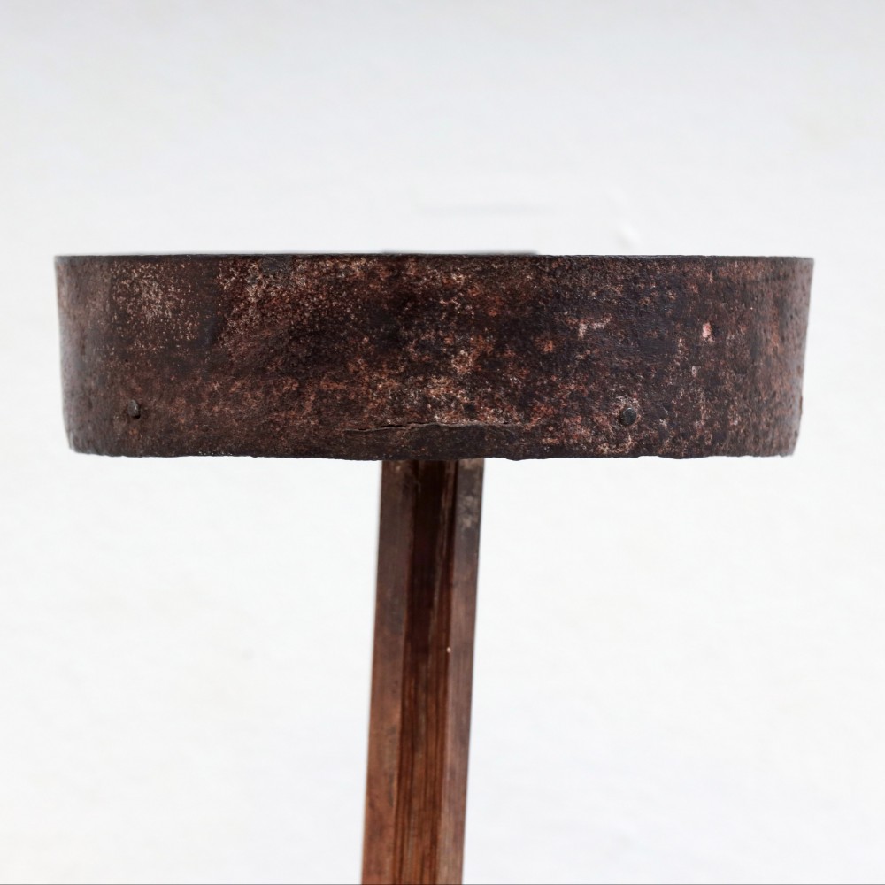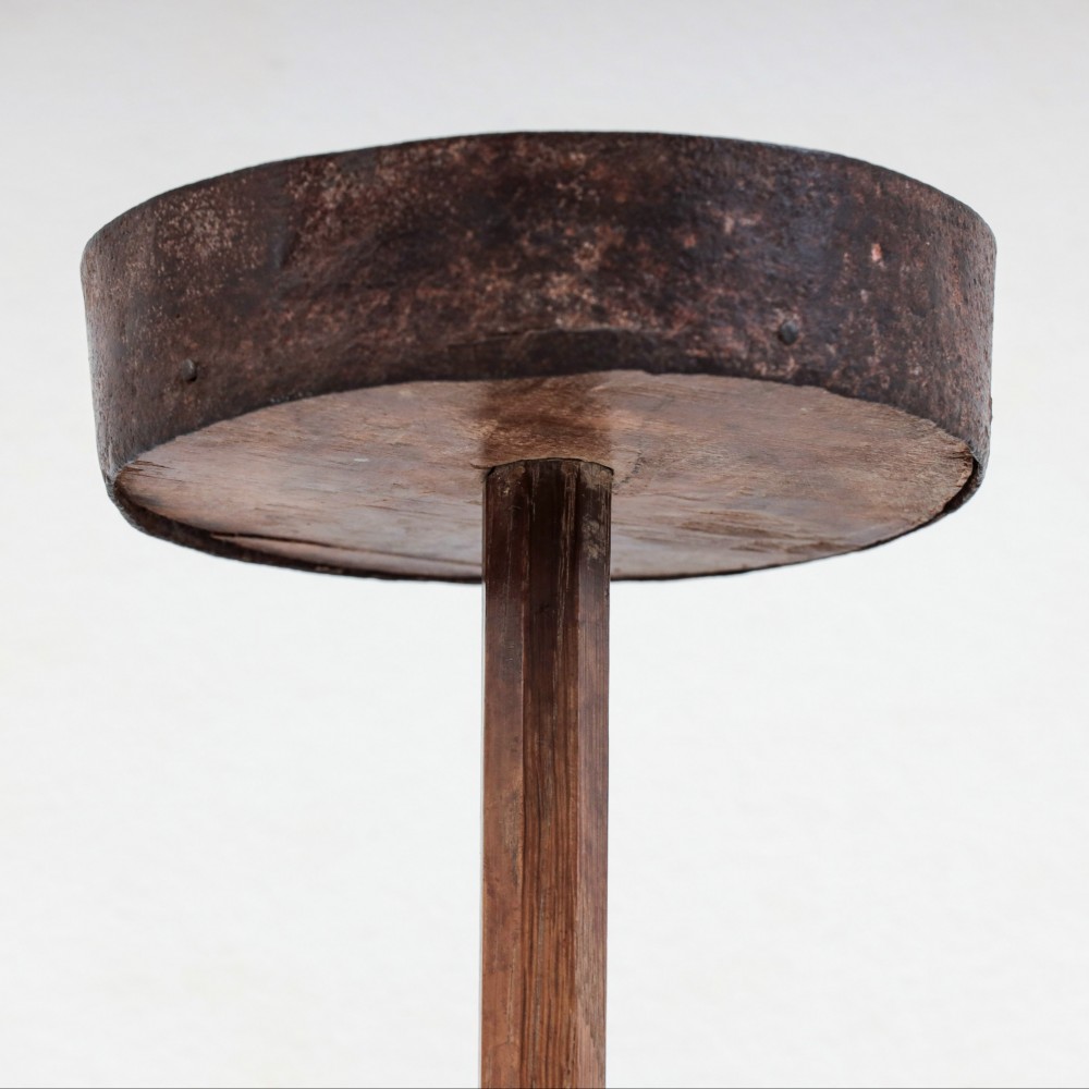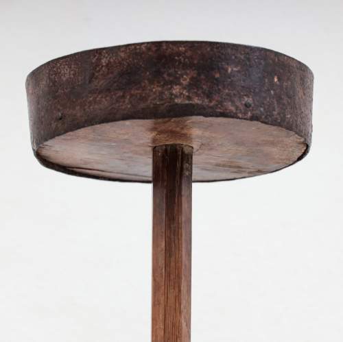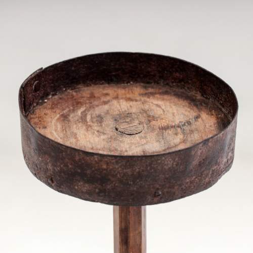 Stock Number: 4510Primitive late 18th century candlestand. Weighted heavy base with three applied splayed legs. Fixed top on a stem with wrought iron lip. Evidence of historical worm. Treated. Circa 1780, West Country or Wales. UK.