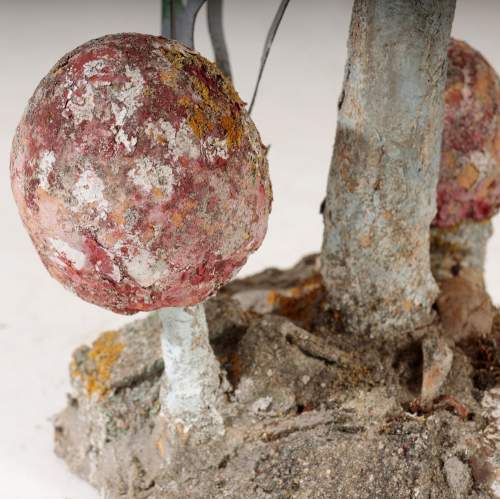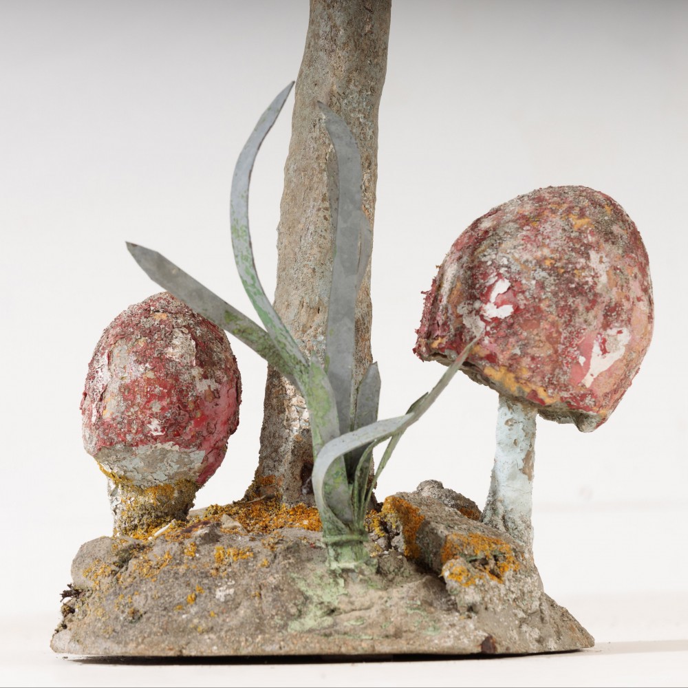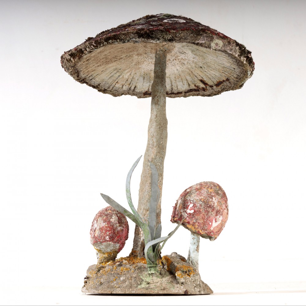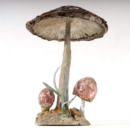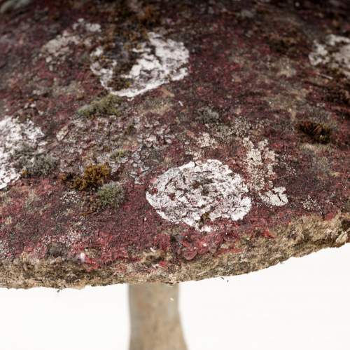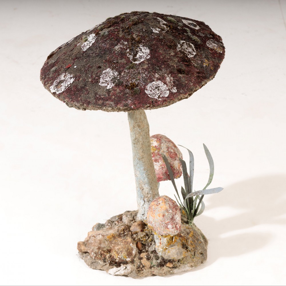 Stock Number: 4533Primitive Painted Toadstool Sculpture. Rising from its base with simple, earnest presence of something shaped as much by intuition as by craft. It is handmade in the most affectionate sense - irregular, playful and alive with personality. The cap is broad and slightly askew, its surface textured, Paint, without fuss is original a mottled field of earthy reds, ochres and soft browns,,colours bleed into patinated weathering as if sun and rain have collaborated over time to soften the edges. Small, whimsical details enhance its charm, the detail of the underside of the cap. and multiple smaller mushrooms and reeds growing from the base. The sculpture radiates a humble, grounded warmth, transforming an ordinary mushroom into an object of delight and quiet storytelling. Painted, hand rendered Cement France, Circa 1950.