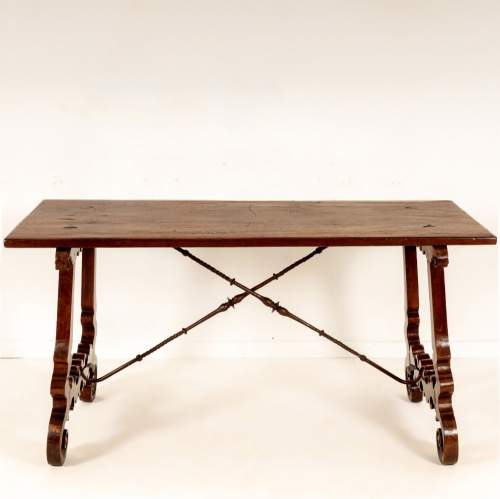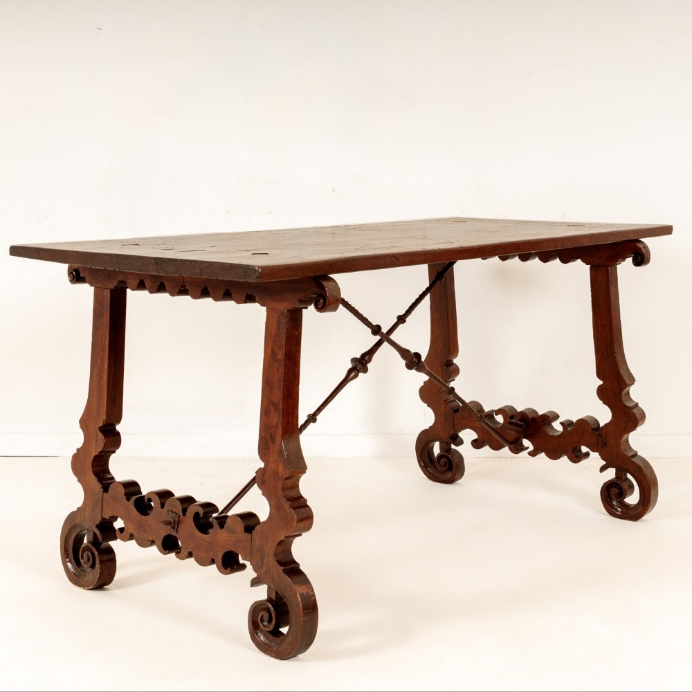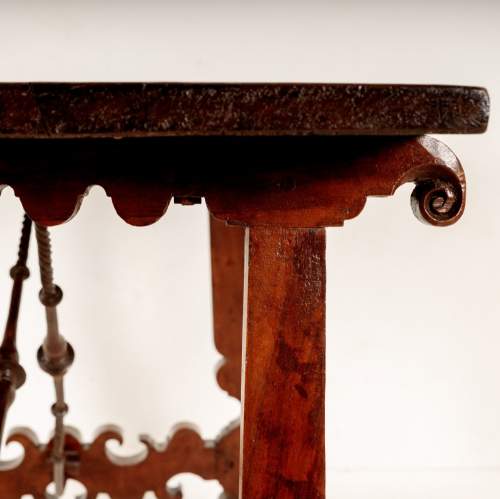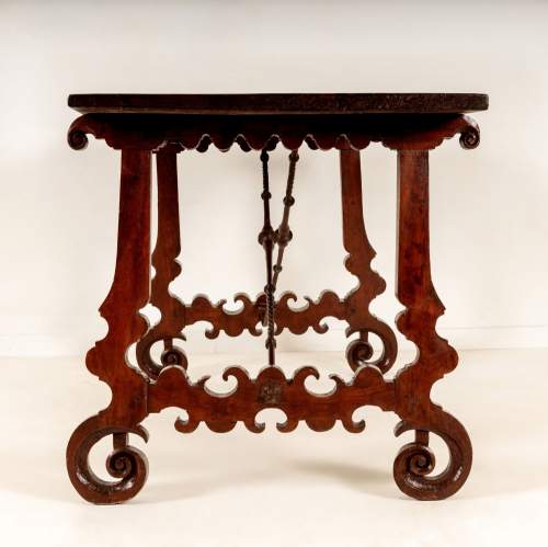 Stock Number: 450819th Century Italian Carved Walnut Table. A richly expressive early 19th century Italian table showcasing exuberant hand-carved detailing and superb craftsmanship. The scrolling lyre-style legs, pierced feet, intricate stretcher, and deep walnut patina give a remarkable sculptural presence. The single plank top has a wonderful patina. Both functional & beautiful. Its size lends itself as a writing table, small dining table or large console. Elegant from every angle this piece is a superb statement of Italian artist tradition. Italy, Circa 1840.