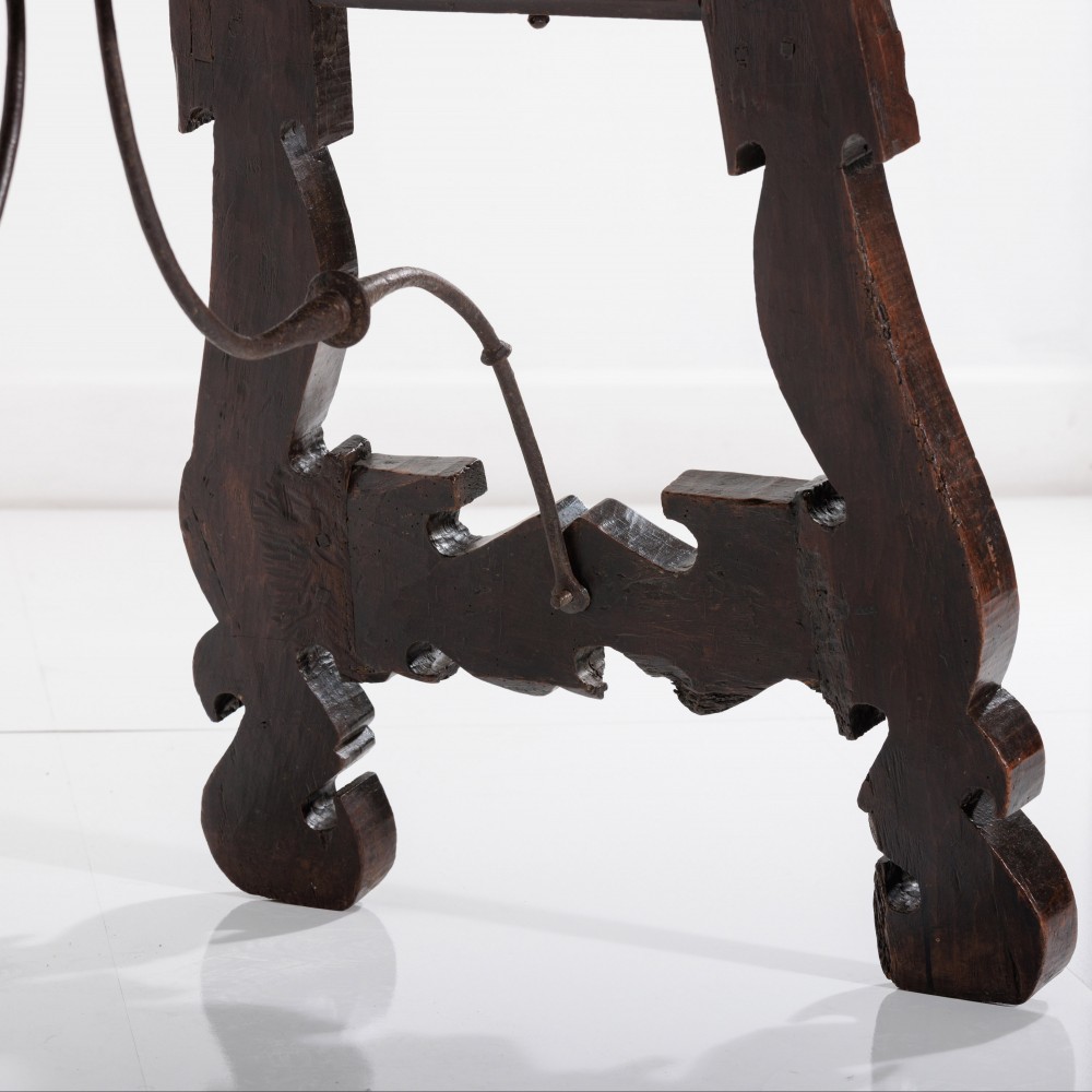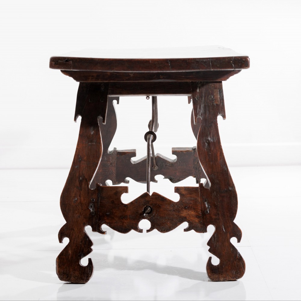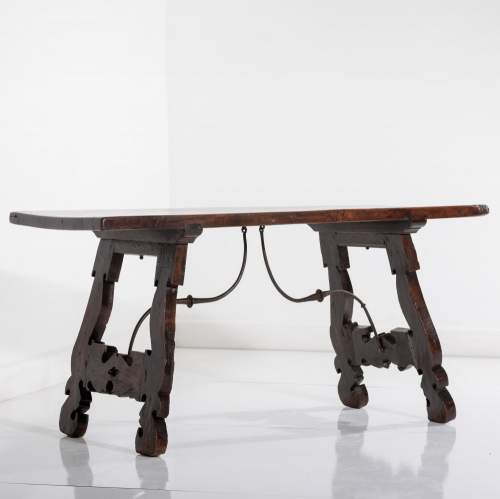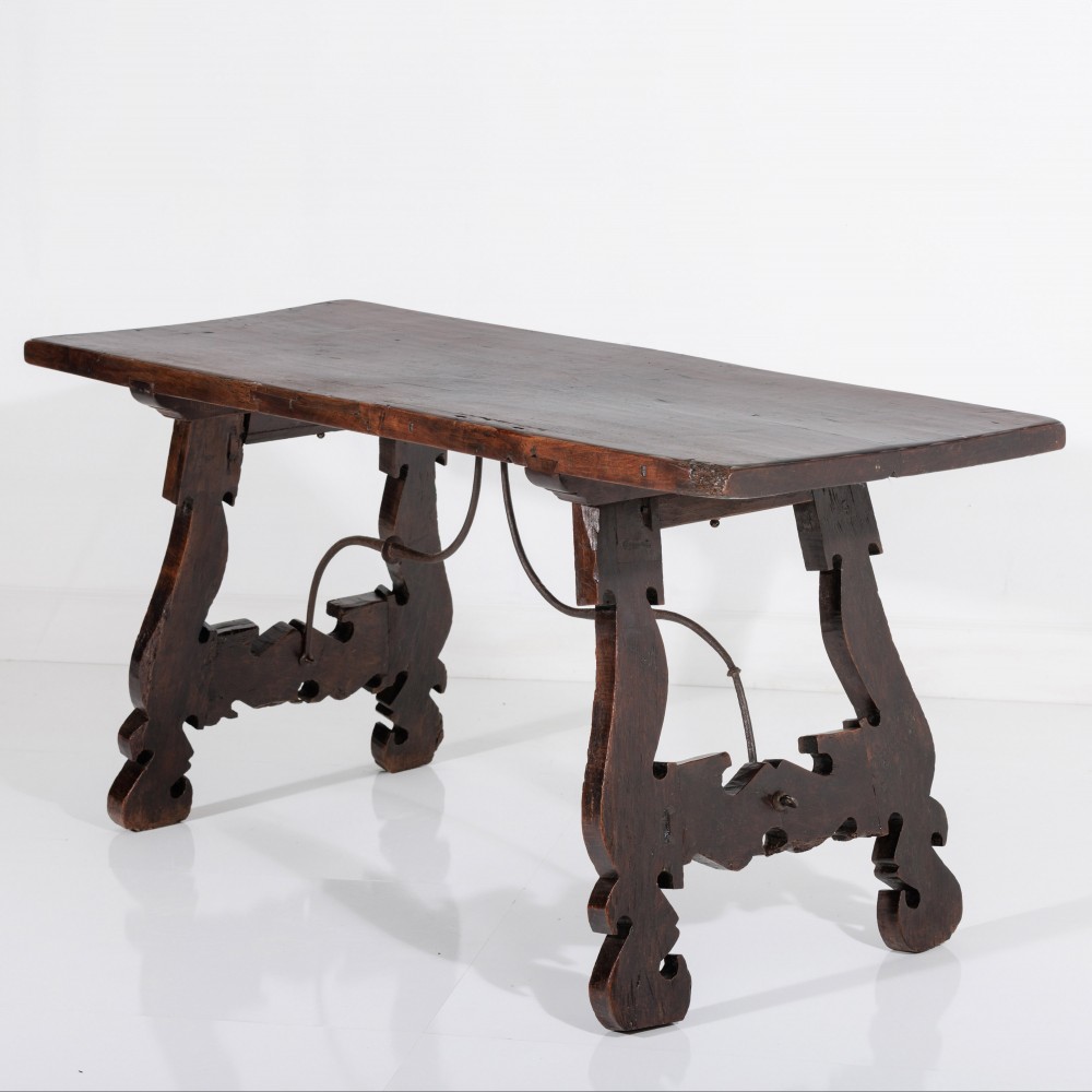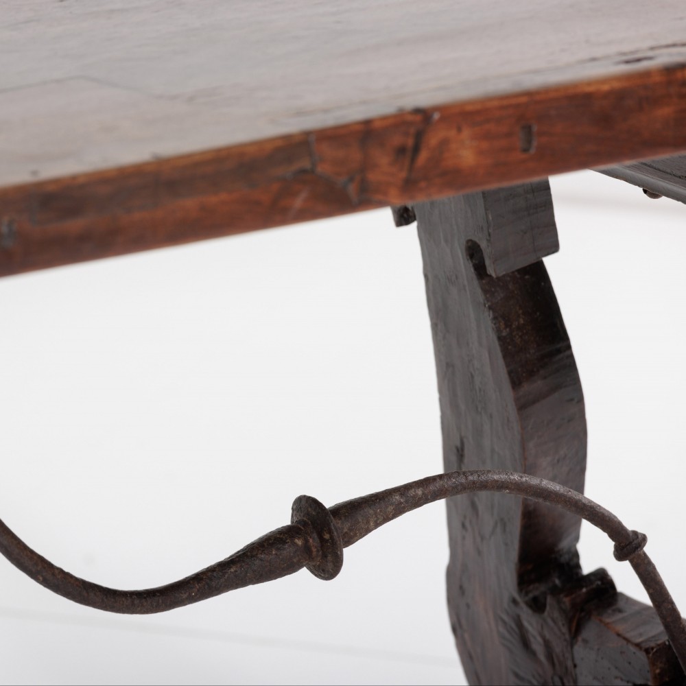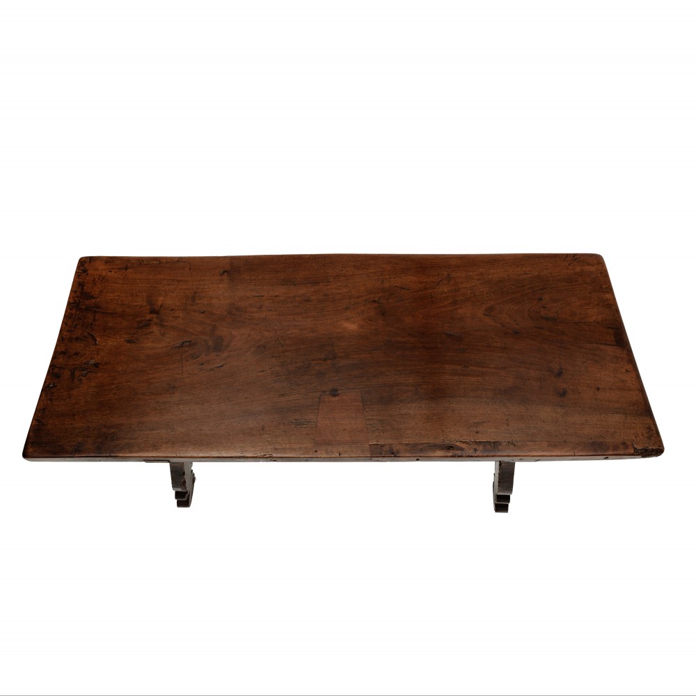 Stock Number: 4537Bold, single plank walnut table. Intricate carved legs. with wrought iron stretcher. Wear commensurate with age. Several well executed historical spliced repairs to the top. Spain, Circa 1860.