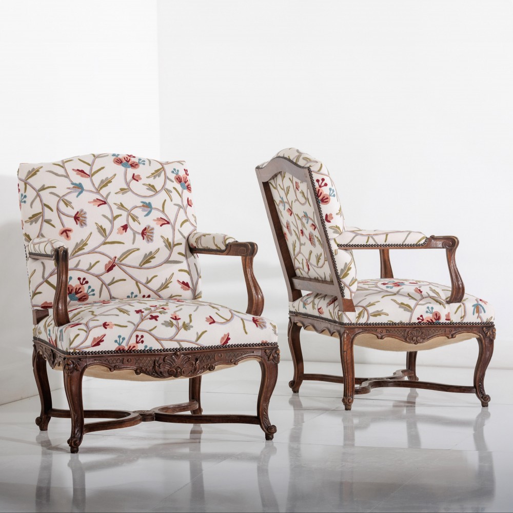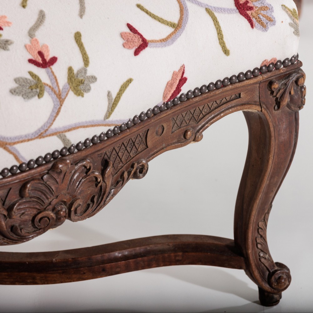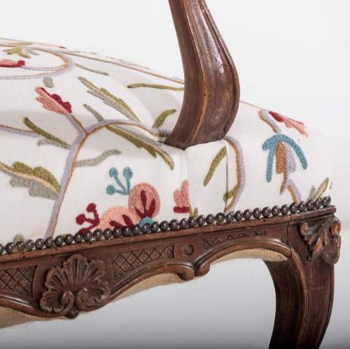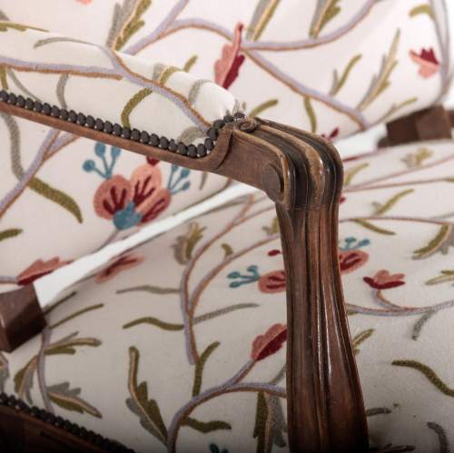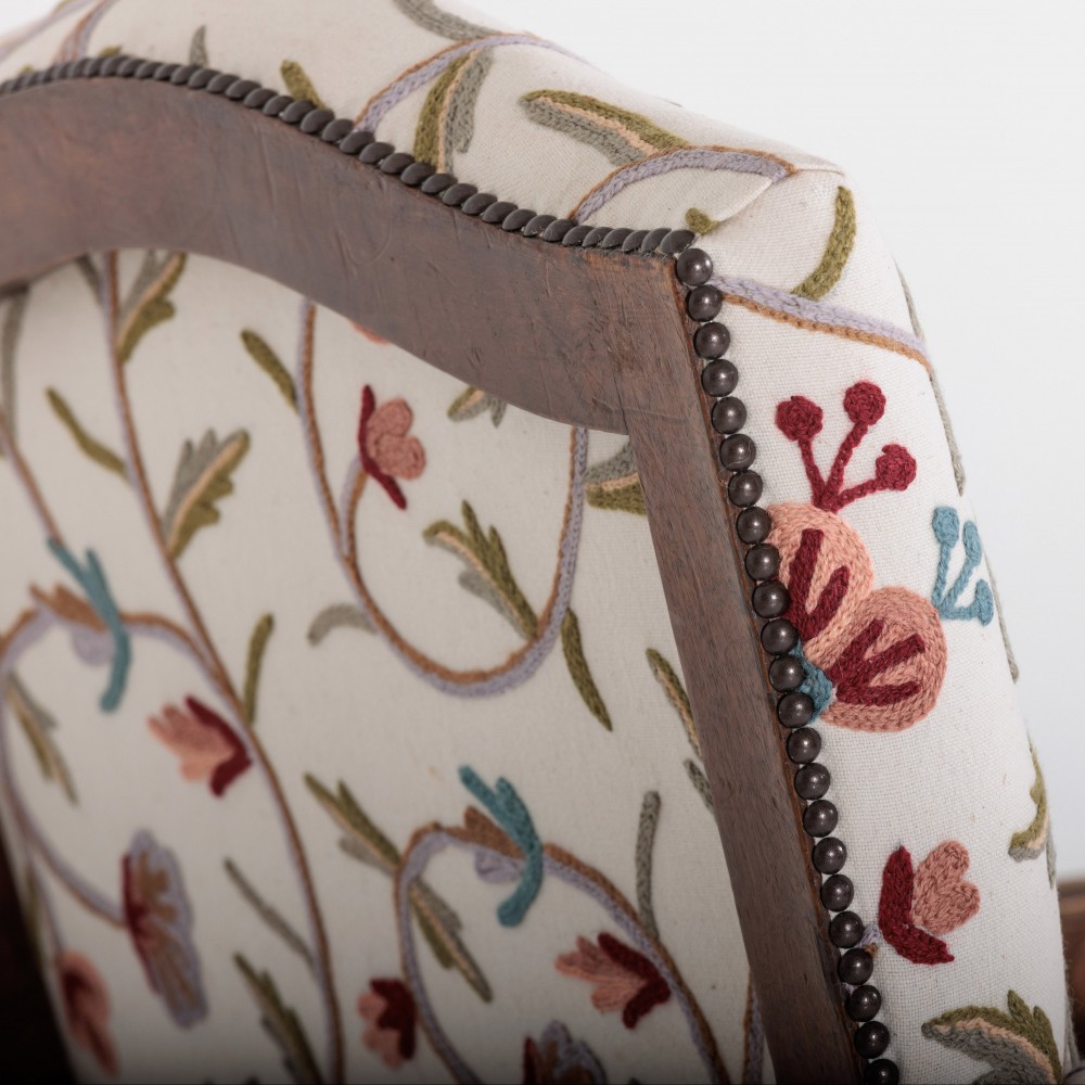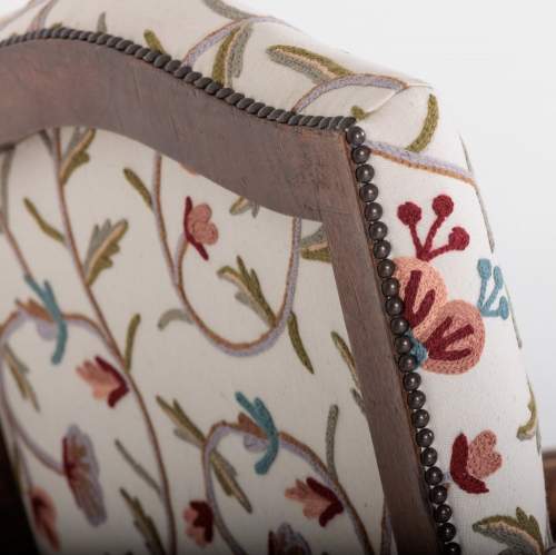 Pair of 19th Century Open Armchairs in Vintage Crewel Fabric