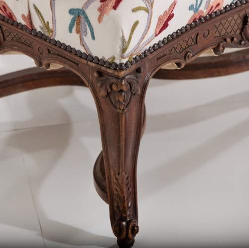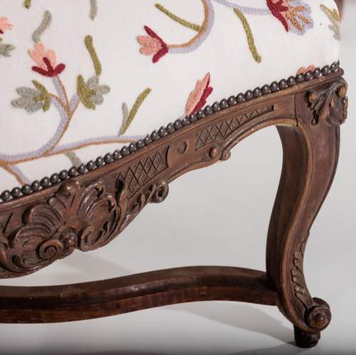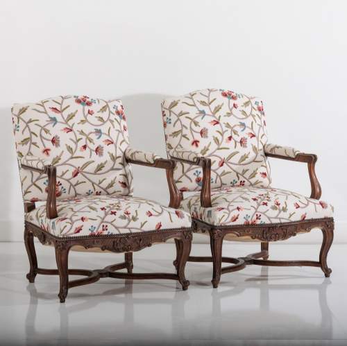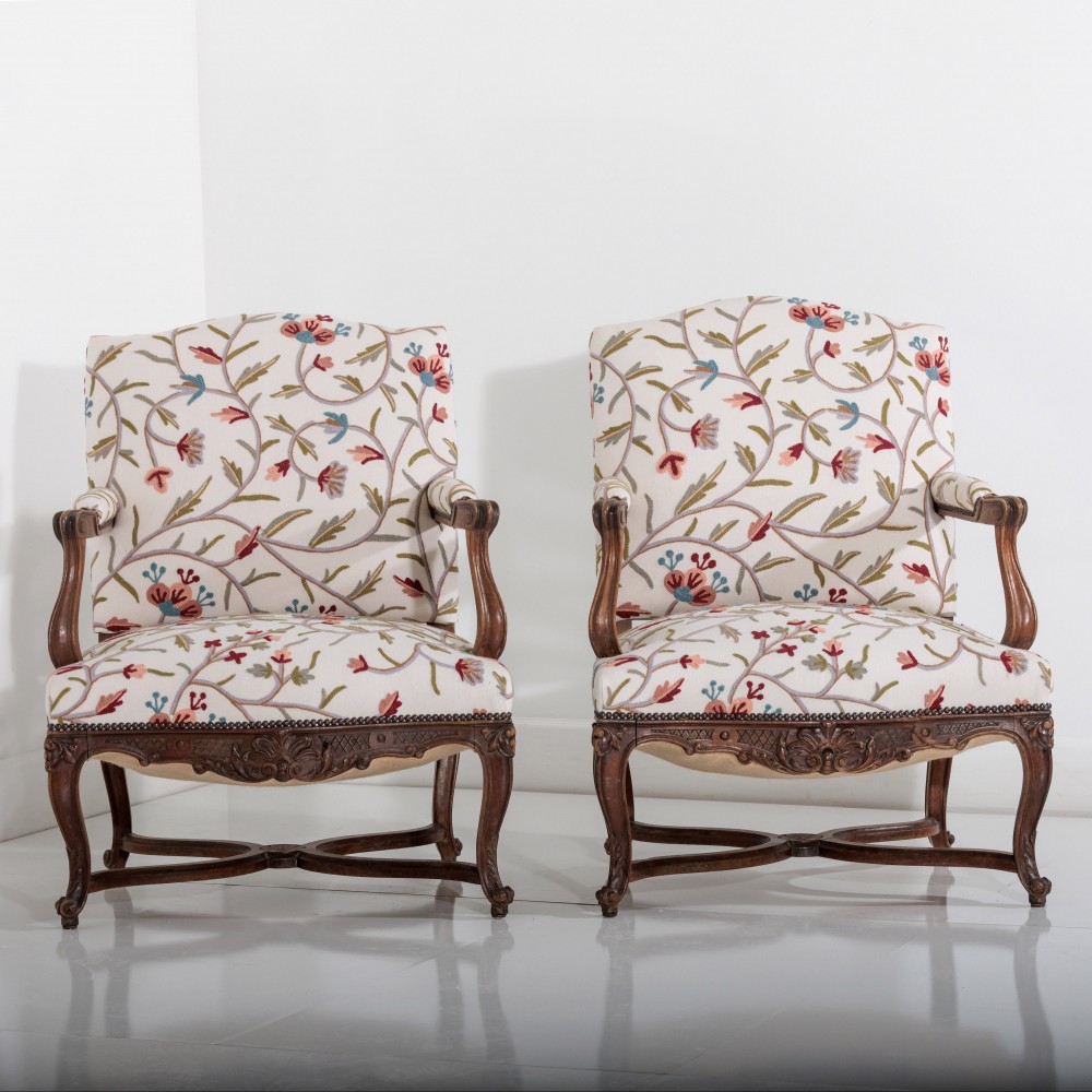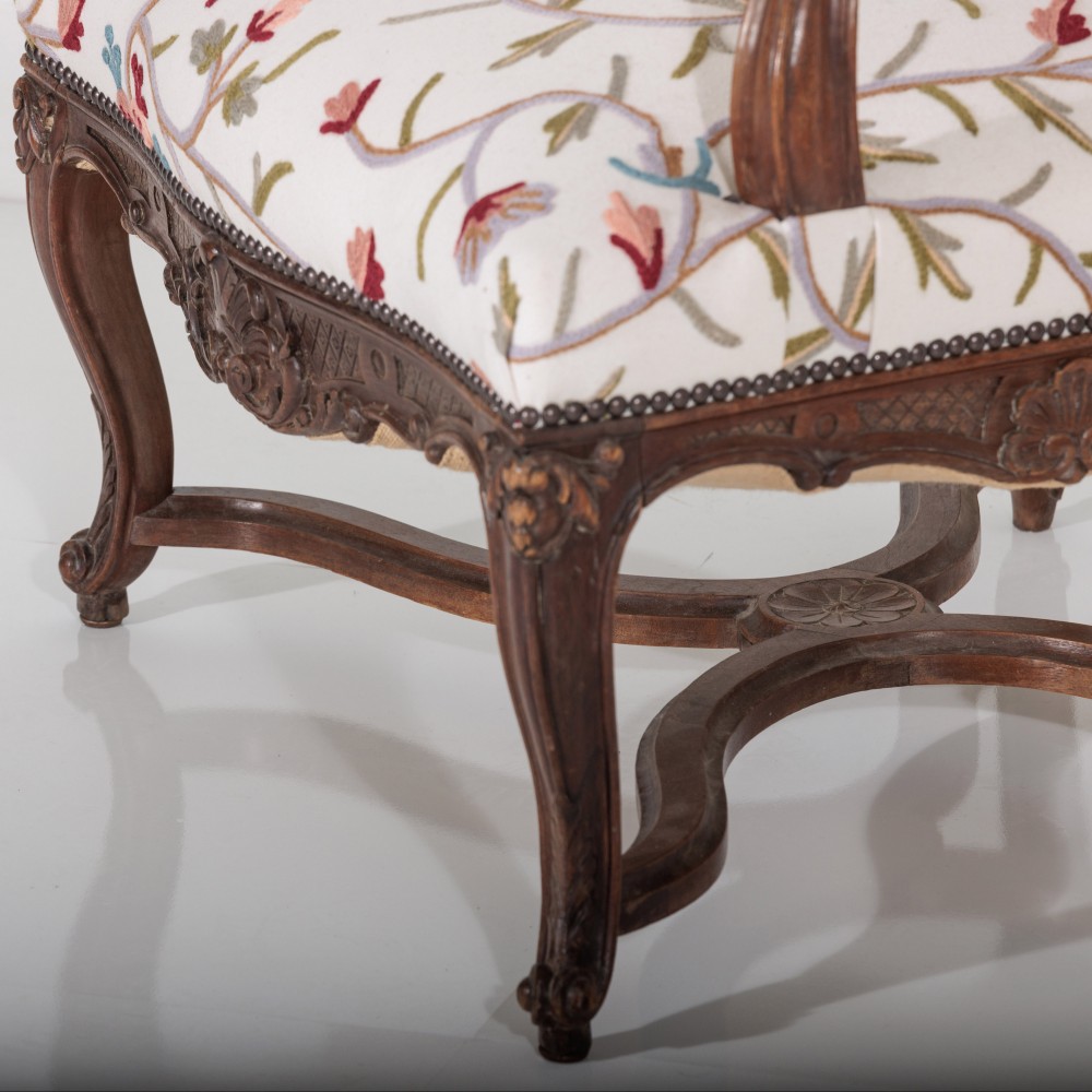 Stock Number: 4503Pair of 19th Century Open armchairs with X stretcher. Recently Reupholstered in vintage crewel work fabric. France, Circa 1880.