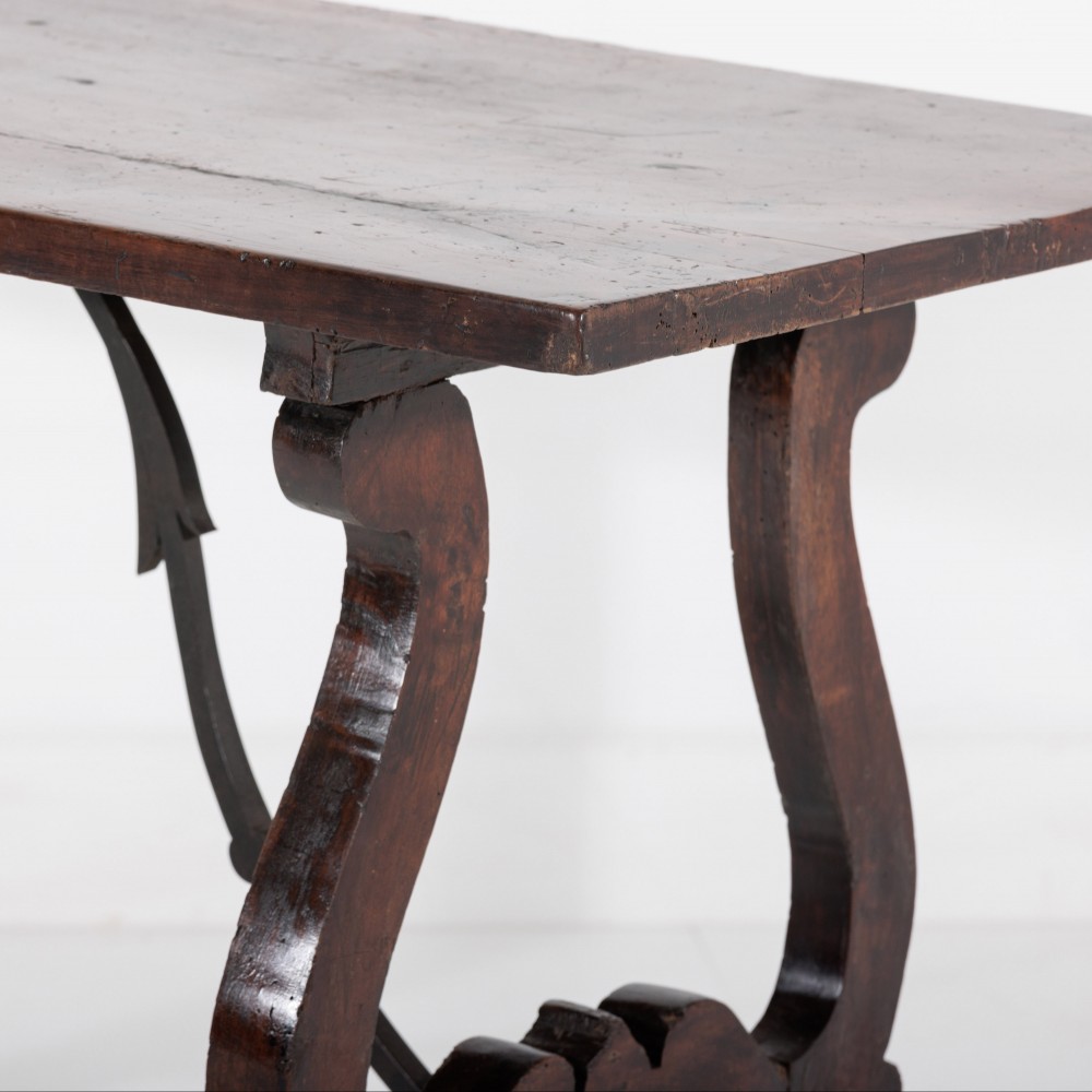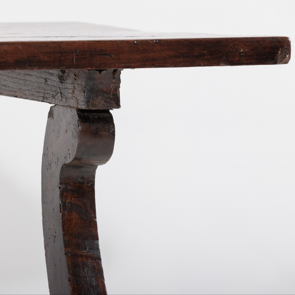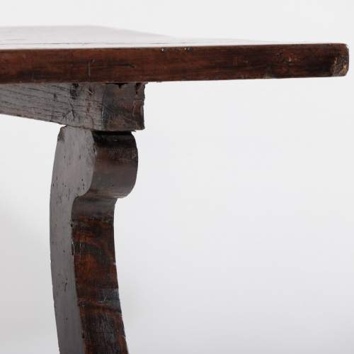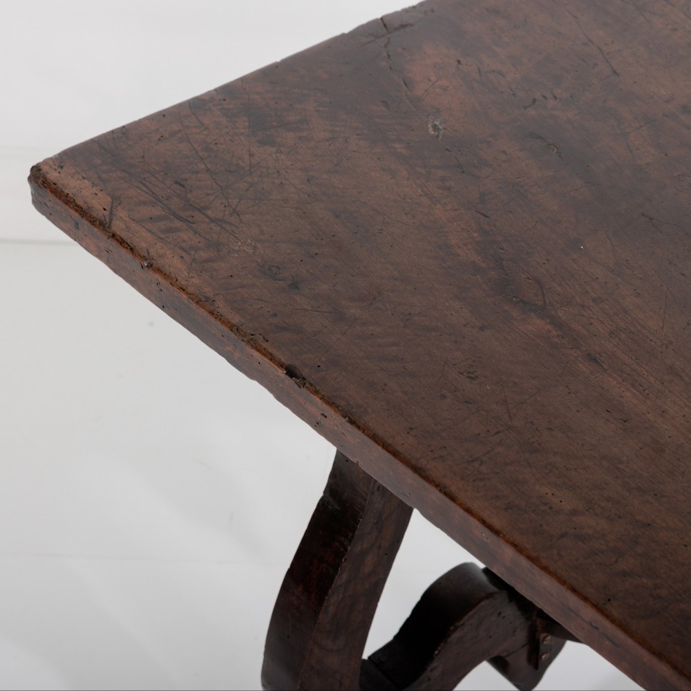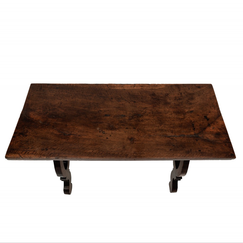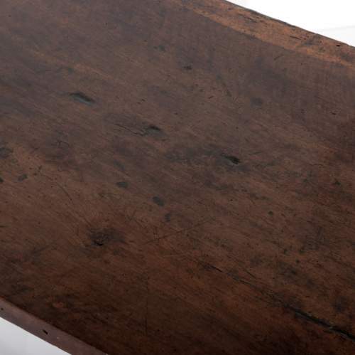 Stock Number: 453618th Century Walnut Trestle Table. Single plank top with excellent patination. Iron stretcher Historical Splice repair, wonderfully warped although absolutely solid. Italy, Circa 1780.