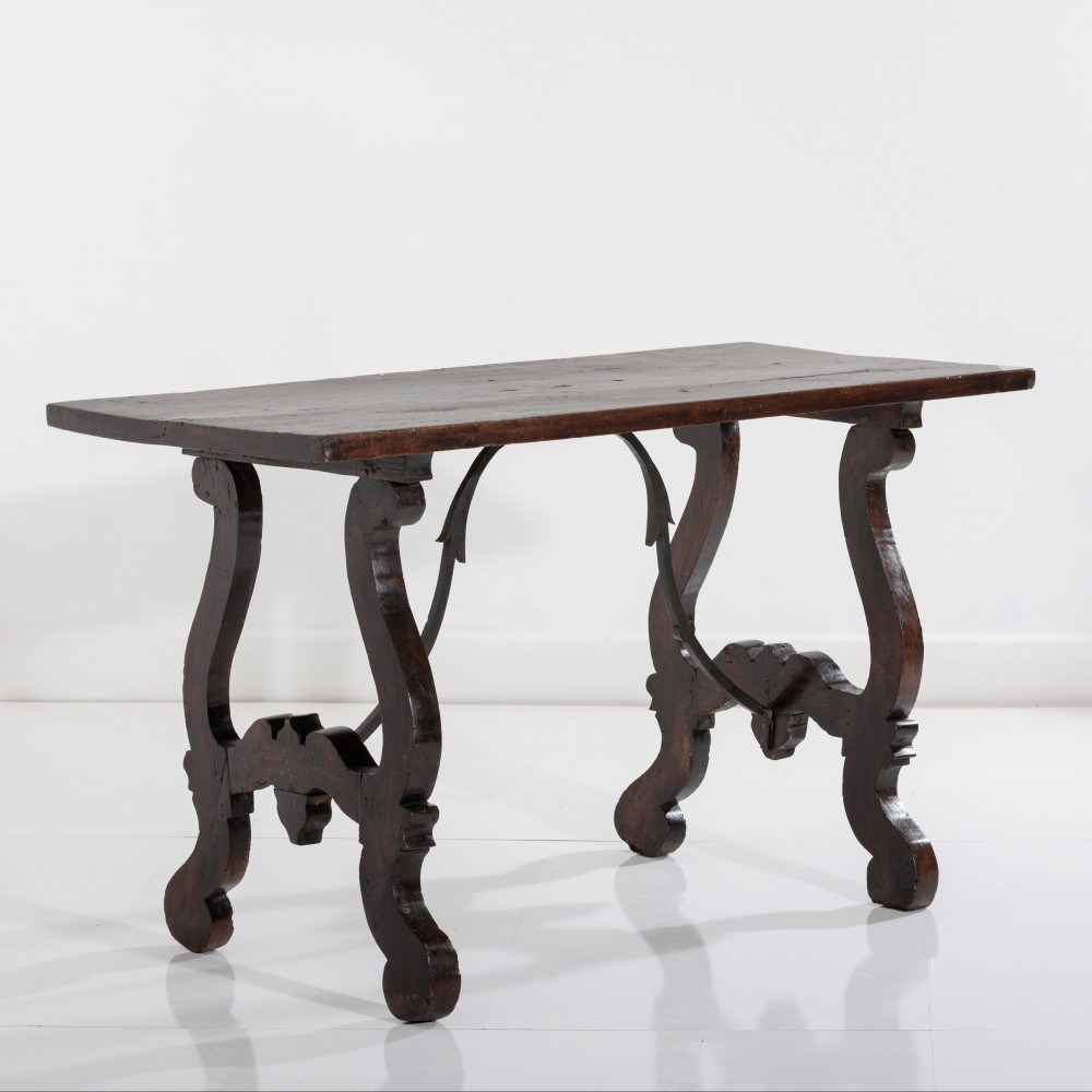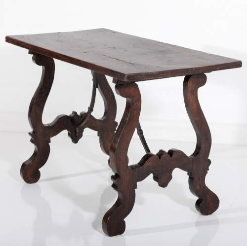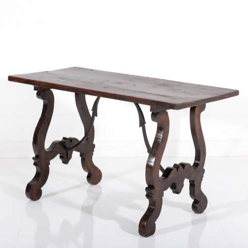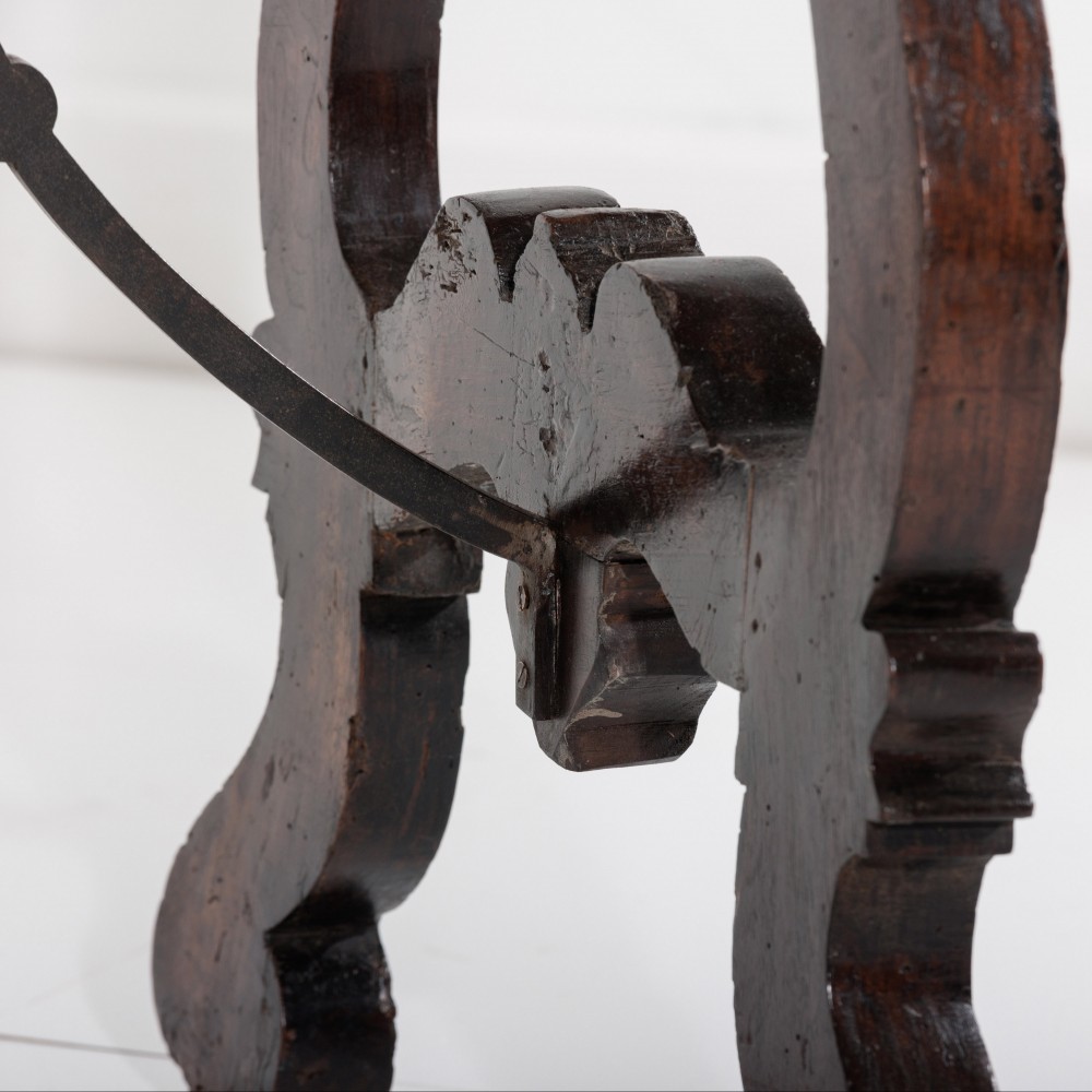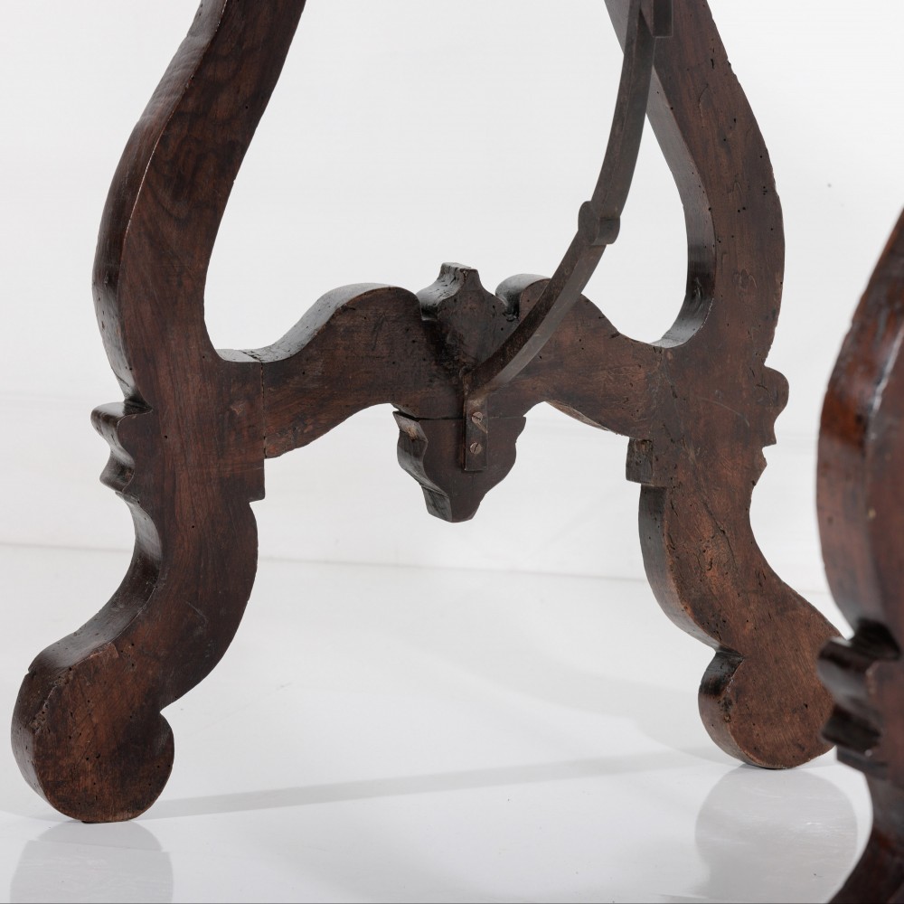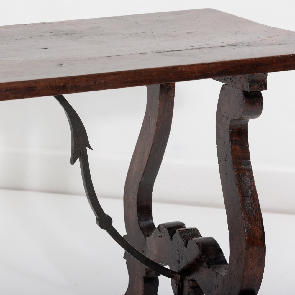 Stock Number: 453618th Century Walnut Trestle Table. Single plank top with excellent patination. Iron stretcher Historical Splice repair, wonderfully warped although absolutely solid. Italy, Circa 1780.