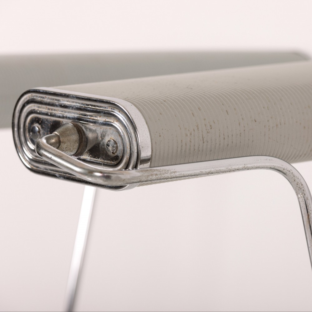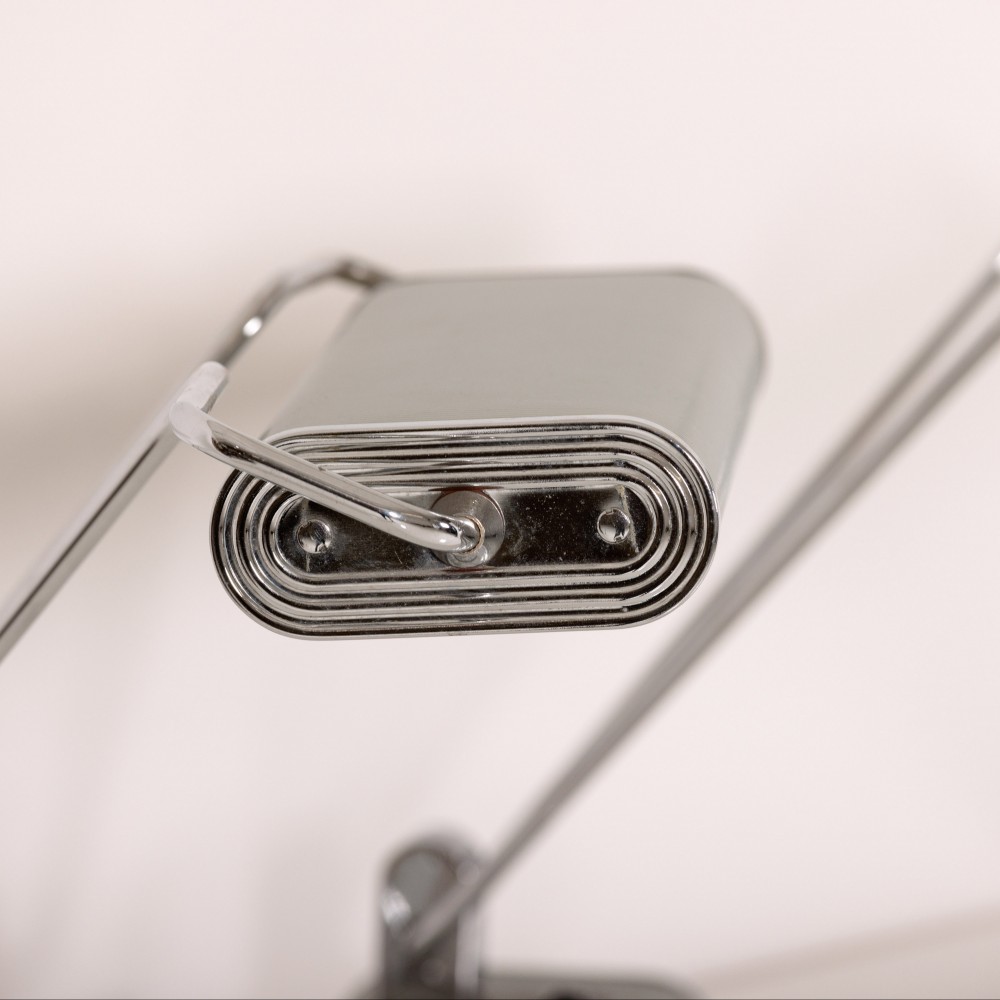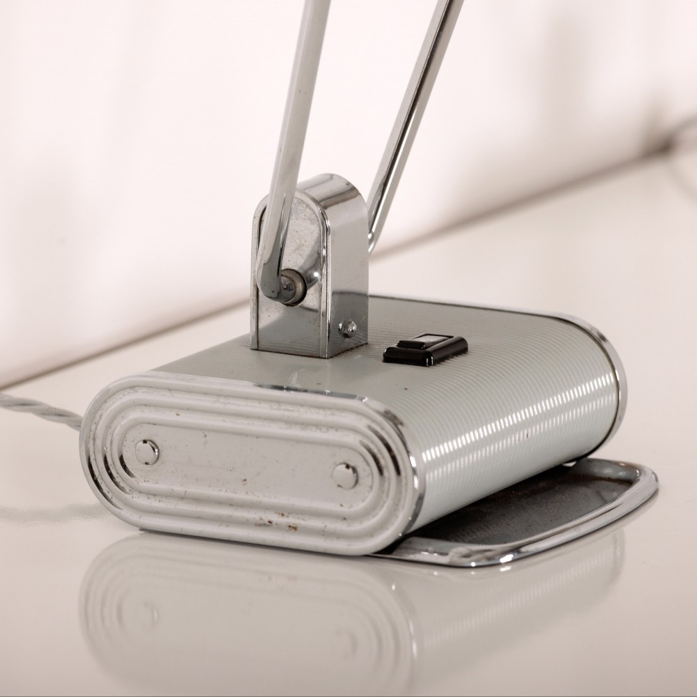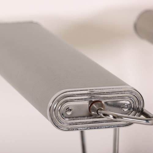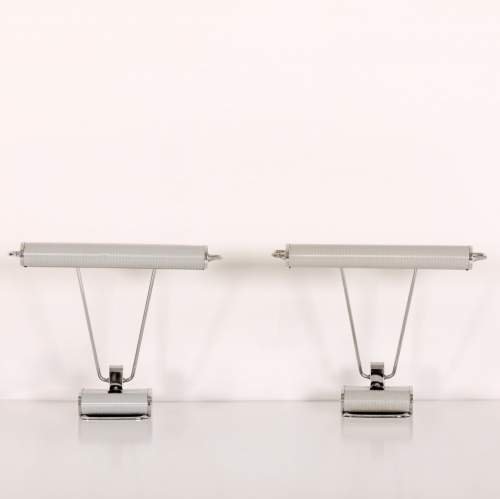 Stock Number: 4535Eileen Gray No.71 Lamp by Jumo. This pair of lamps showcases the minimalist, functional elegance typical of Gray. Sleek lines and adjustable elements reflecting her modernist approach blending art and utility. Unusual polished Chrome and light grey colourway. Iconic example of lighting design history. Rewired in antique style flex and PAT tested.