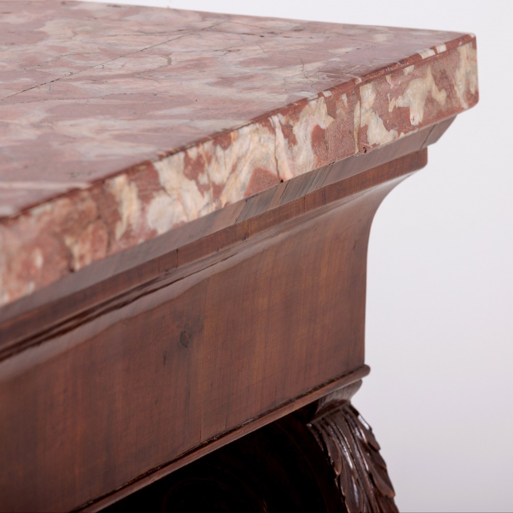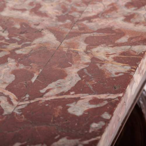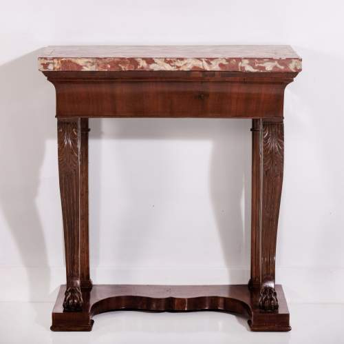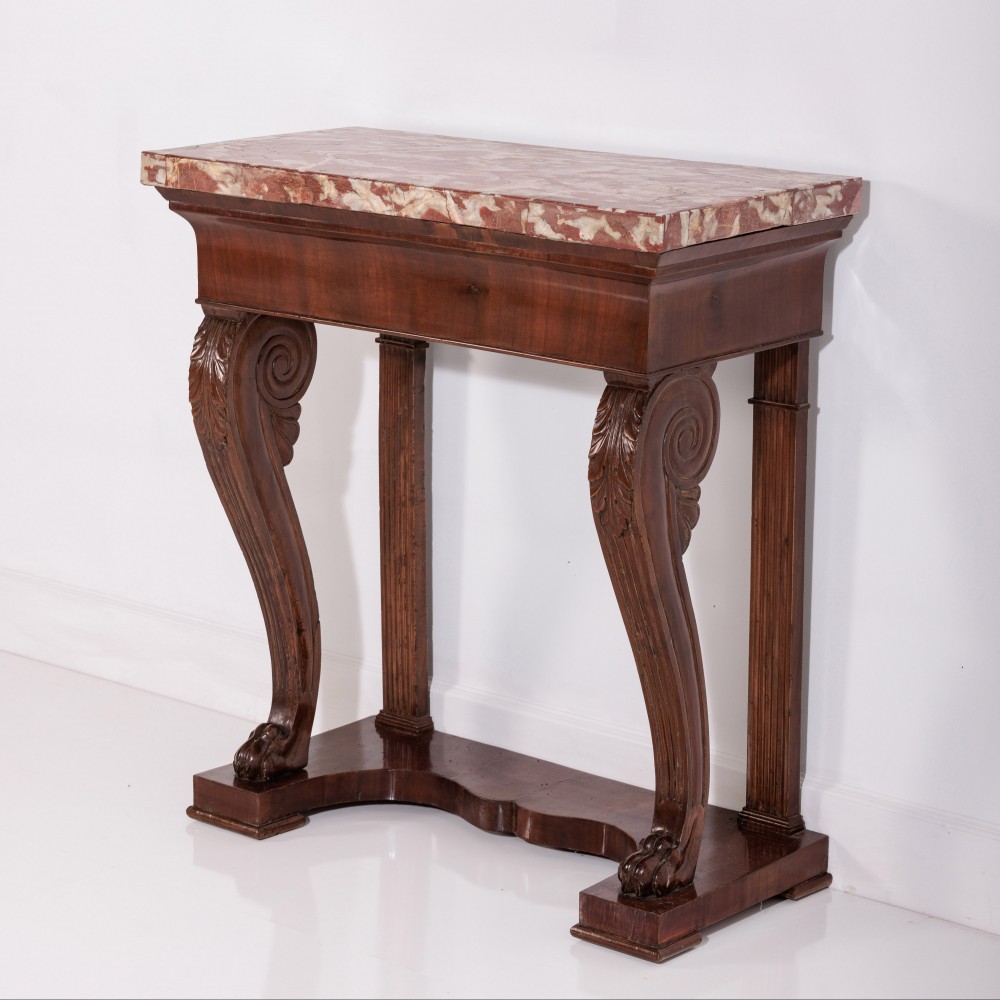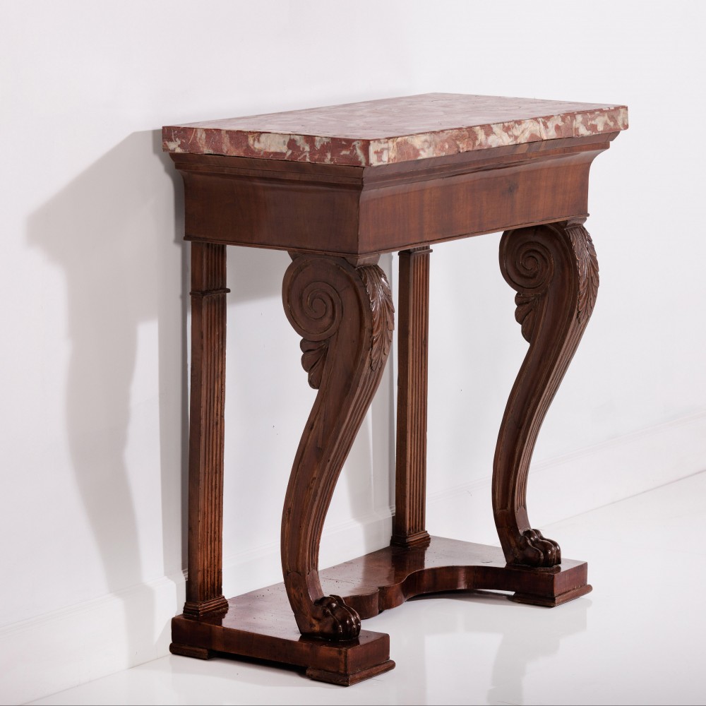 Stock Number: 4290aWell proportioned Early 19th Century Console Table boasting an unusual Incarnat Turquin marble veneer top with rich veining. The finely crafted base features scroll supports with acanthus leaf detailing, leading to classical lion paw feet, the rear, fluted legs provide additional support and balance to the whole. France, Circa 1820. Incarnat Turquin Marble Found in The Aude, opened in Antiquity. Several Fireplaces in Versailles are made of Incarnat Turquin Marble.