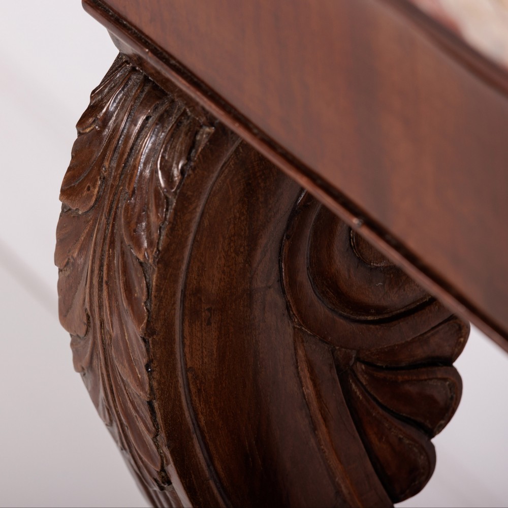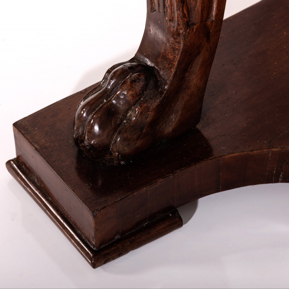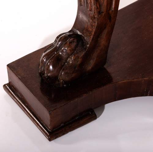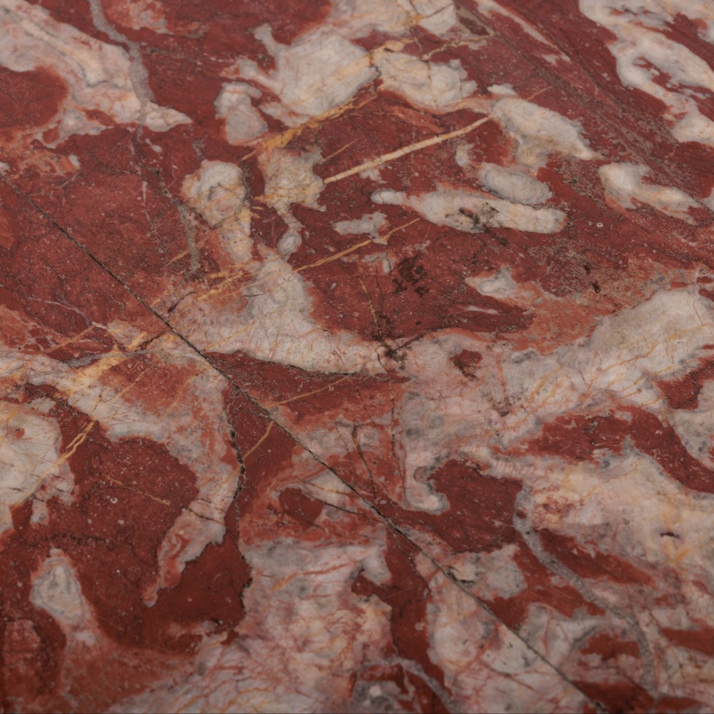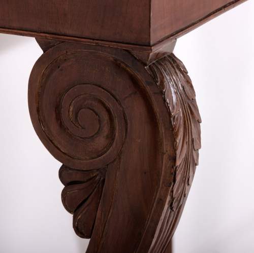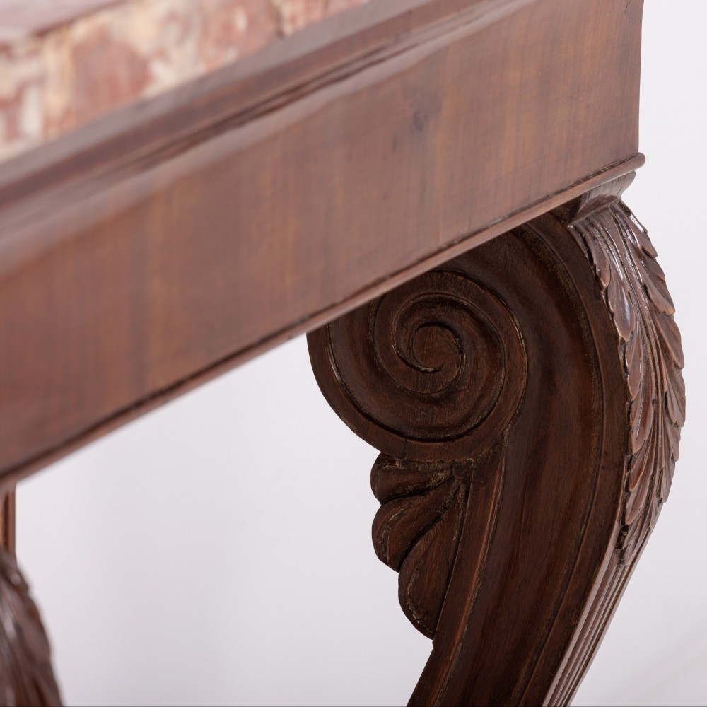Stock Number: 4290aWell proportioned Early 19th Century Console Table boasting an unusual Incarnat Turquin marble veneer top with rich veining. The finely crafted base features scroll supports with acanthus leaf detailing, leading to classical lion paw feet, the rear, fluted legs provide additional support and balance to the whole. France, Circa 1820. Incarnat Turquin Marble Found in The Aude, opened in Antiquity. Several Fireplaces in Versailles are made of Incarnat Turquin Marble.