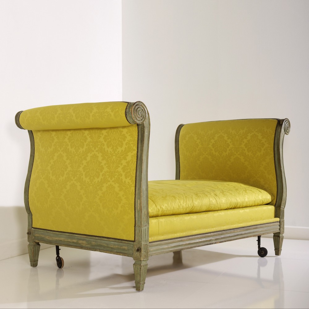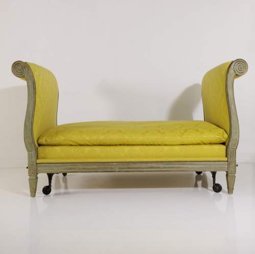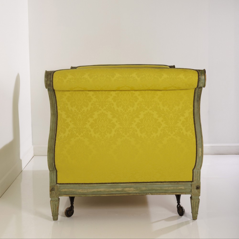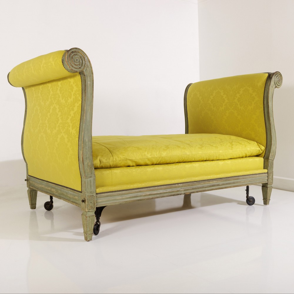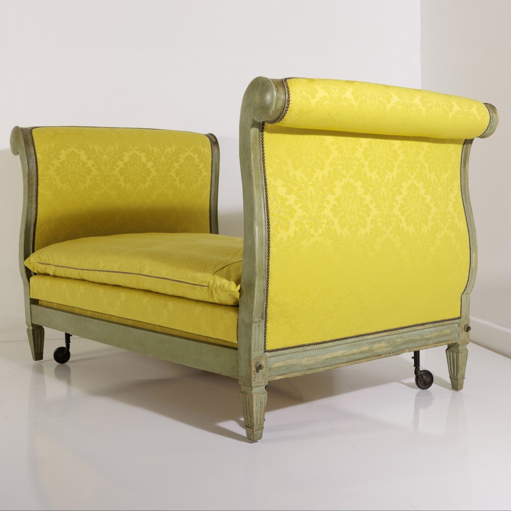 Stock Number: 4301Extraordinary Chateau Lit d'alcove, daybed or alcove bed. Original Eau de Nil Paint. Exuberant carviing. Reupholstered in Chartreuse, as close as possible to the found original. Lignum Vitae wheels France, Circa 1800.
