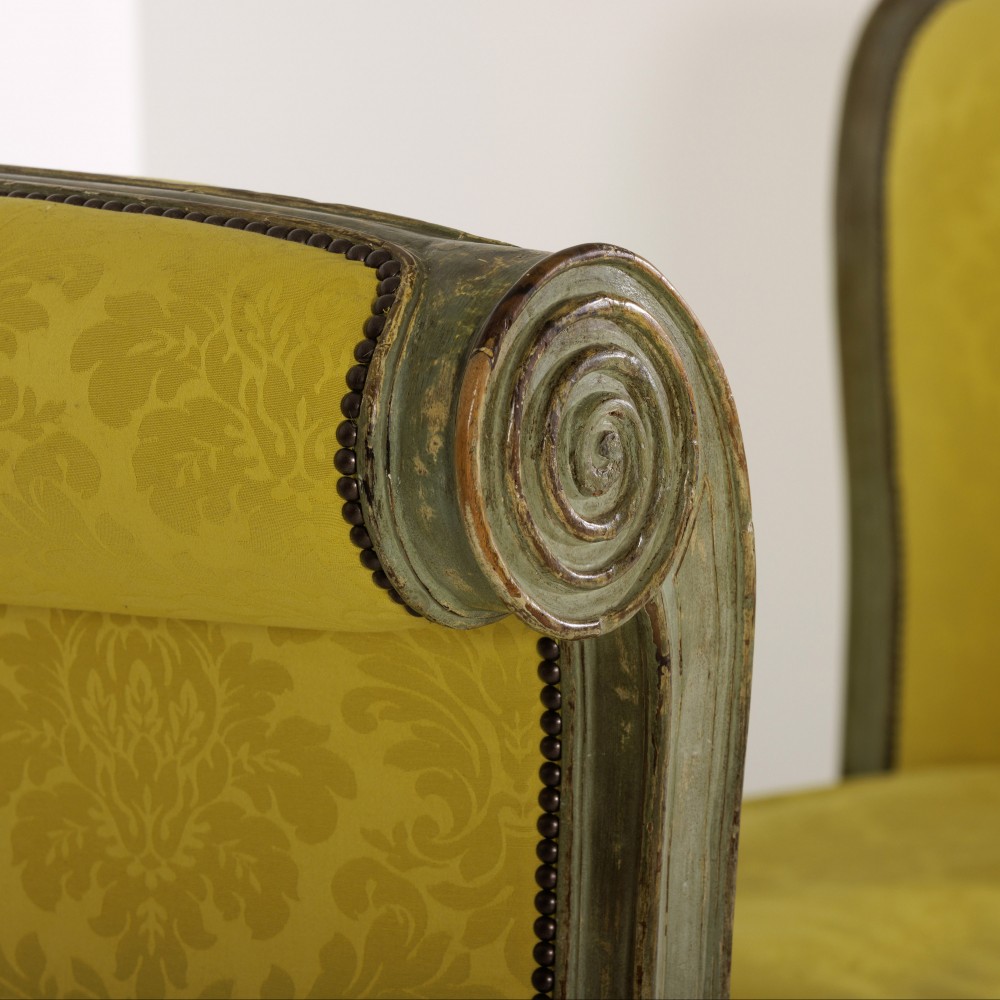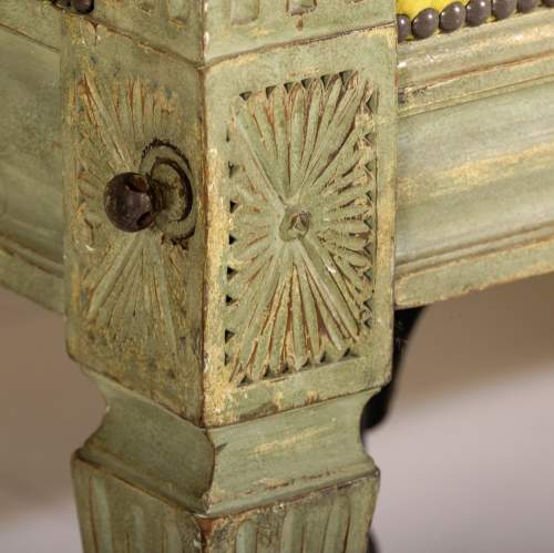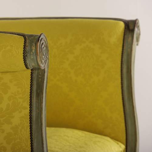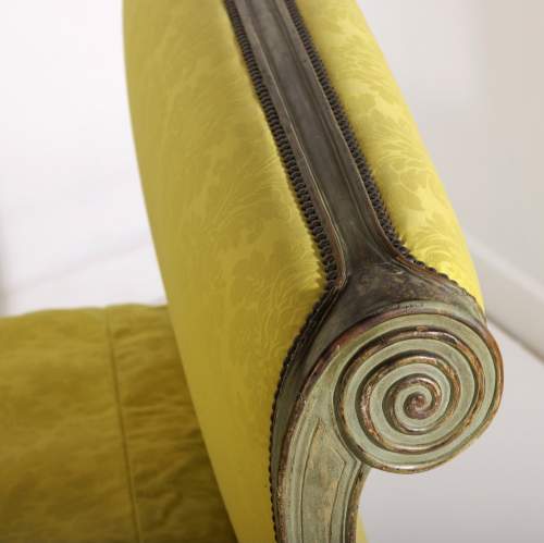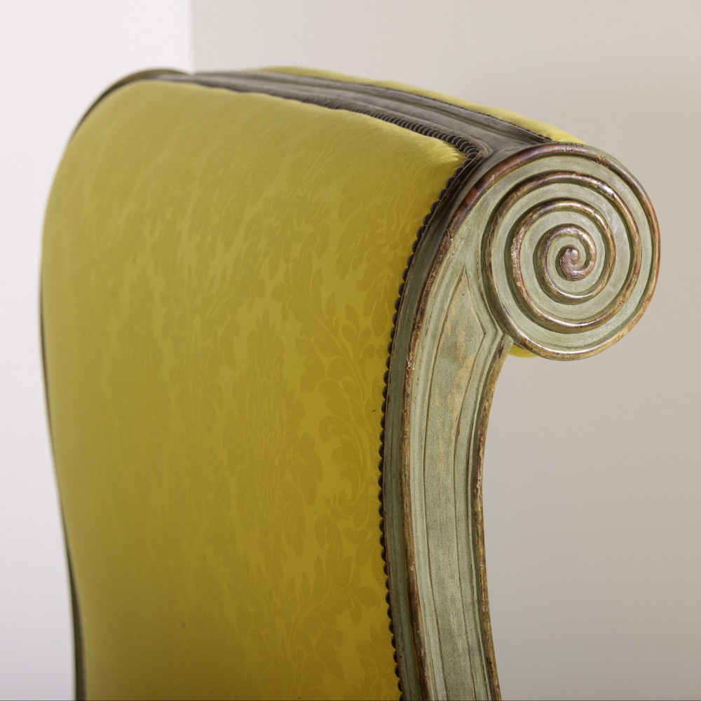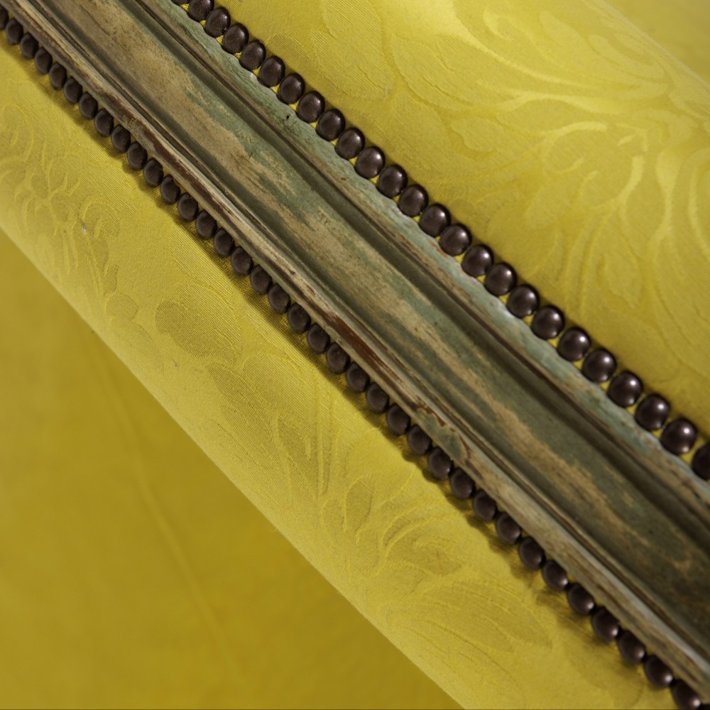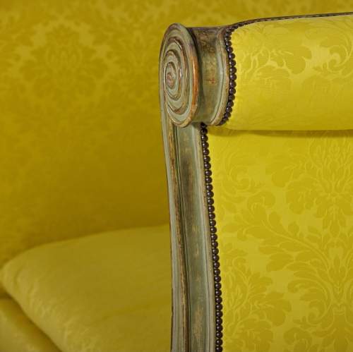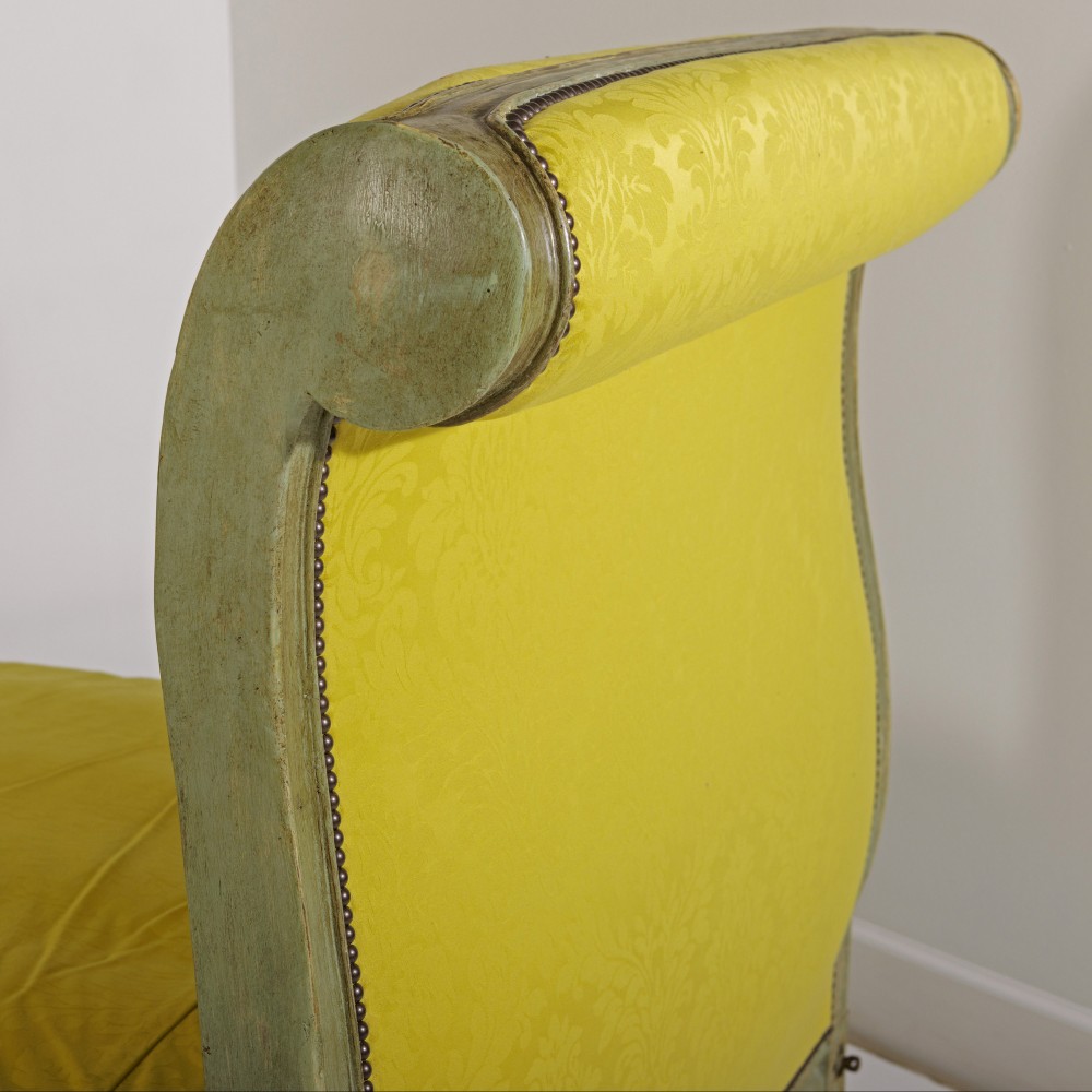 Stock Number: 4301Extraordinary Chateau Lit d'alcove, daybed or alcove bed. Original Eau de Nil Paint. Exuberant carviing. Reupholstered in Chartreuse, as close as possible to the found original. Lignum Vitae wheels France, Circa 1800.