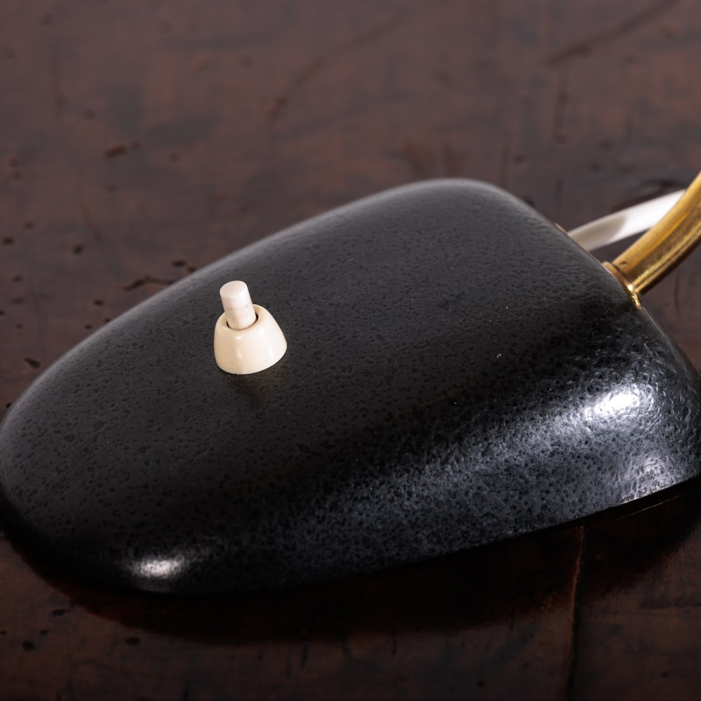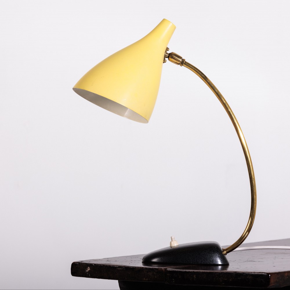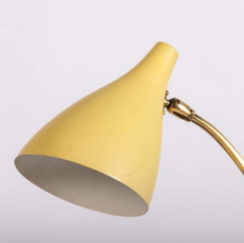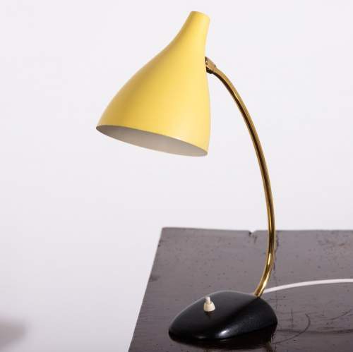 Stock Number: 4571Bauhaus table or desk lamp by Gecos (est 1847). Completely original, excellent pale yellow colourway shade. Sculptural brass arm. Restored and PAT tested Circa 1960. E27 bulb