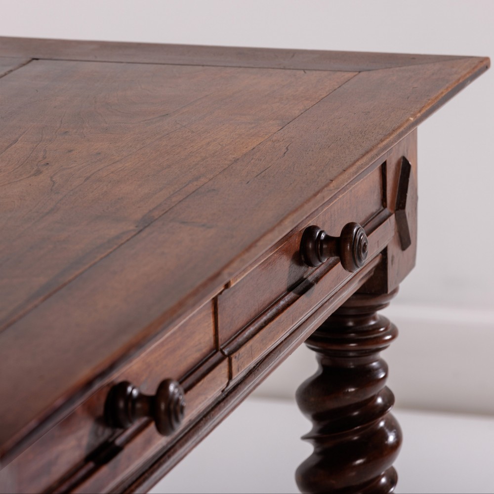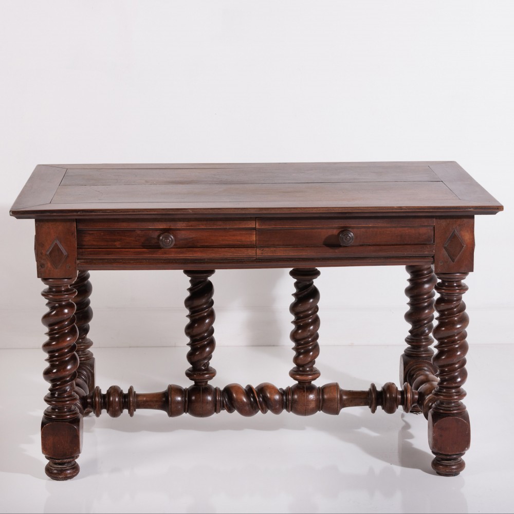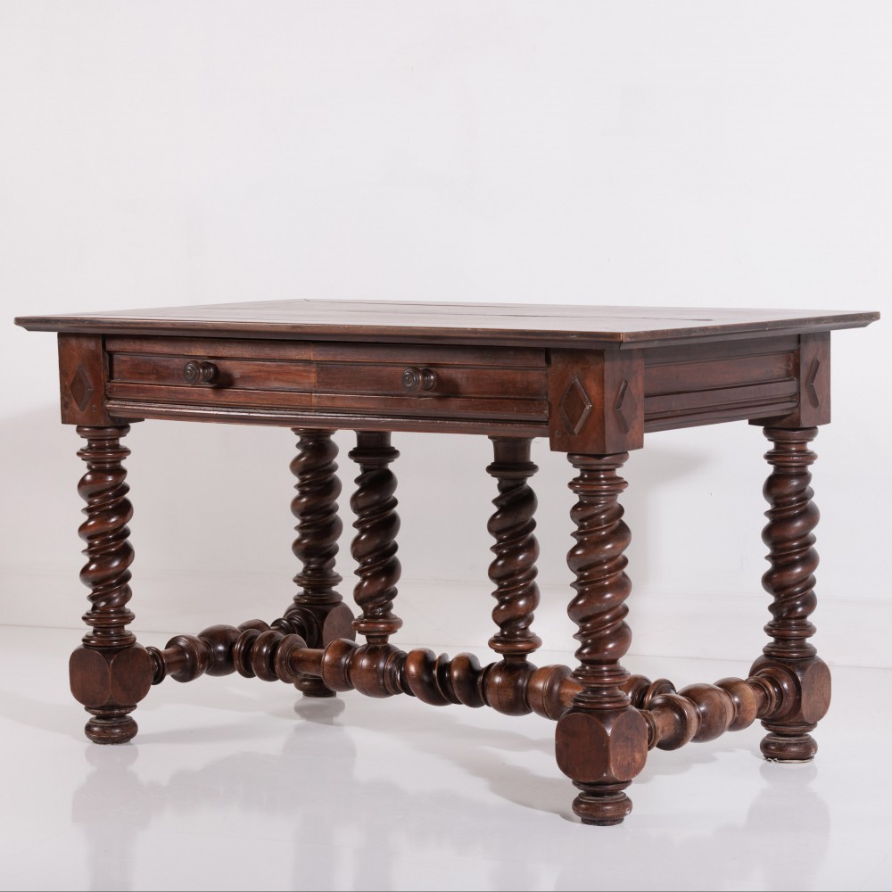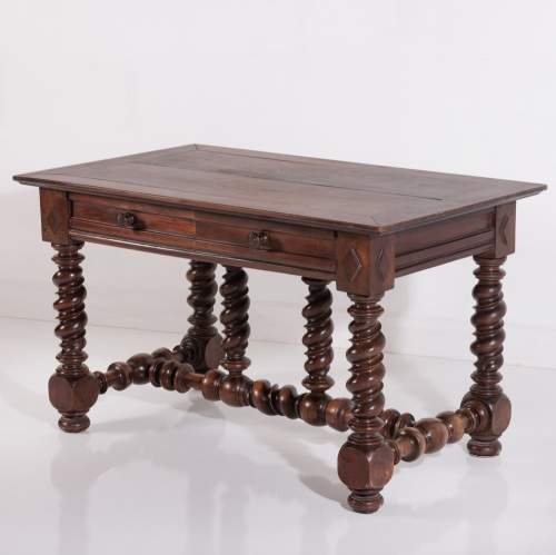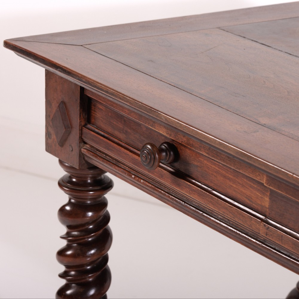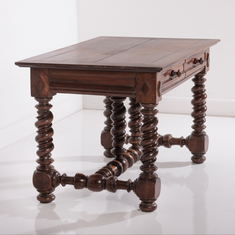 Stock Number: 4580Writing Desk or Console in Walnut in the Louis X111 Style. Excellent patina of the dense tight grain of the walnut, the legs and stretchers are turned into twisting form, each elevated with another interlocking rib creating powerful double torsade effect. Each leg stands on bold, flattened bun feet. The stretchers and two central balusters replicate the pattern of the legs animating and elevating the whole desk. The rectangular top houses two drawers, and lozenge decoration to the corners. The form is bold, classical Louis X111, however the virtuosity of the construction and turning along with the quality of the timber stand this example apart. Walnut, France Circa 1860.