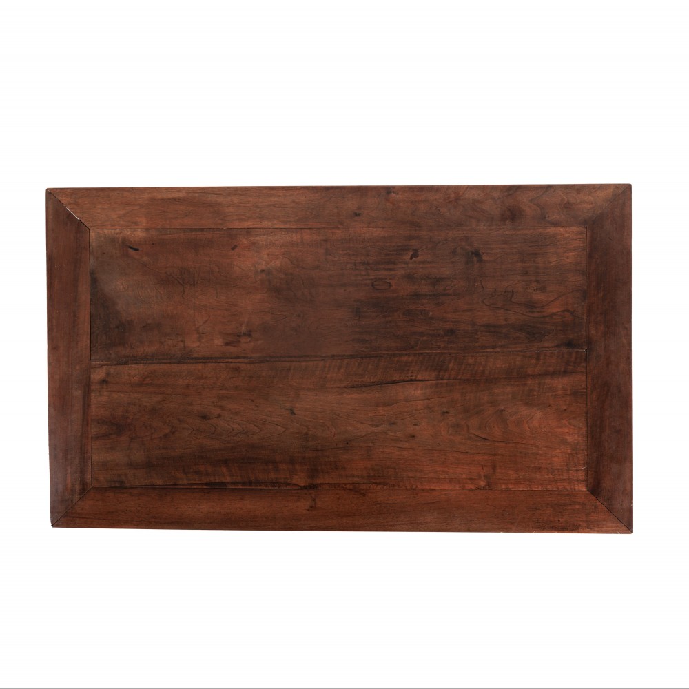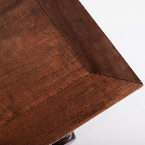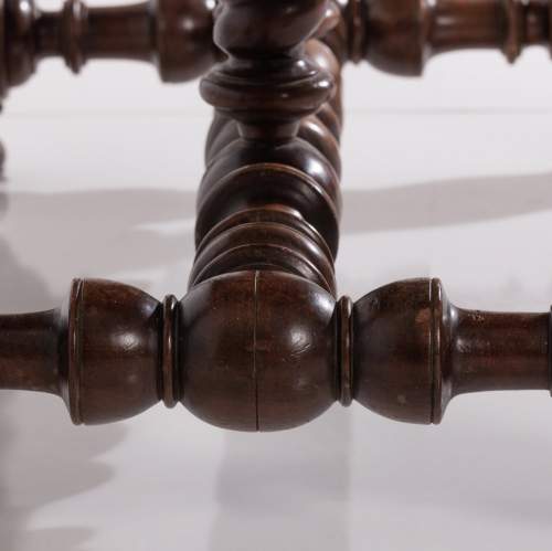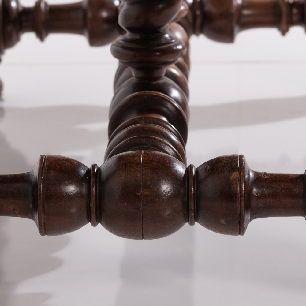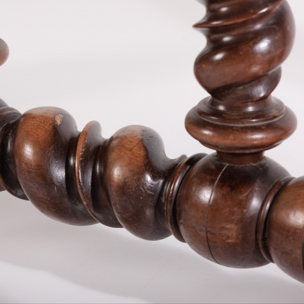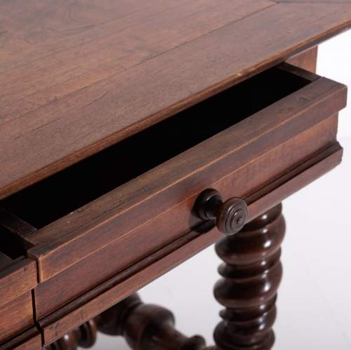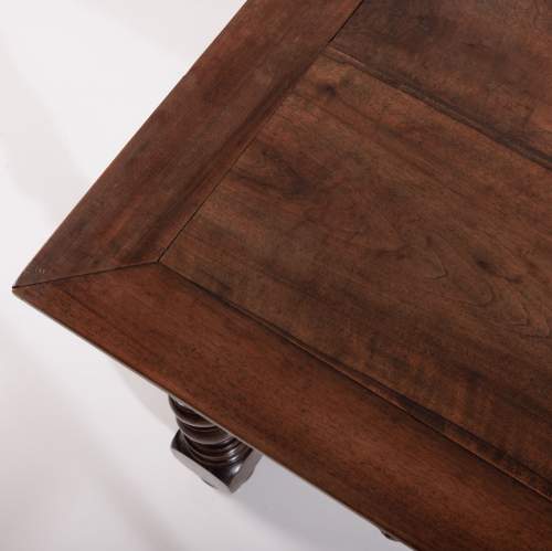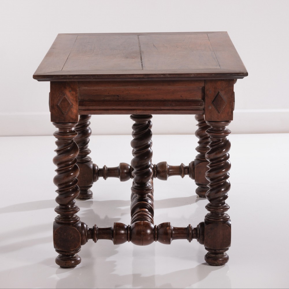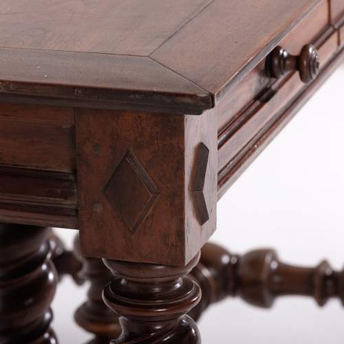 Stock Number: 4580Writing Desk or Console in Walnut in the Louis X111 Style. Excellent patina of the dense tight grain of the walnut, the legs and stretchers are turned into twisting form, each elevated with another interlocking rib creating powerful double torsade effect. Each leg stands on bold, flattened bun feet. The stretchers and two central balusters replicate the pattern of the legs animating and elevating the whole desk. The rectangular top houses two drawers, and lozenge decoration to the corners. The form is bold, classical Louis X111, however the virtuosity of the construction and turning along with the quality of the timber stand this example apart. Walnut, France Circa 1860.