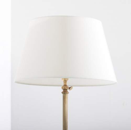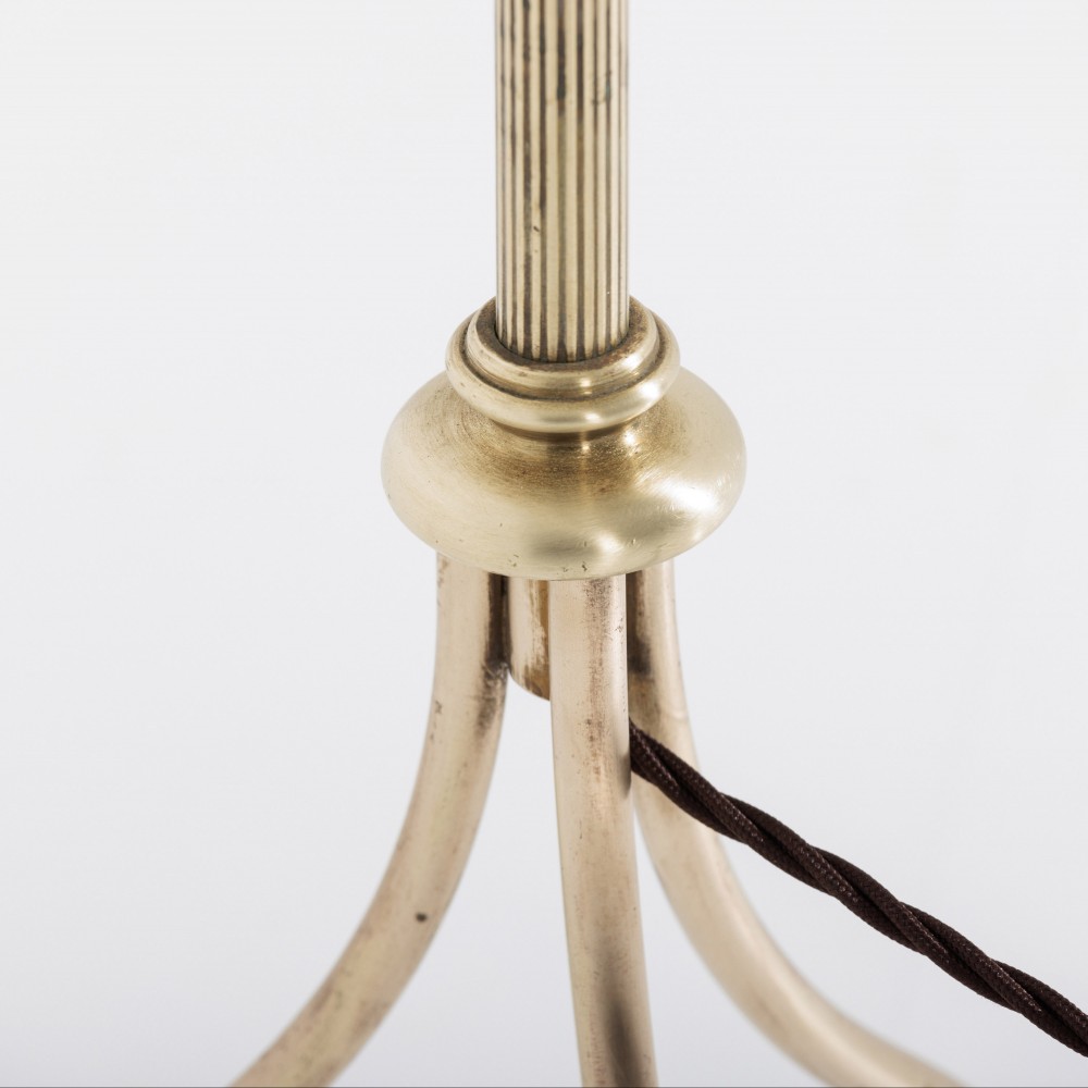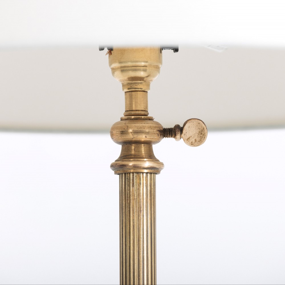 Stock Number: 4593Unusual, elegant adjustable brass floor lamp. Reeded brass column above elegant shapley tripod legs and hoof foot base, excellent crisp casting. Lightly patinated. Most likely Maison Jansen Rewired in antique style flex, PAT tested. Gilt Brass, France, Circa 1950