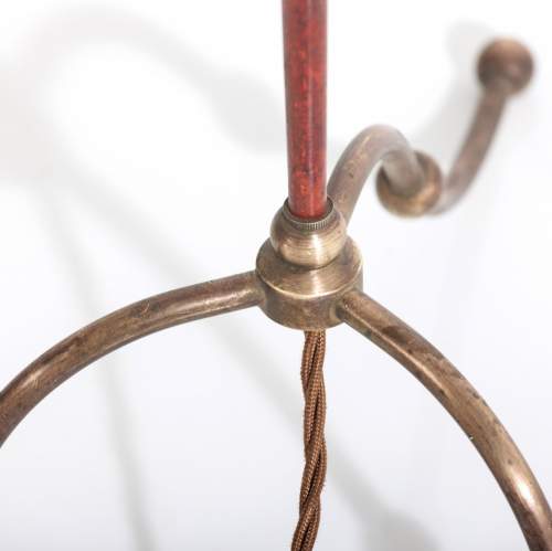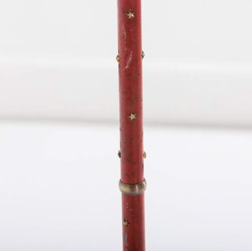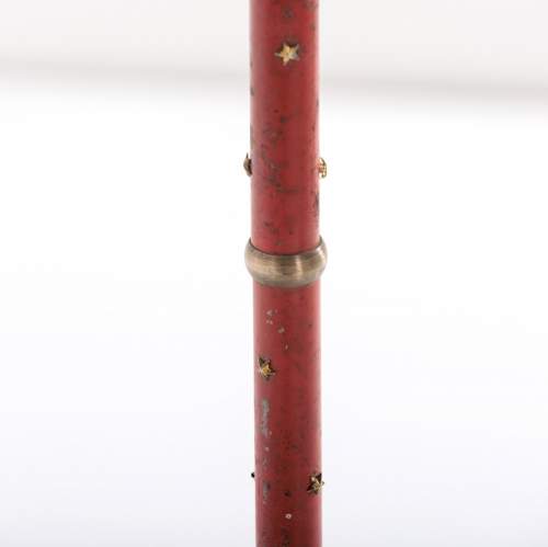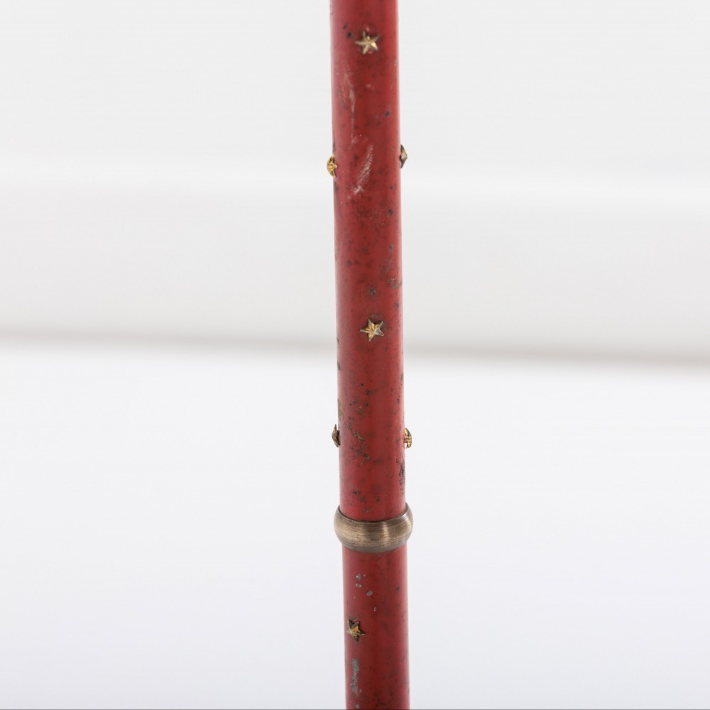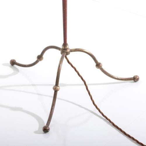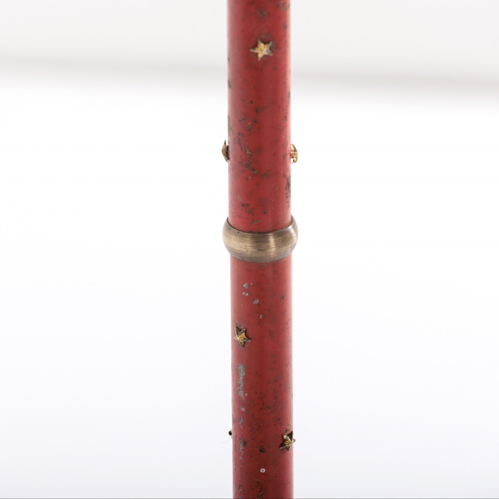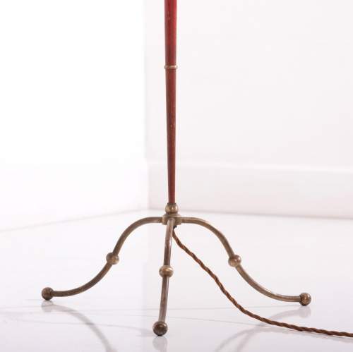 Stock Number: 4598Elegant Mid Century red floor lamp, patinated brass rings and stars as decoration. Elegant fusiform stem in lightly worn red finish. Standing on tripod legs with ball feet. Understated elegance. Shades not included Rewired and PAT tested. France, Circa 1950