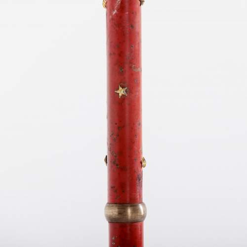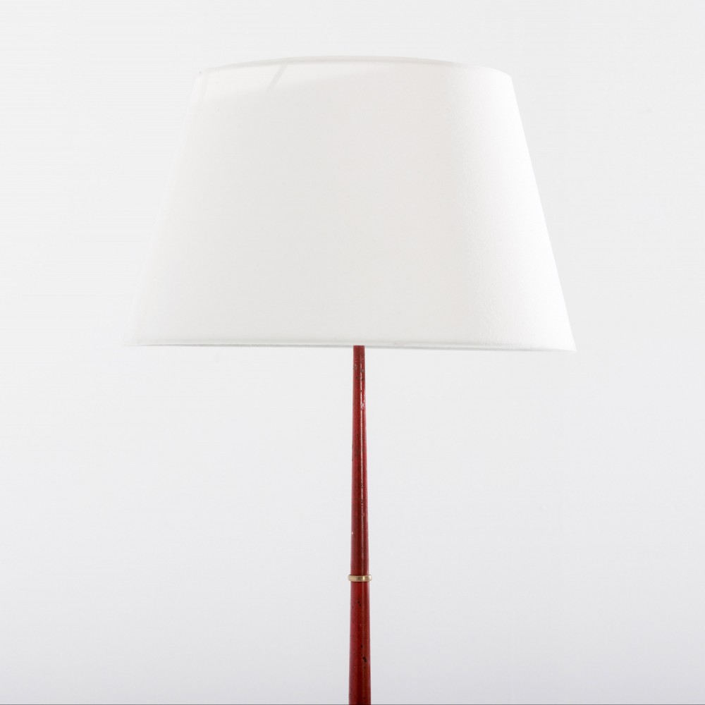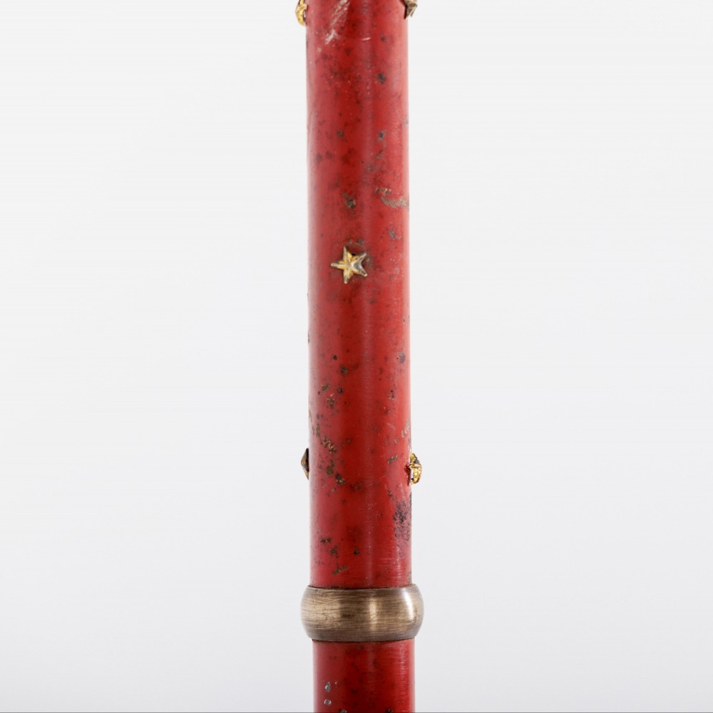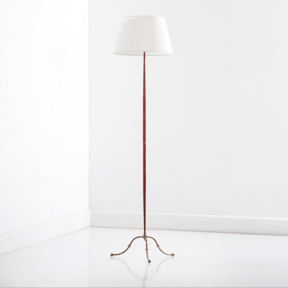 Stock Number: 4598Elegant Mid Century red floor lamp, patinated brass rings and stars as decoration. Elegant fusiform stem in lightly worn red finish. Standing on tripod legs with ball feet. Understated elegance. Shades not included Rewired and PAT tested. France, Circa 1950