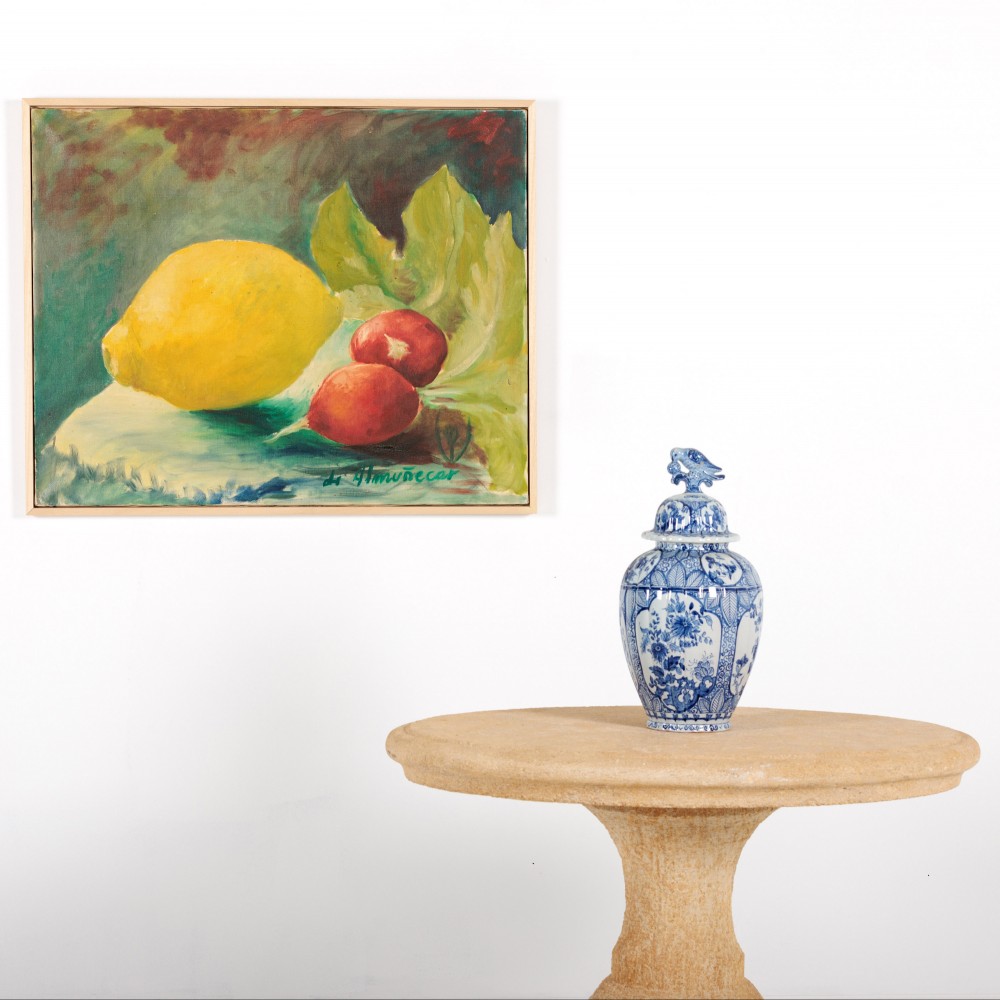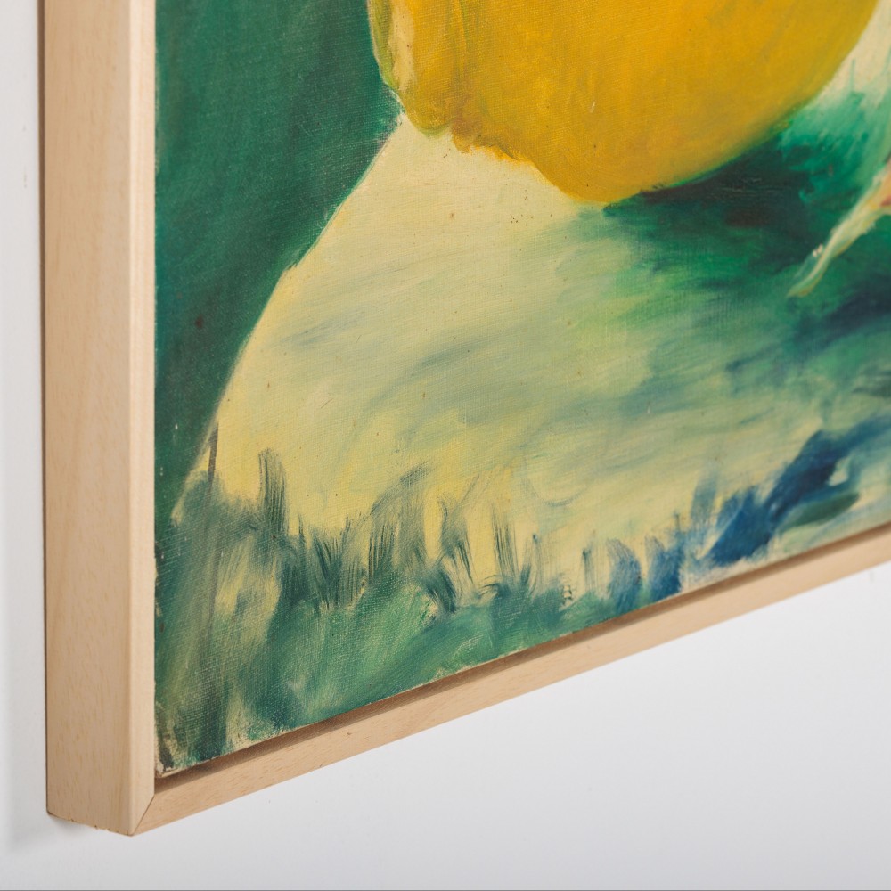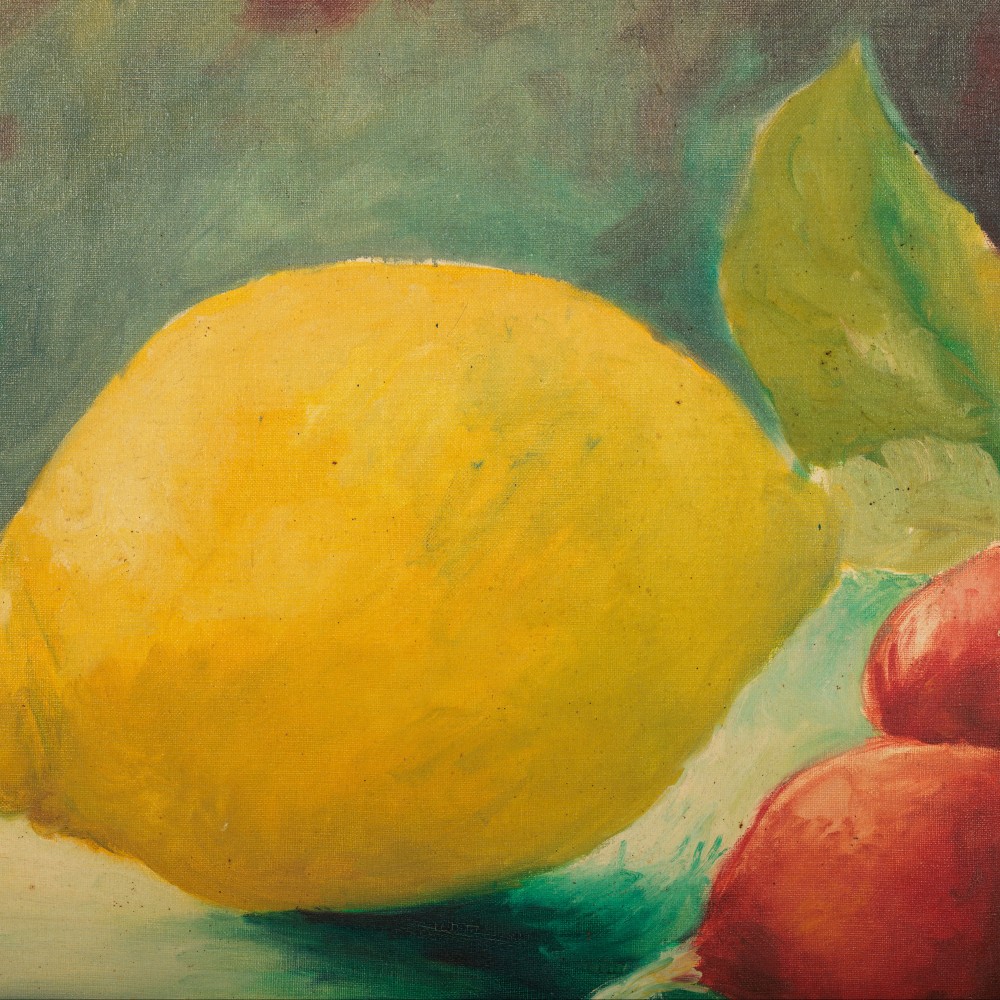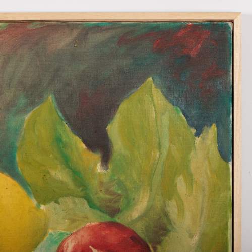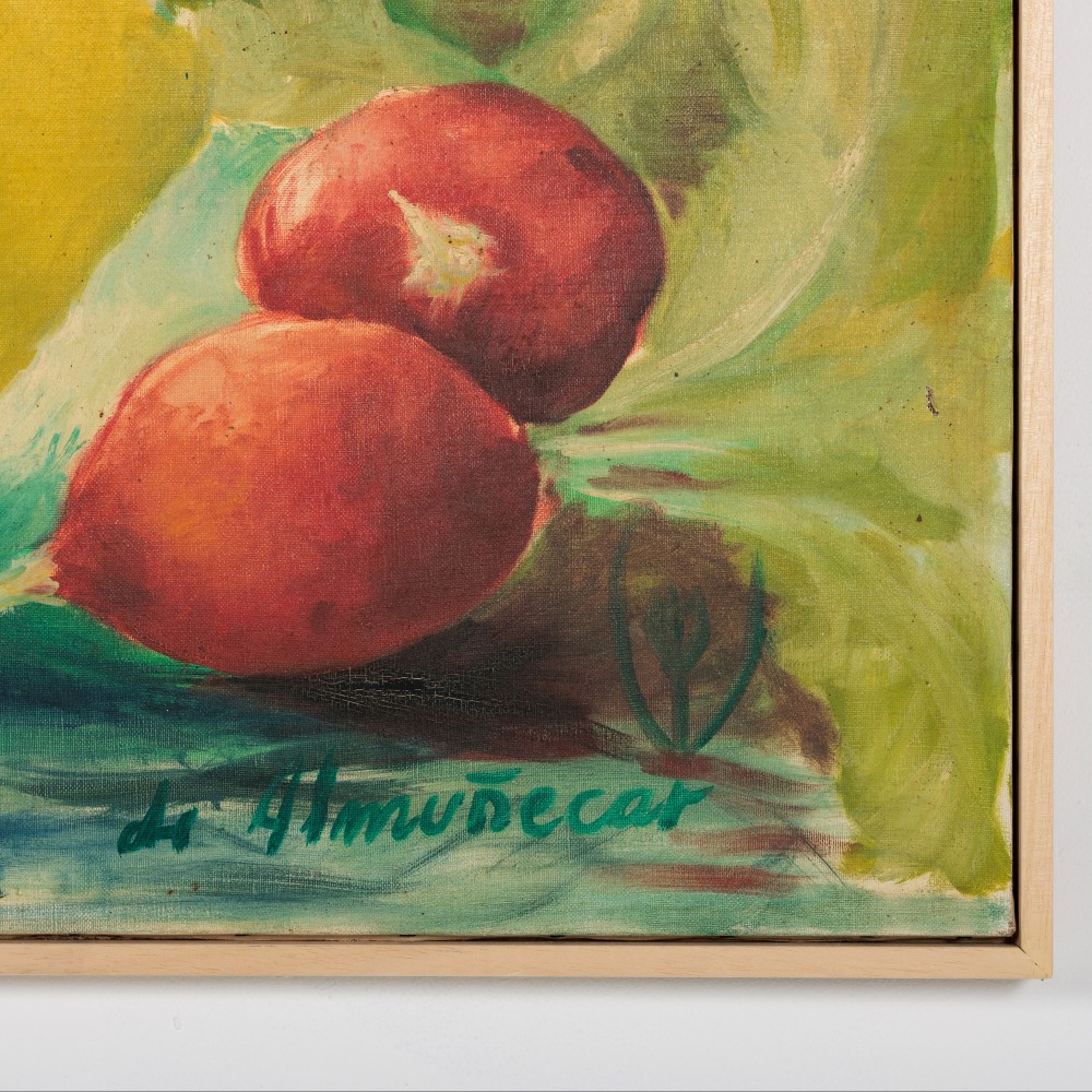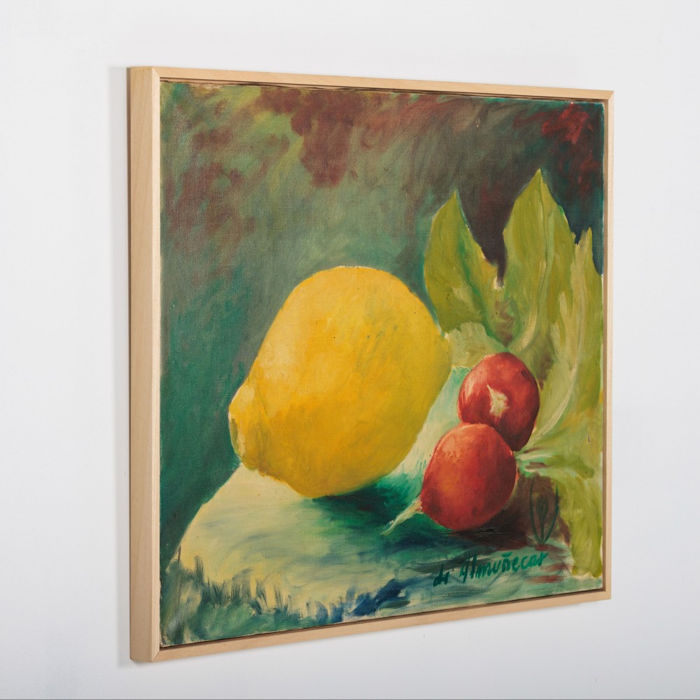 Large Oil on Canvas Still Life of Lemon & Radish. Bold and vibrant Signed Almunecar Spain, Circa 1950.