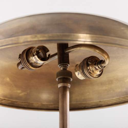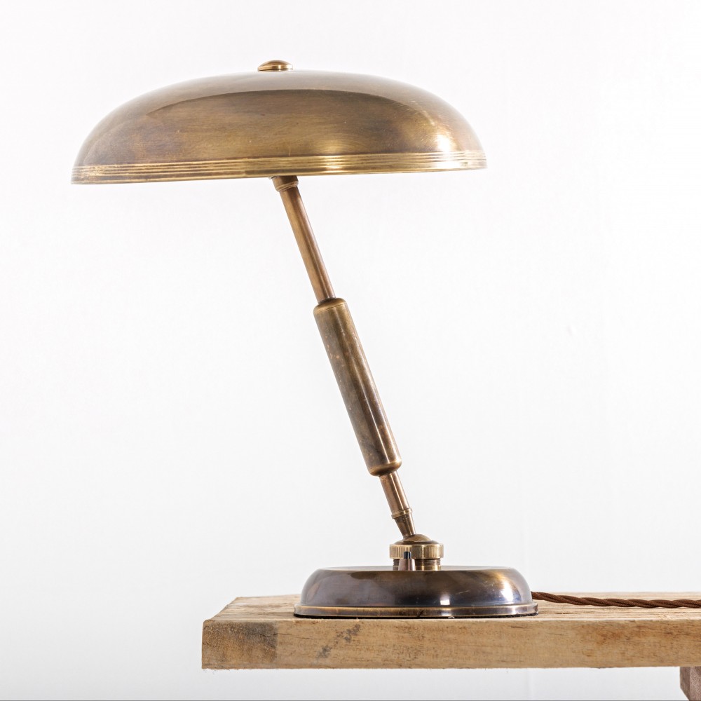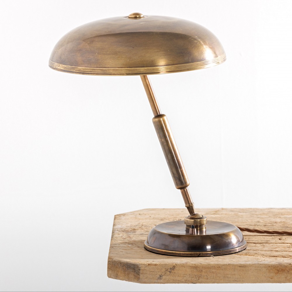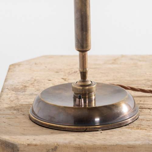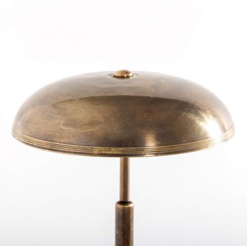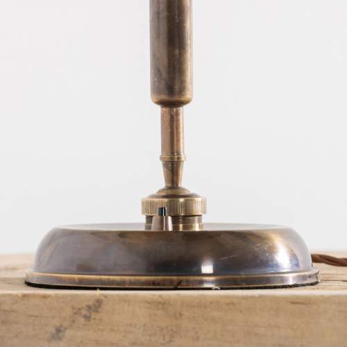 Stock Number: 4569Elegant lamp designed by the architect Giovanni Michelucci and made in 1940 by Lariolux. It is a striking example of the Italian architect's mastery of form and material. The warm aged patina of the brass surface exudes a rich character. Michelucci, known for blending organic shapes with modernist principles. The lamp has clearly been made with both function and artistry in mind and embodies Michelucci's ability to transform everyday items into enduring works of design. It is 360 degrees adjustable thanks to the ingenious ball joint at its base, with a simple screw mechanism to fix it in place. This example has a double bulb holder under the shade. Rewired with antique style flex and PAT tested. Italy.