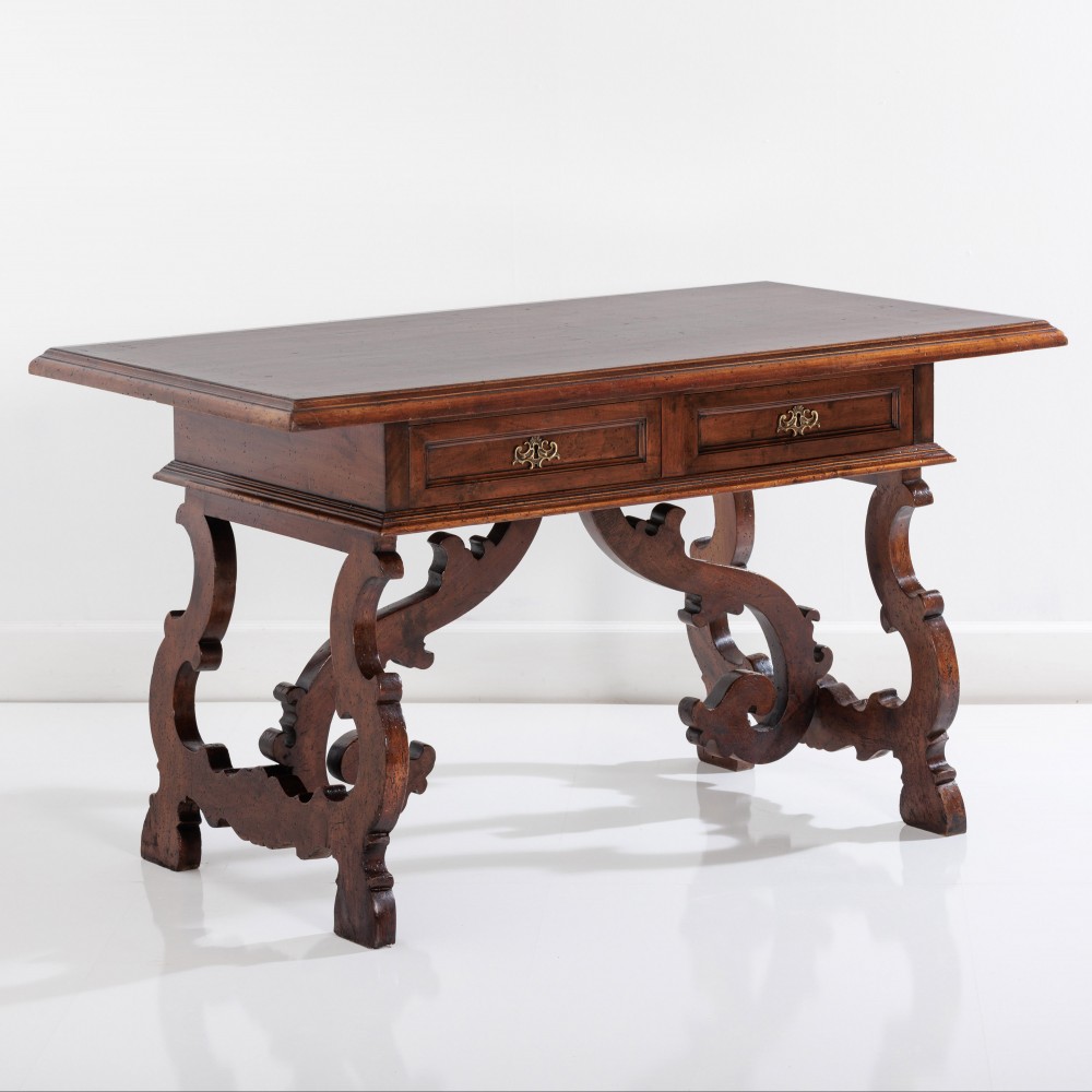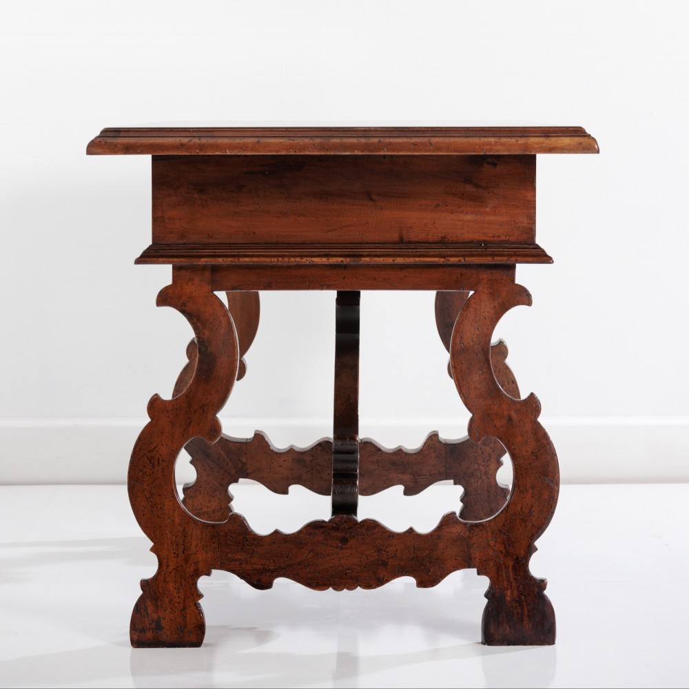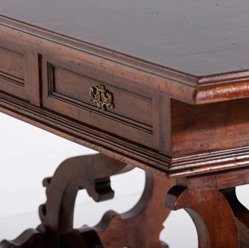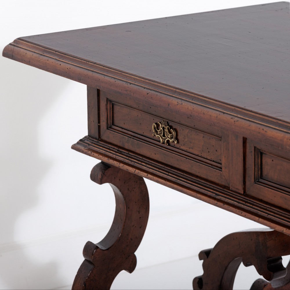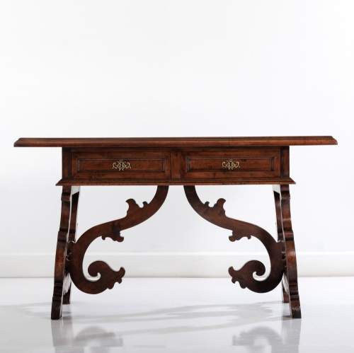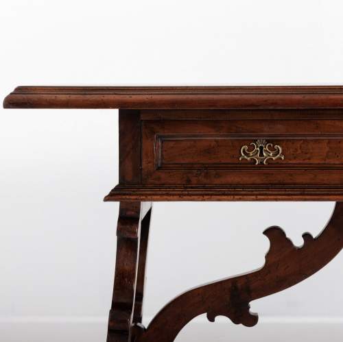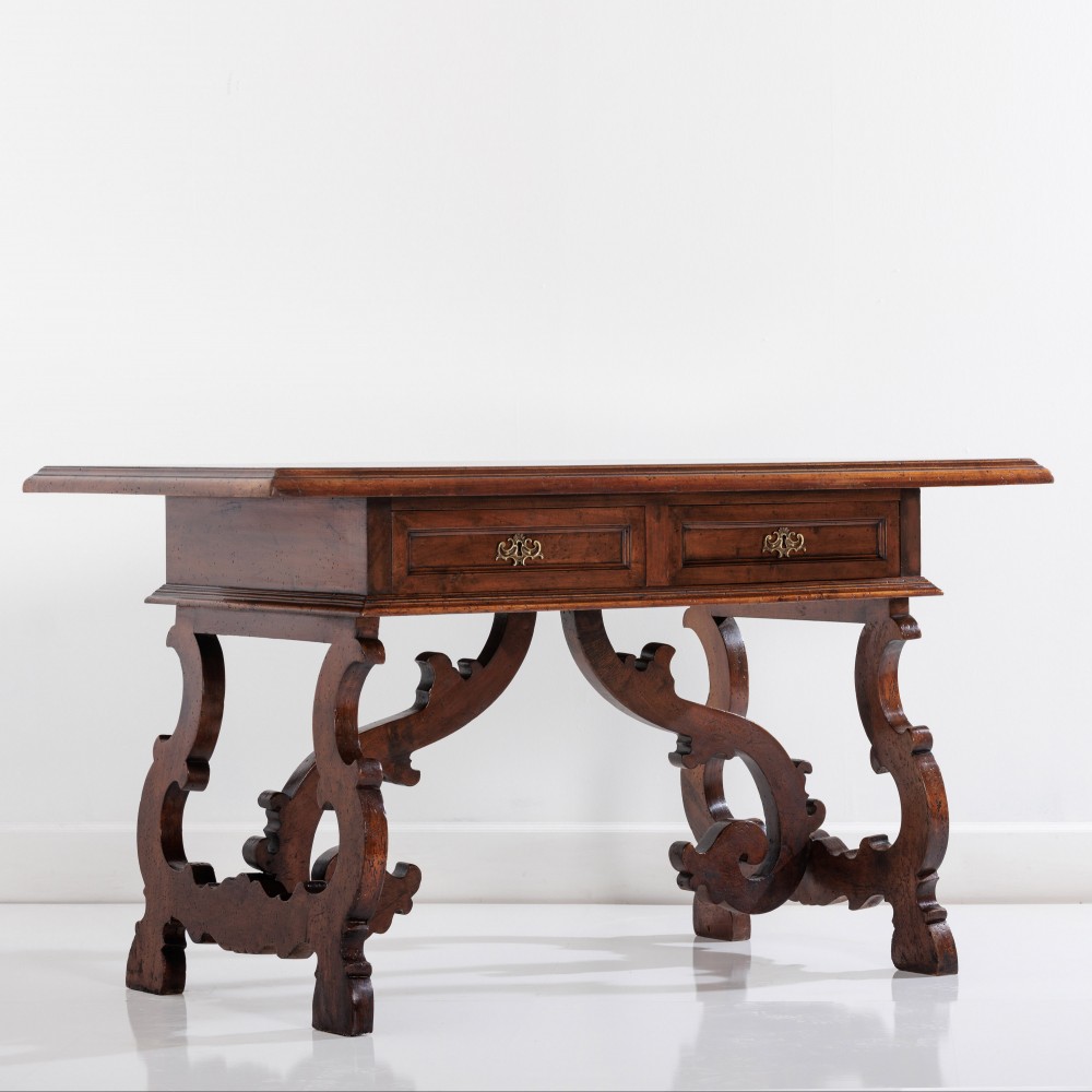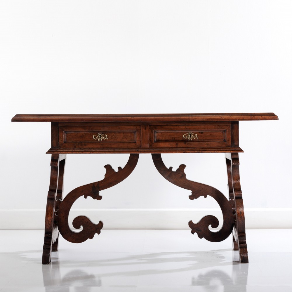Stock Number: 4578Italian Walnut Desk or Console Smart Late 19th or Early 20th Century Italian Walnut desk or console. Thick Single plank top with wonderful warm patination and colour. Lyre shape legs and elaborate walnut stretcher supports. Some Historical evidence worm. Italy, Circa 1900.