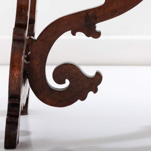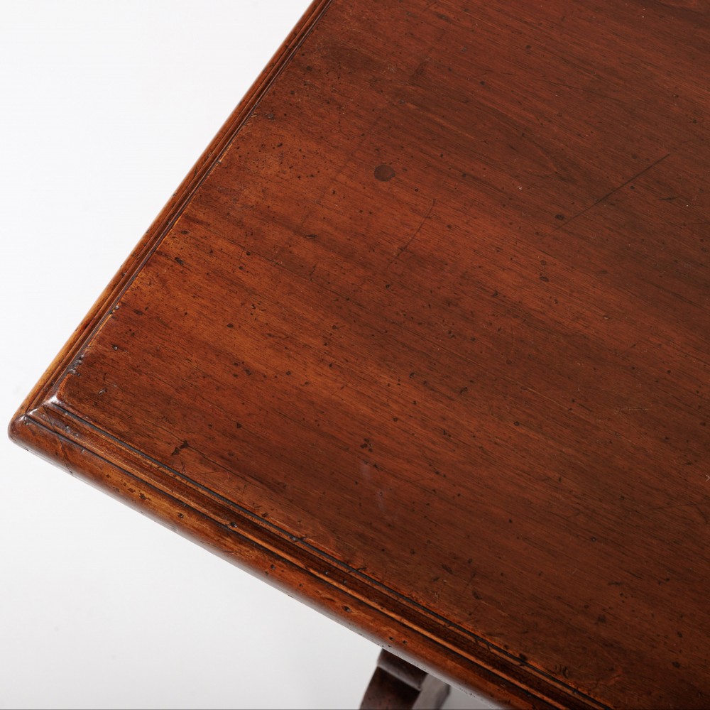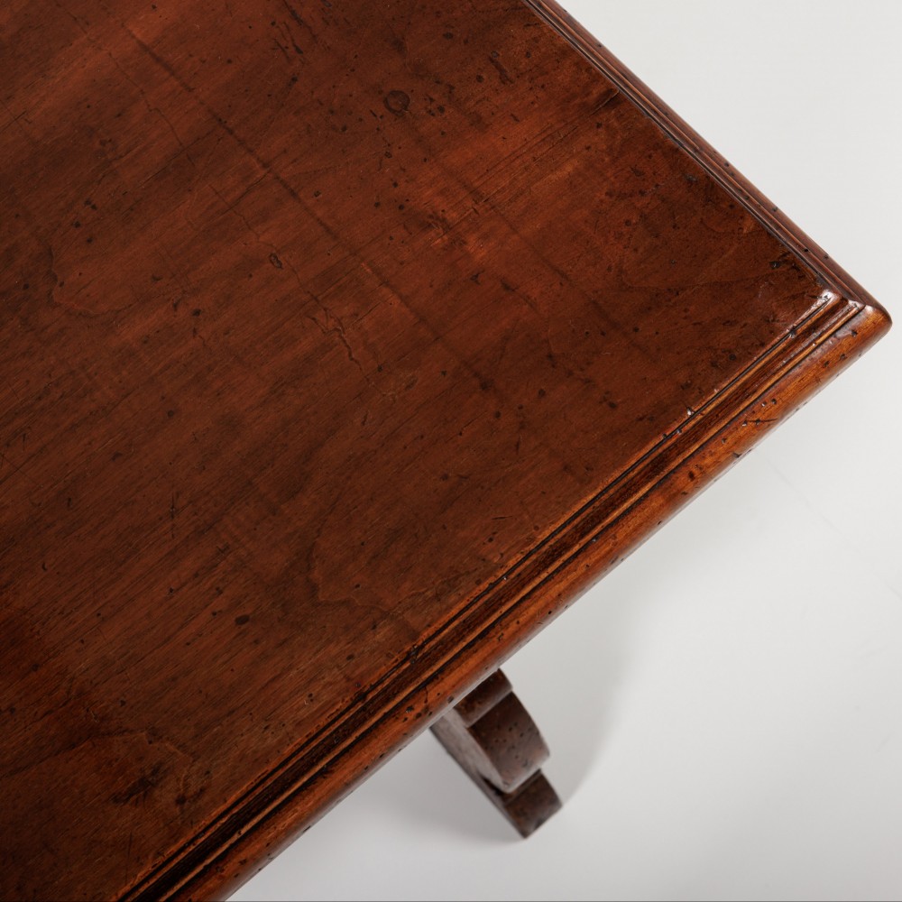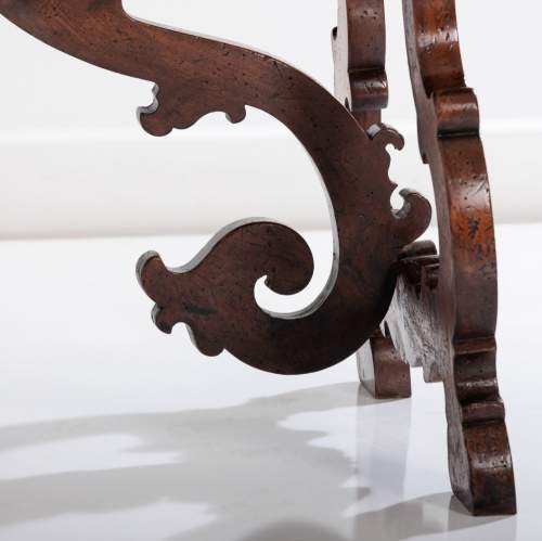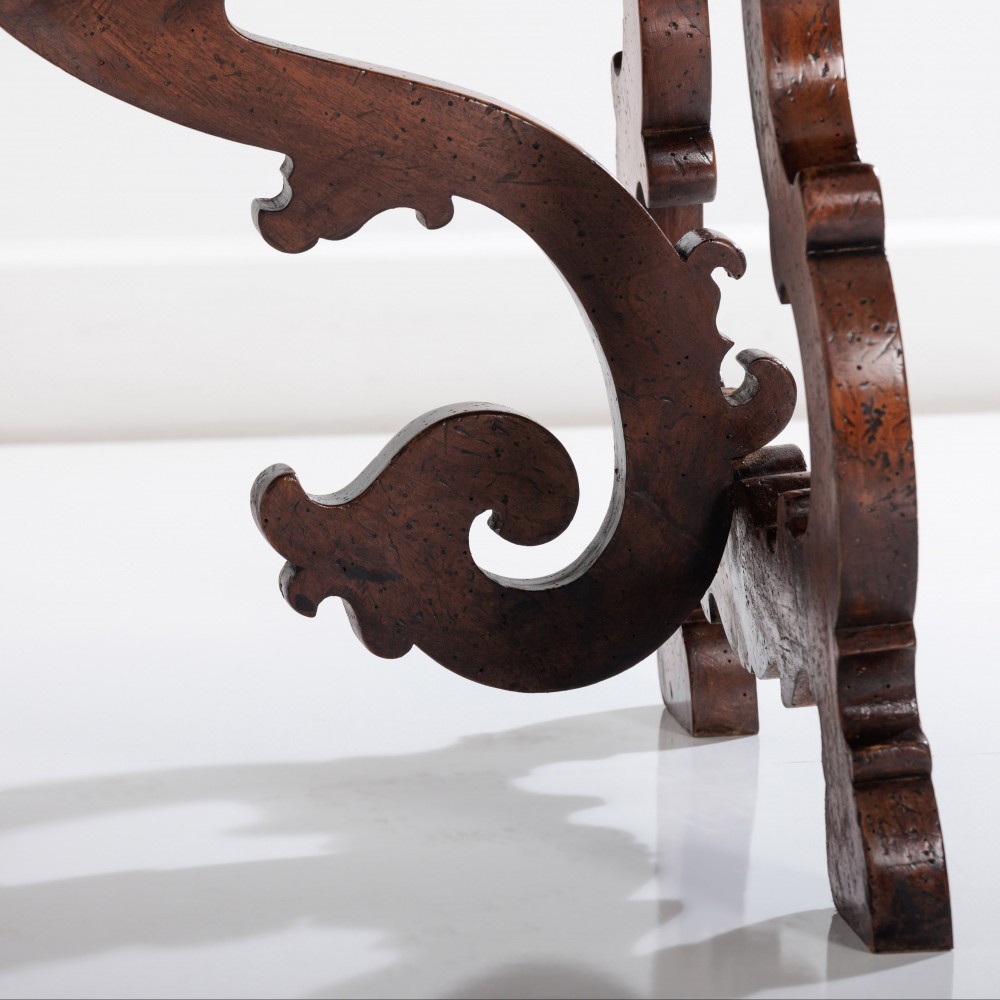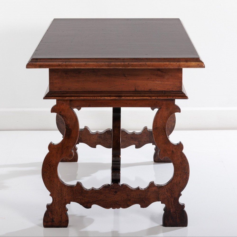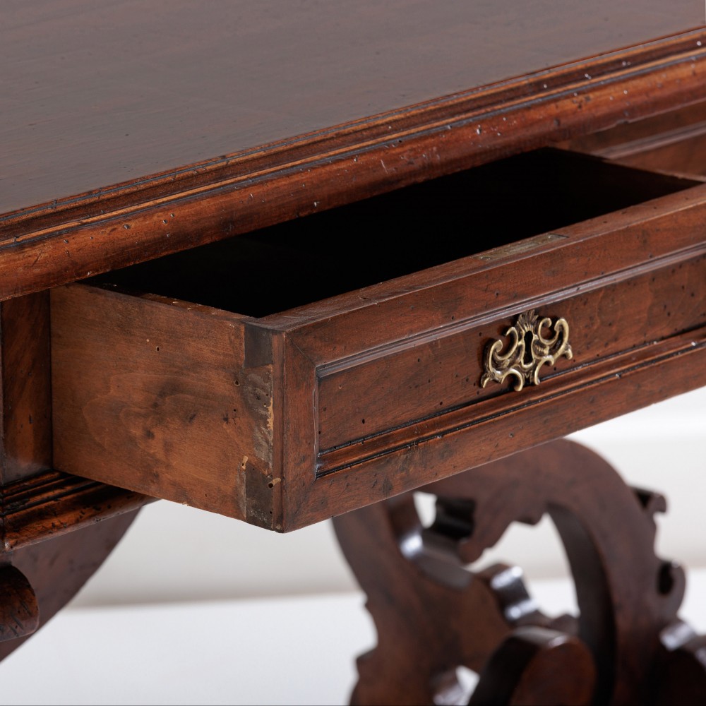 Stock Number: 4578Italian Walnut Desk or Console Smart Late 19th or Early 20th Century Italian Walnut desk or console. Thick Single plank top with wonderful warm patination and colour. Lyre shape legs and elaborate walnut stretcher supports. Some Historical evidence worm. Italy, Circa 1900.