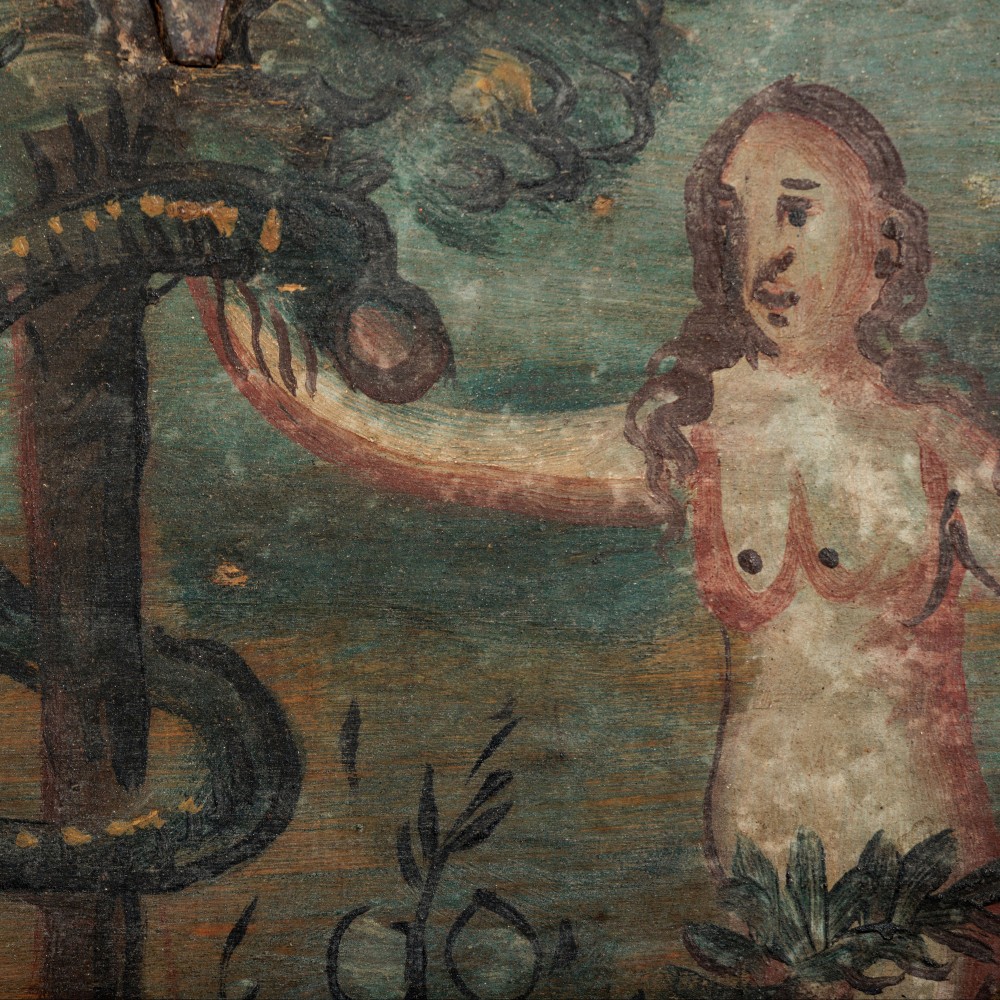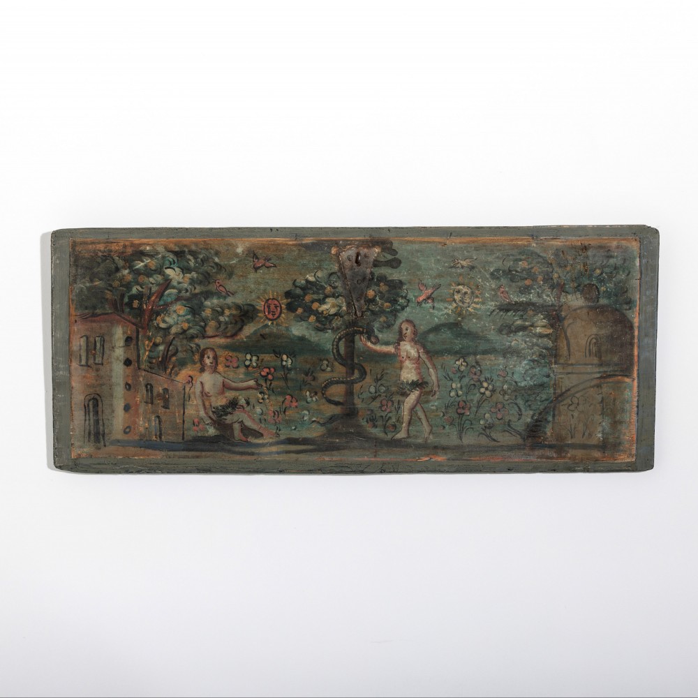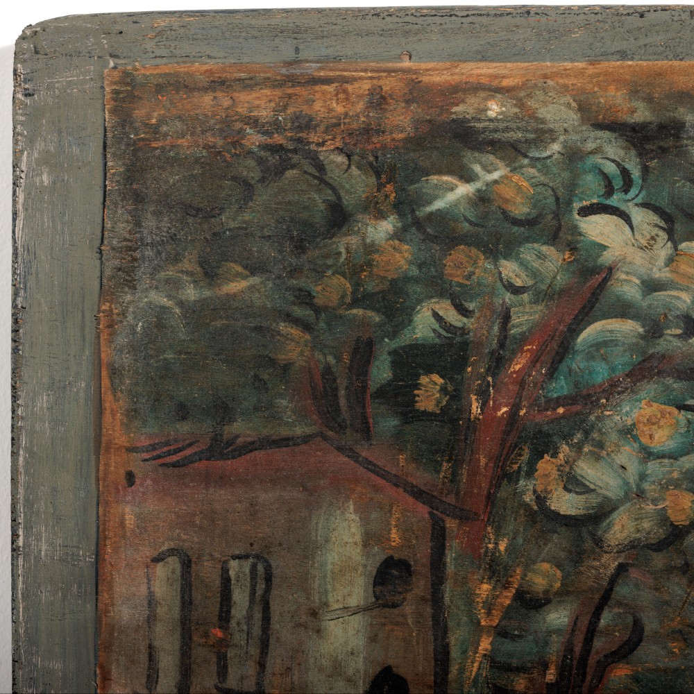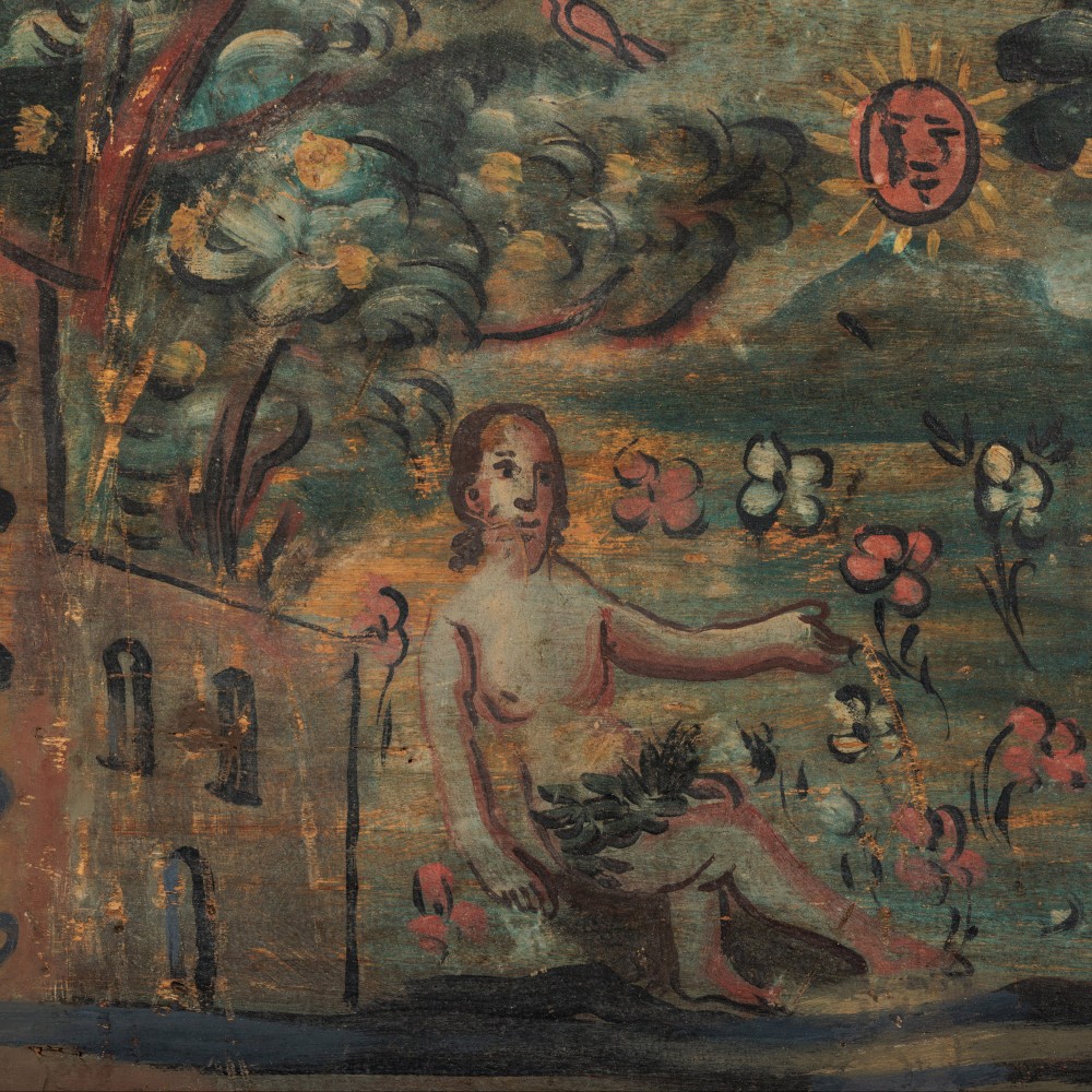 Stock Number: 4375aNaive 18th Century Painting of the Garden of Eden Originally the interior lid of a trunk, has meant the image is beautifully preserved. Dry untouched surface France Circa 1780.
