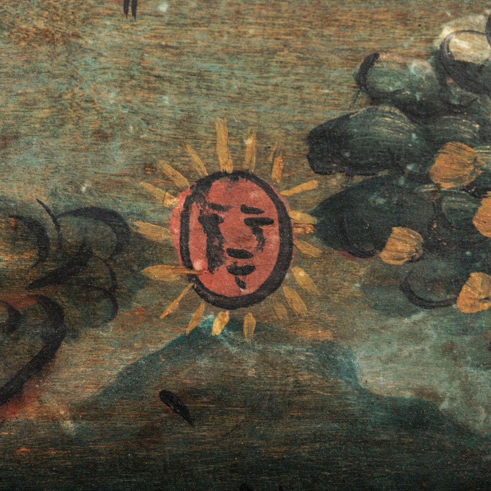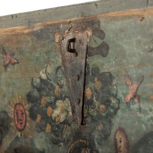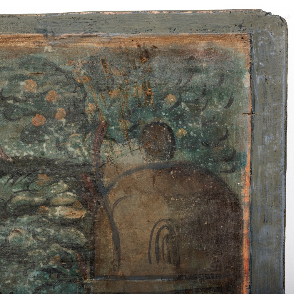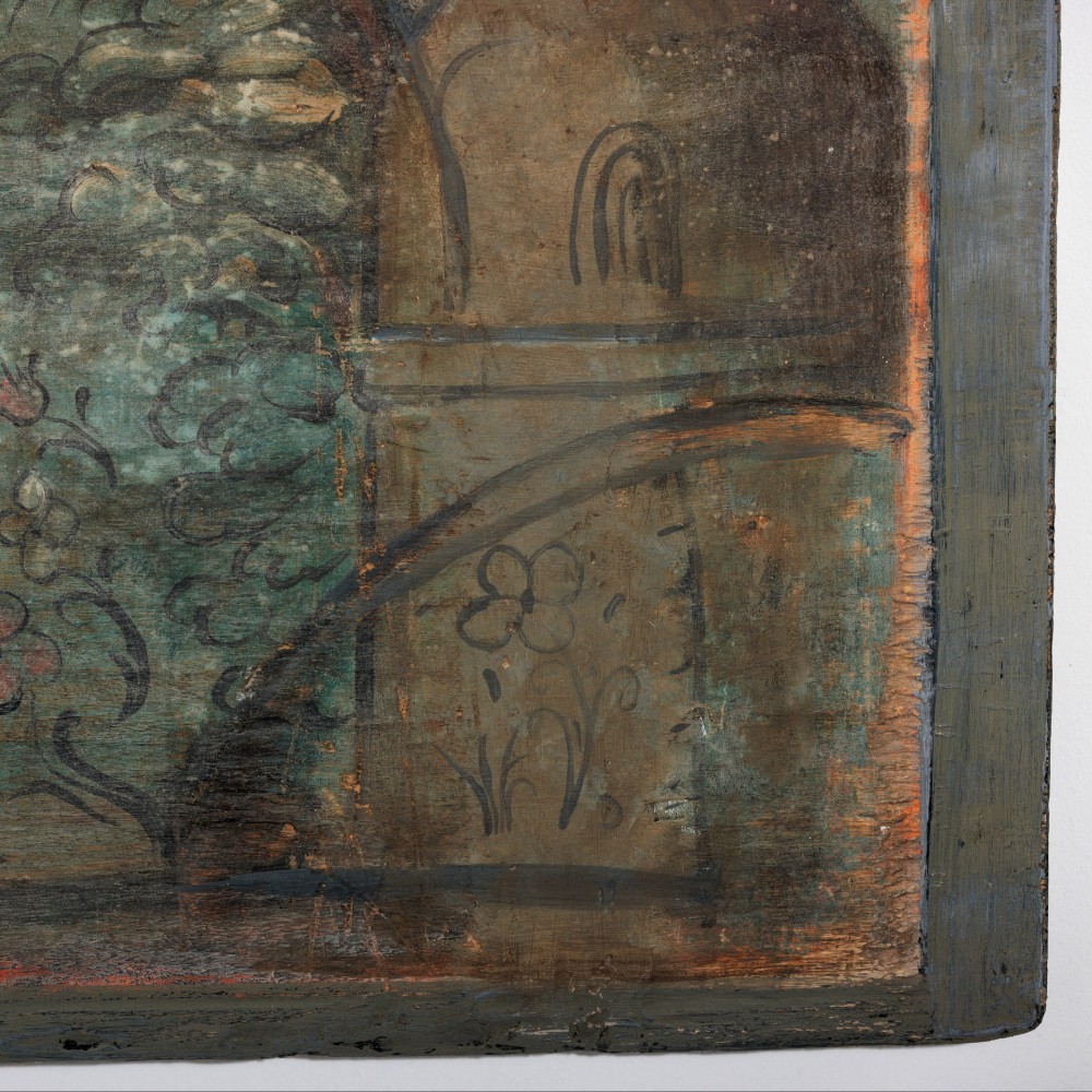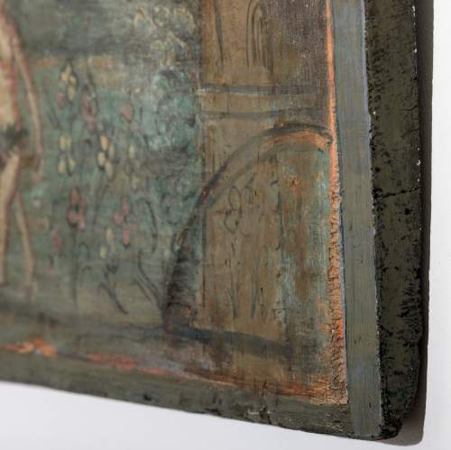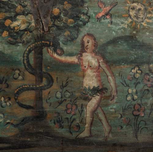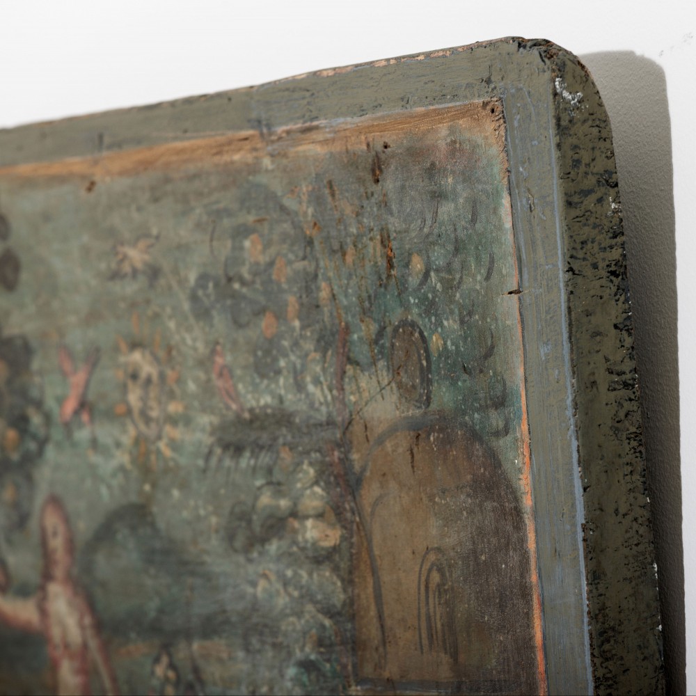Stock Number: 4375aNaive 18th Century Painting of the Garden of Eden Originally the interior lid of a trunk, has meant the image is beautifully preserved. Dry untouched surface France Circa 1780.