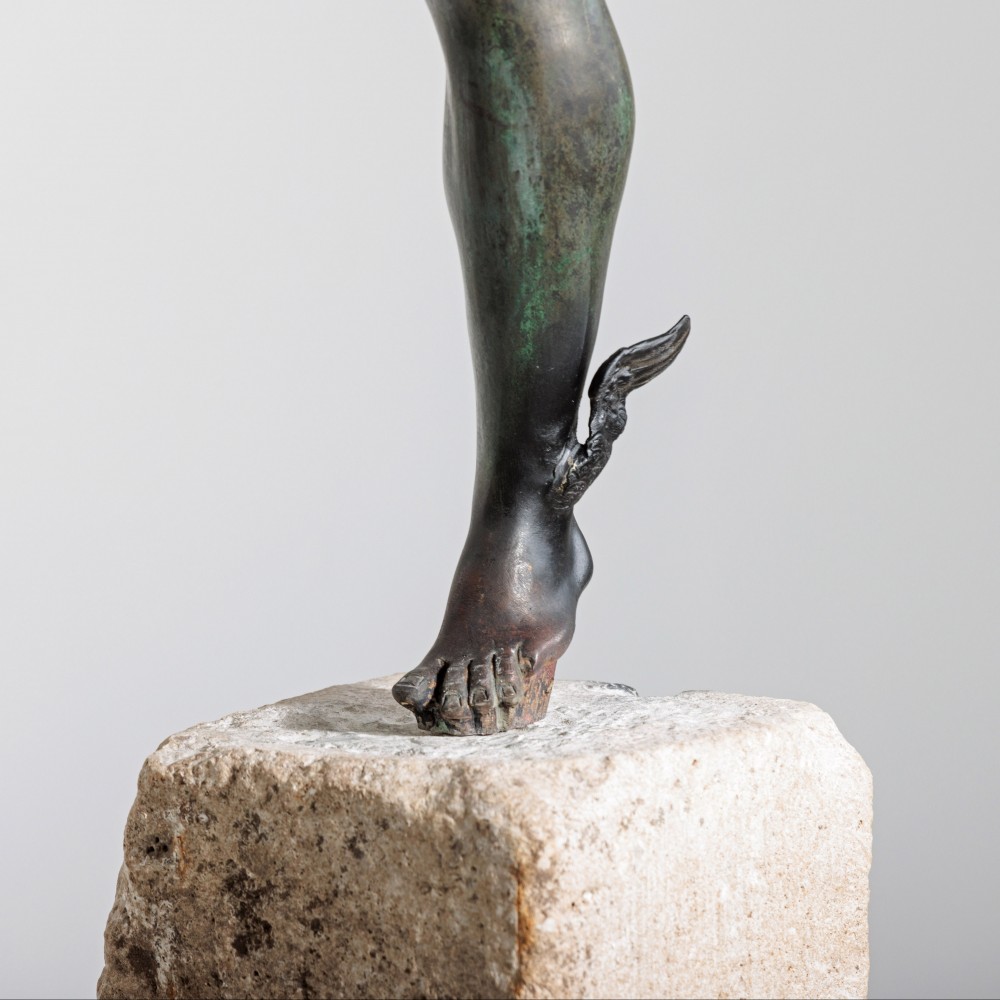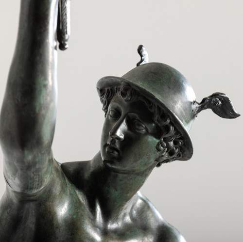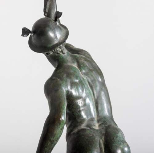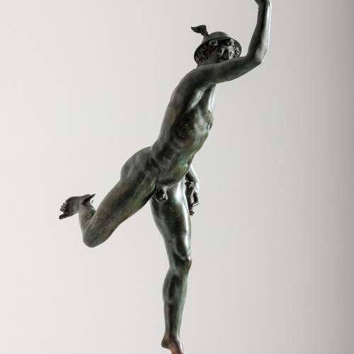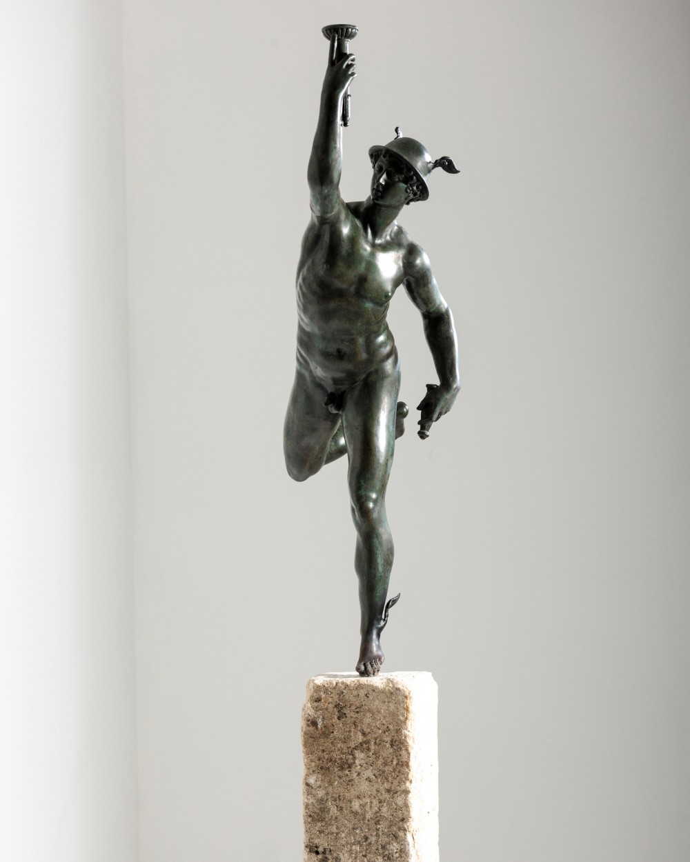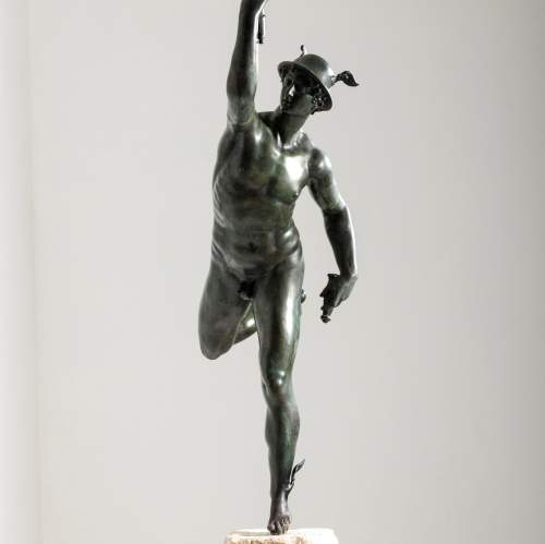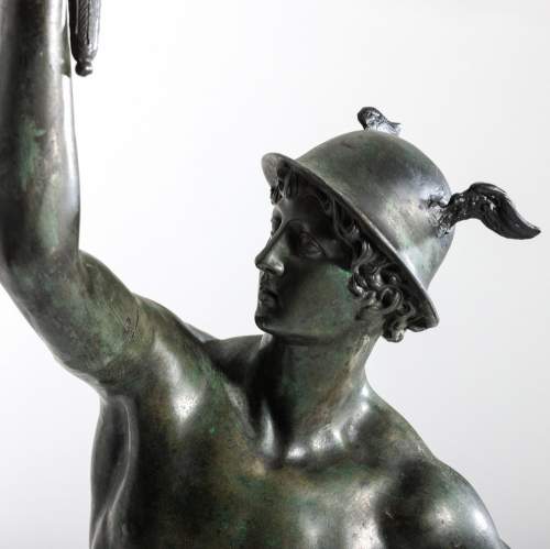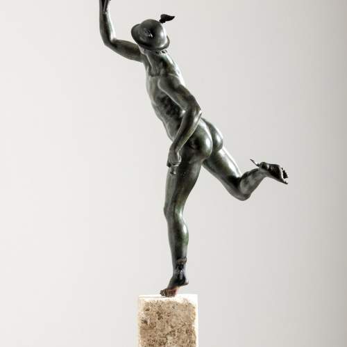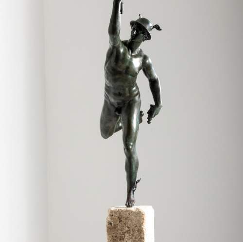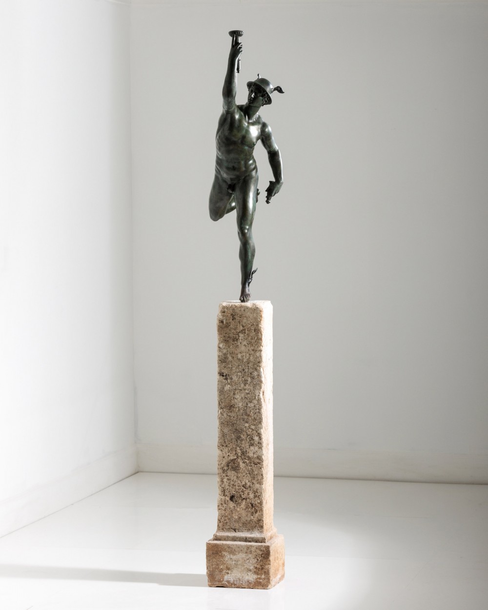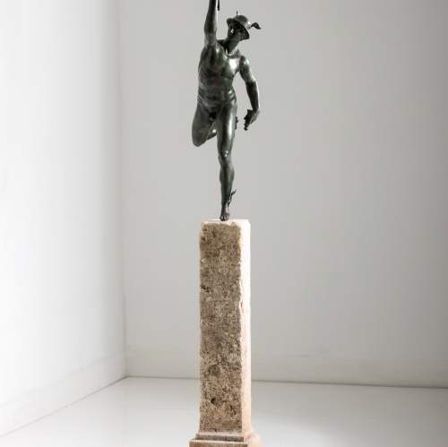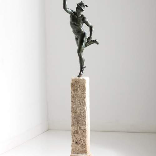 Stock Number: 4575Impressive Late 19th Century Bronze of Mercury on a carved stone plinth An exceptional grand tour bronze figure of Mercury, masterfully captured in a dynamic, mid motion pose and raised on an impressive stone plinth. This striking sculpture embodies the classical elegance and movement associated with the messenger god, making it a commanding statement piece for both interior and garden settings. The figure of Mercury is depicted in dramatic, airborne stance, balancing effortlessly on one leg while the other lifts behind, conveying a remarkable sense of lightness and motion. The finely cast bronze surface displays excellent detail and anatomical precision. Predominantly rich dark patina with wonderful tints of authentic verdigris patintion showing developing a beautiful surface tone that enhances its depth and highlights the sculptural detail. The sculpture is mounted (currently removable) on a substantial, elegant stone plinth, providing stability and enhancing its architectural presence. The weathered texture and natural variation of the stone not only will enhance over time, both also compliment the bronze above. A superb and imposing piece suitable for interior or garden display. Ideal for collectors of classical sculpture or anyone seeking a bold and elegant focal point with enduring historic appeal. Italy Circa 1890. Bronze 100cm High Stone Column 104cm high, Base 25cm x 25cm