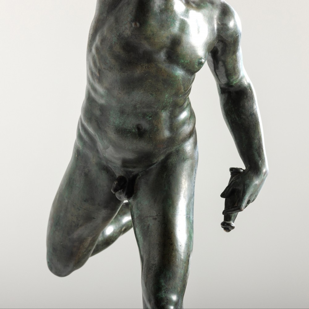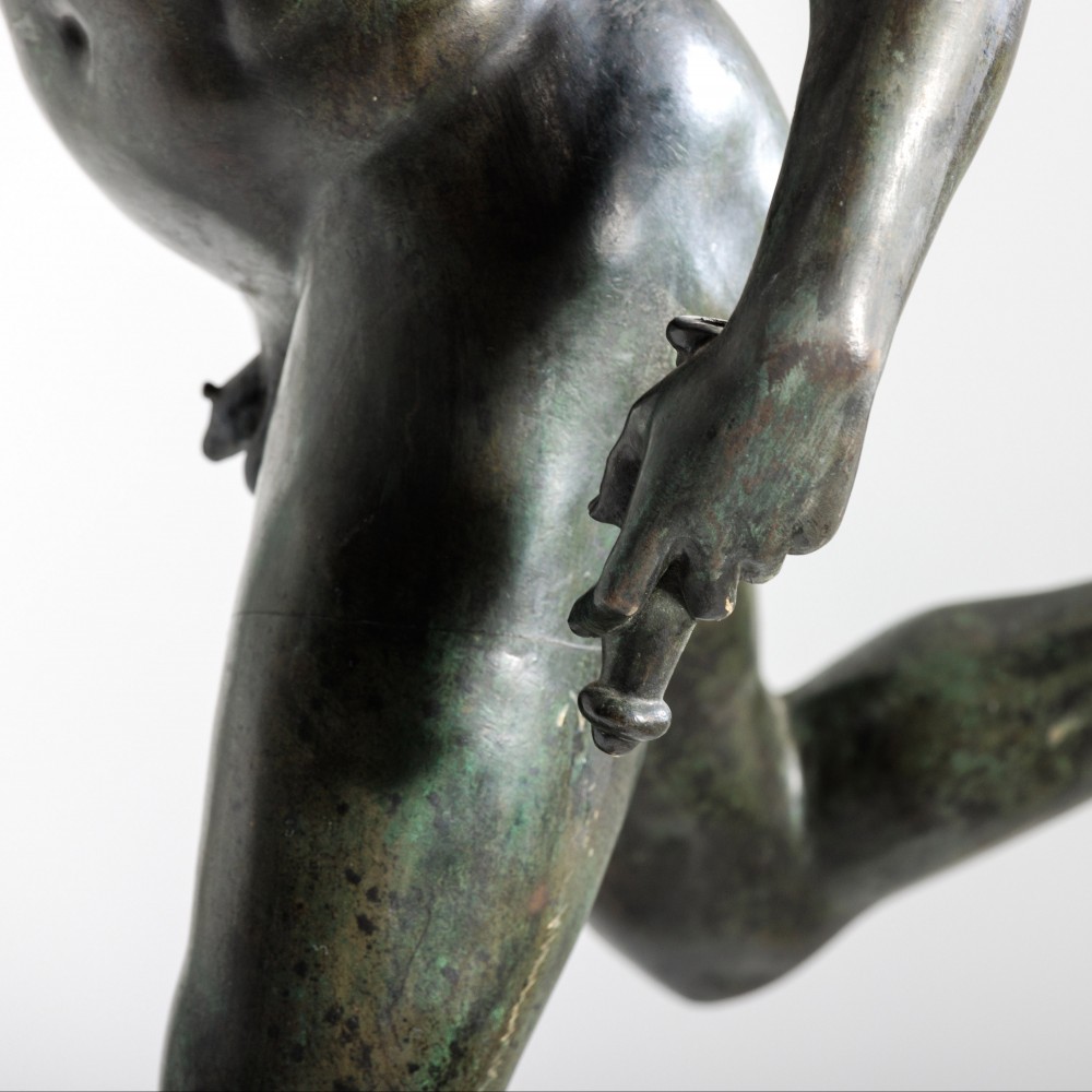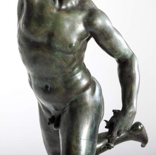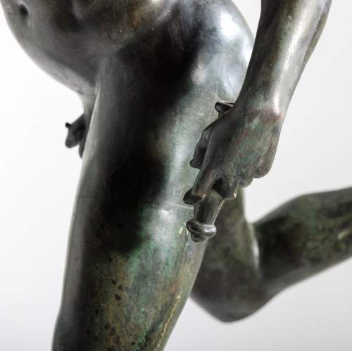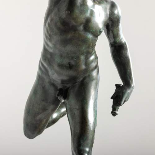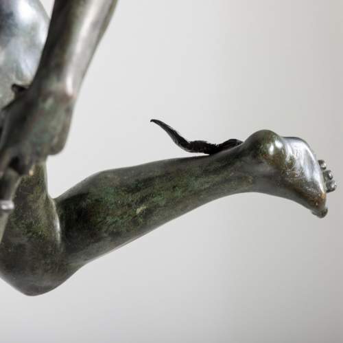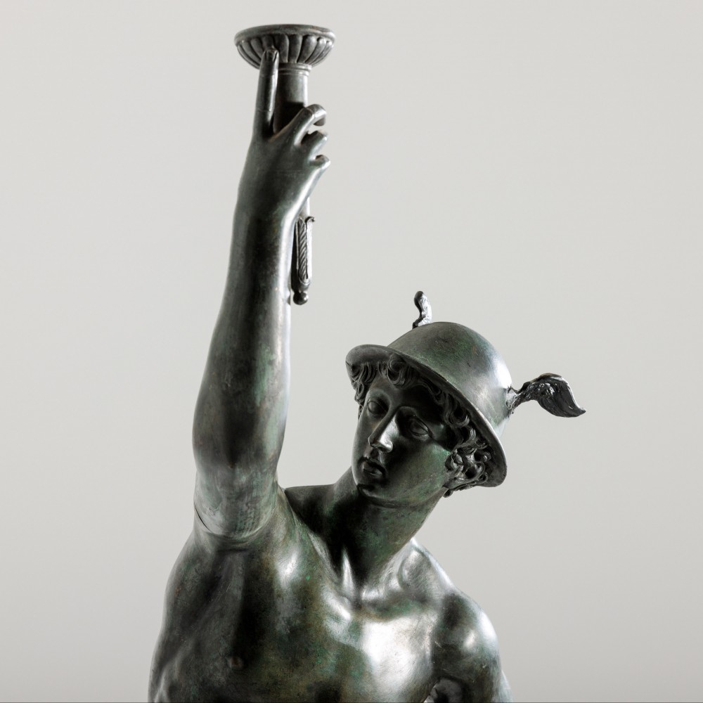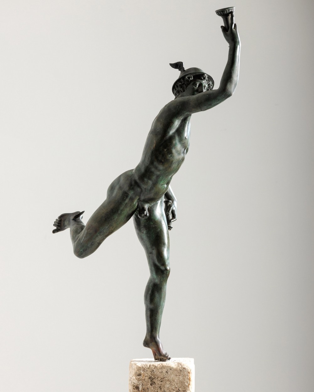 Stock Number: 4575Impressive Late 19th Century Bronze of Mercury on a carved stone plinth An exceptional grand tour bronze figure of Mercury, masterfully captured in a dynamic, mid motion pose and raised on an impressive stone plinth. This striking sculpture embodies the classical elegance and movement associated with the messenger god, making it a commanding statement piece for both interior and garden settings. The figure of Mercury is depicted in dramatic, airborne stance, balancing effortlessly on one leg while the other lifts behind, conveying a remarkable sense of lightness and motion. The finely cast bronze surface displays excellent detail and anatomical precision. Predominantly rich dark patina with wonderful tints of authentic verdigris patintion showing developing a beautiful surface tone that enhances its depth and highlights the sculptural detail. The sculpture is mounted (currently removable) on a substantial, elegant stone plinth, providing stability and enhancing its architectural presence. The weathered texture and natural variation of the stone not only will enhance over time, both also compliment the bronze above. A superb and imposing piece suitable for interior or garden display. Ideal for collectors of classical sculpture or anyone seeking a bold and elegant focal point with enduring historic appeal. Italy Circa 1890. Bronze 100cm High Stone Column 104cm high, Base 25cm x 25cm